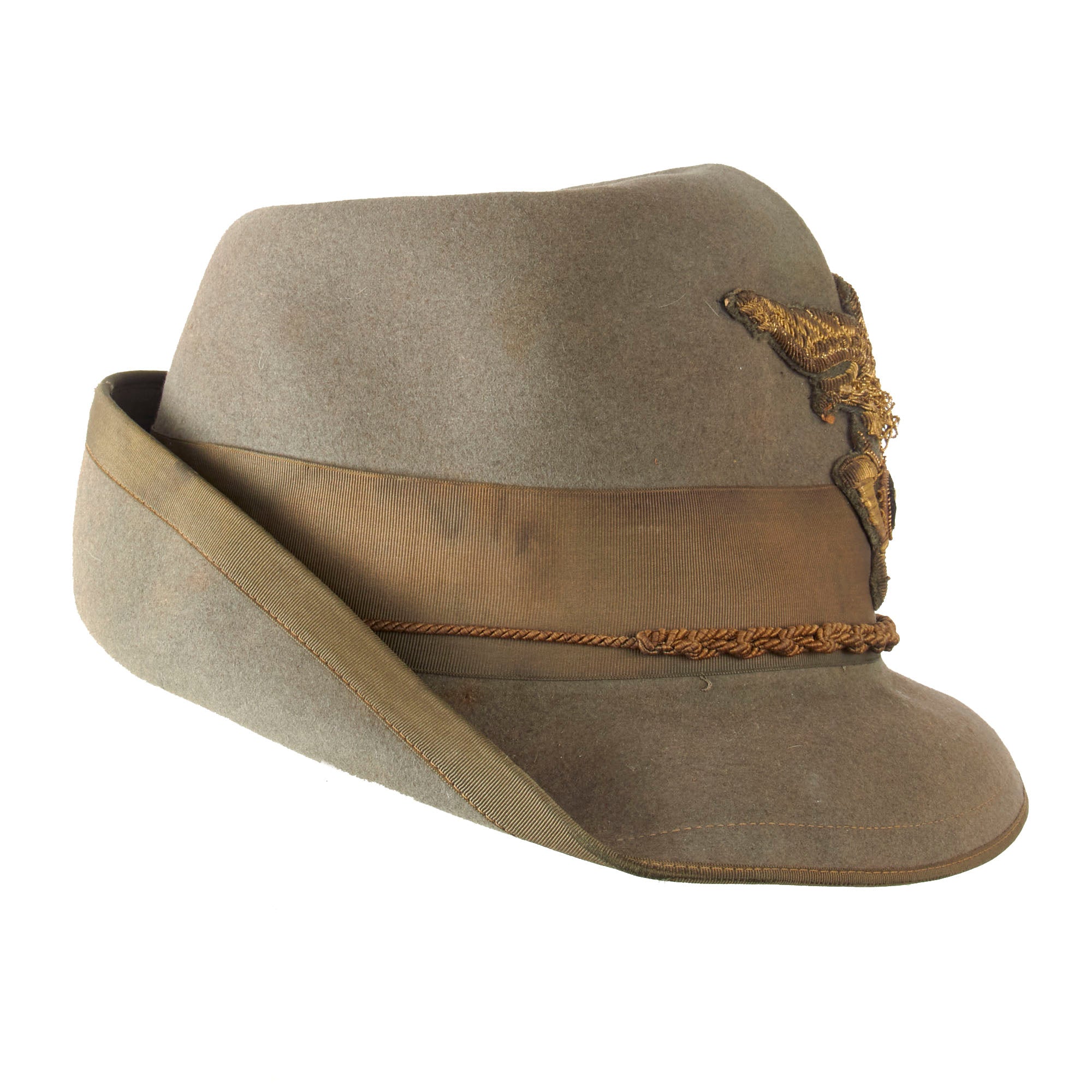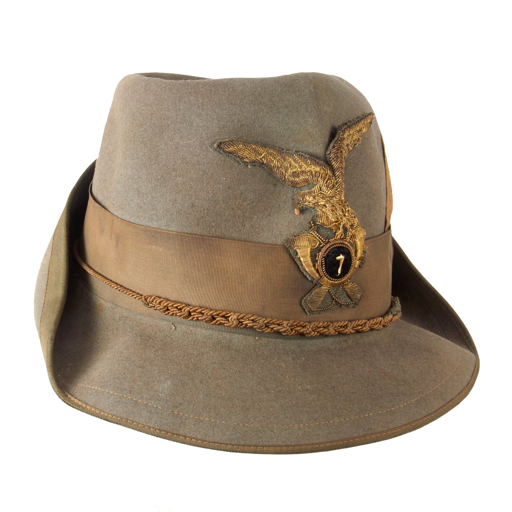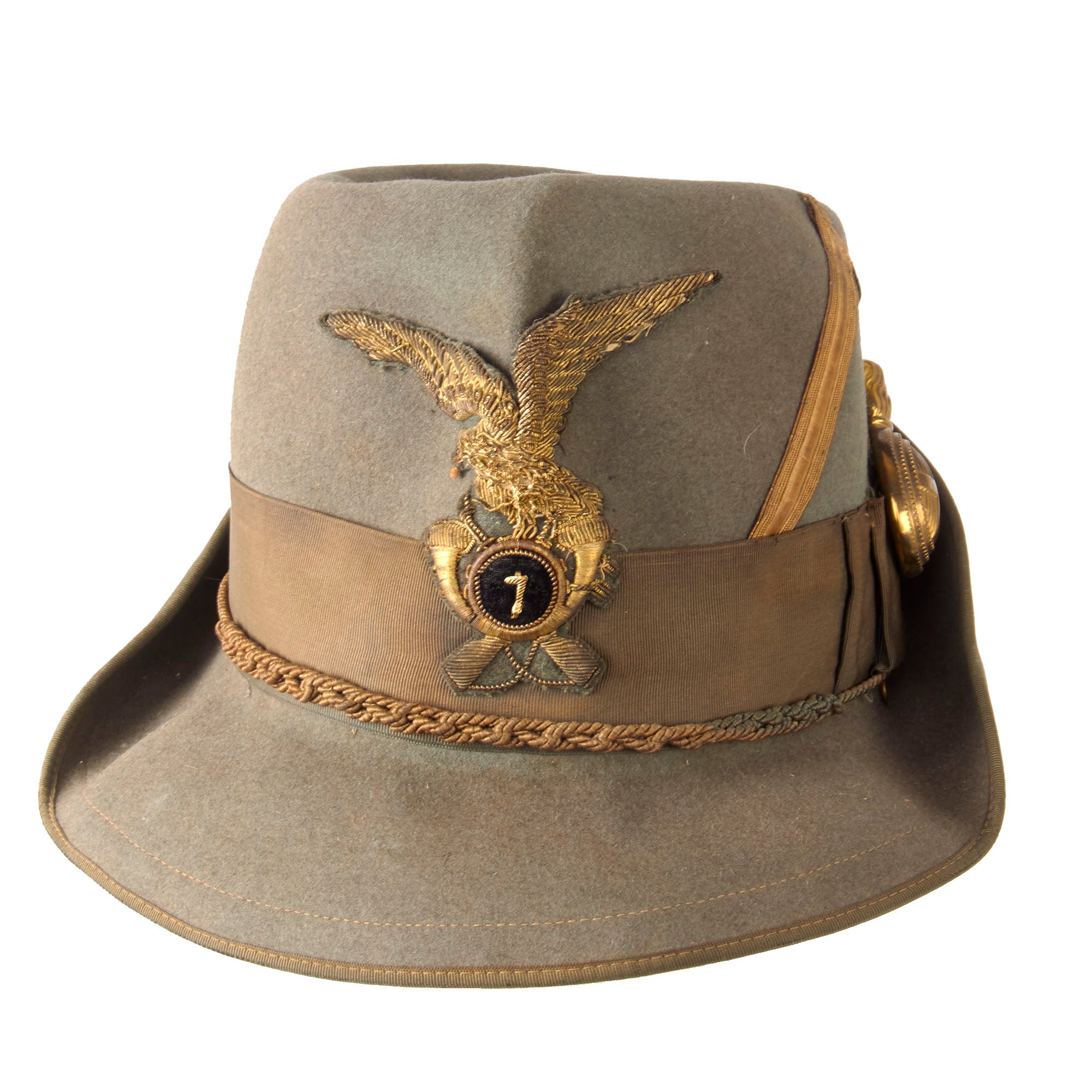 Original Item: Only One Available. This is a very nice felt Robin Hood style hat with a wide ribbed band and rope design around the base. Large relief embroidered gold bullion eagle over a 7 device with a blue-green background. Gold ribbon inverted chevron with an Italian flaming bomb plume holder attached. The interior features a brown leather sweatband with a white fabric liner marked with a pine tree and the brand name alpino. Shows some wear but overall nice condition.