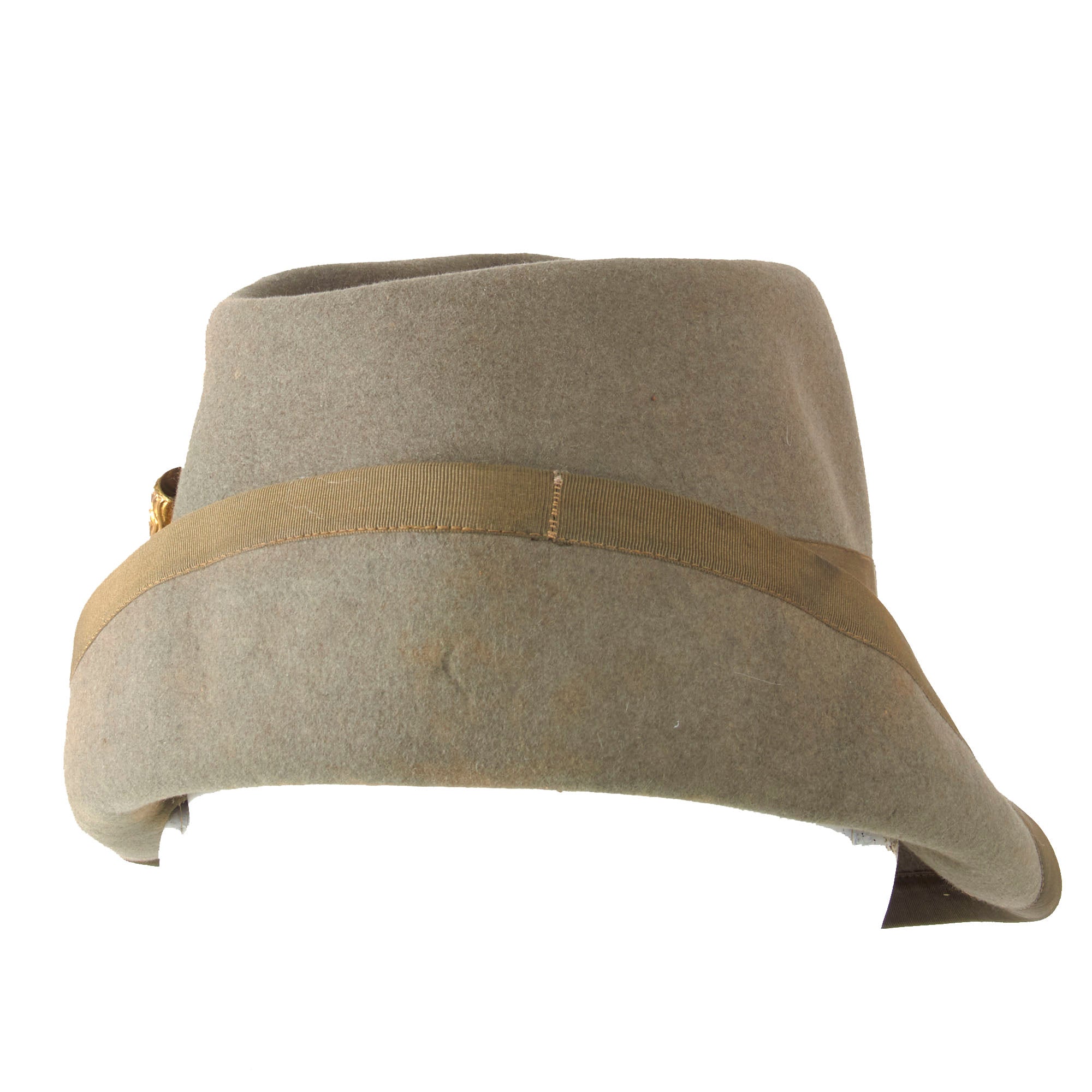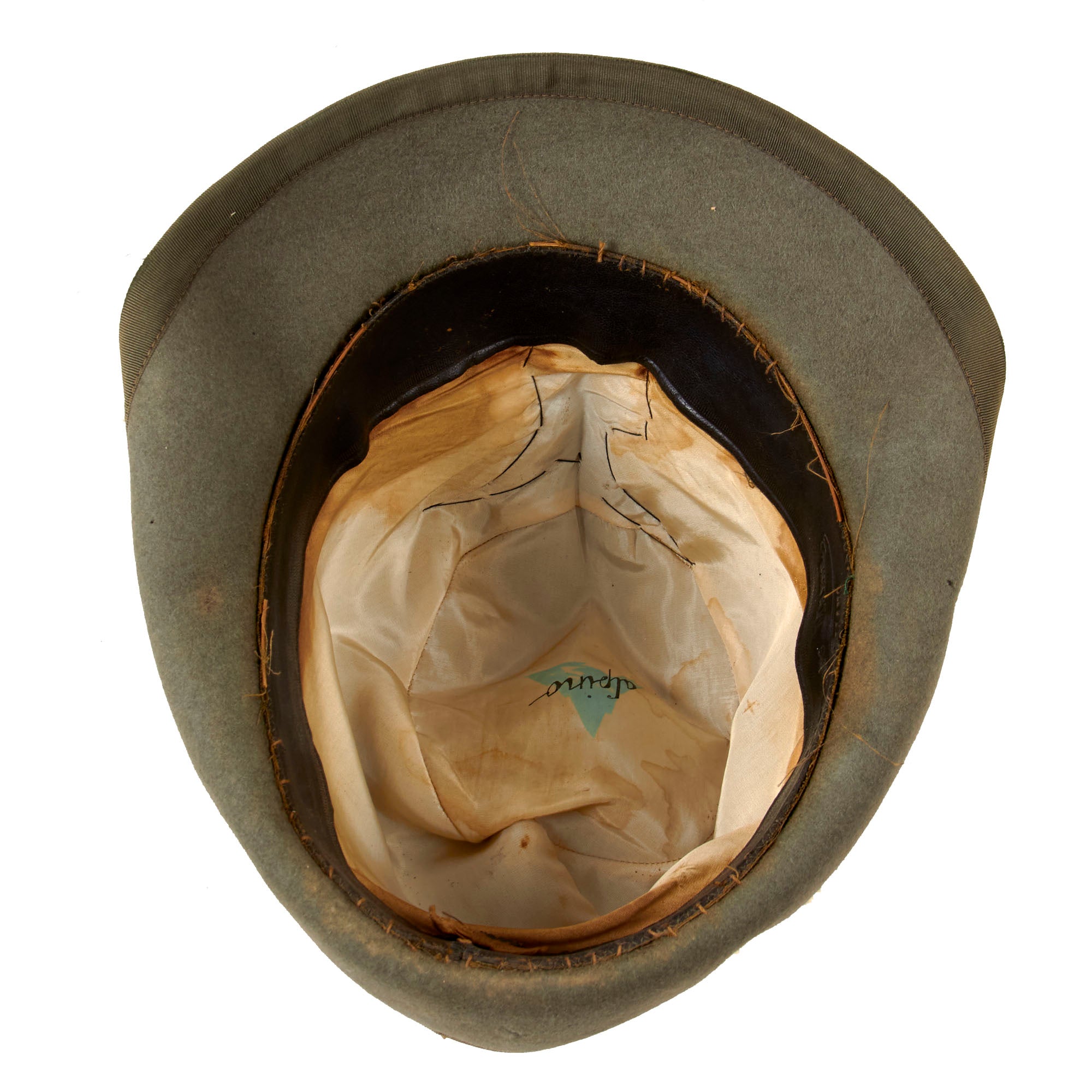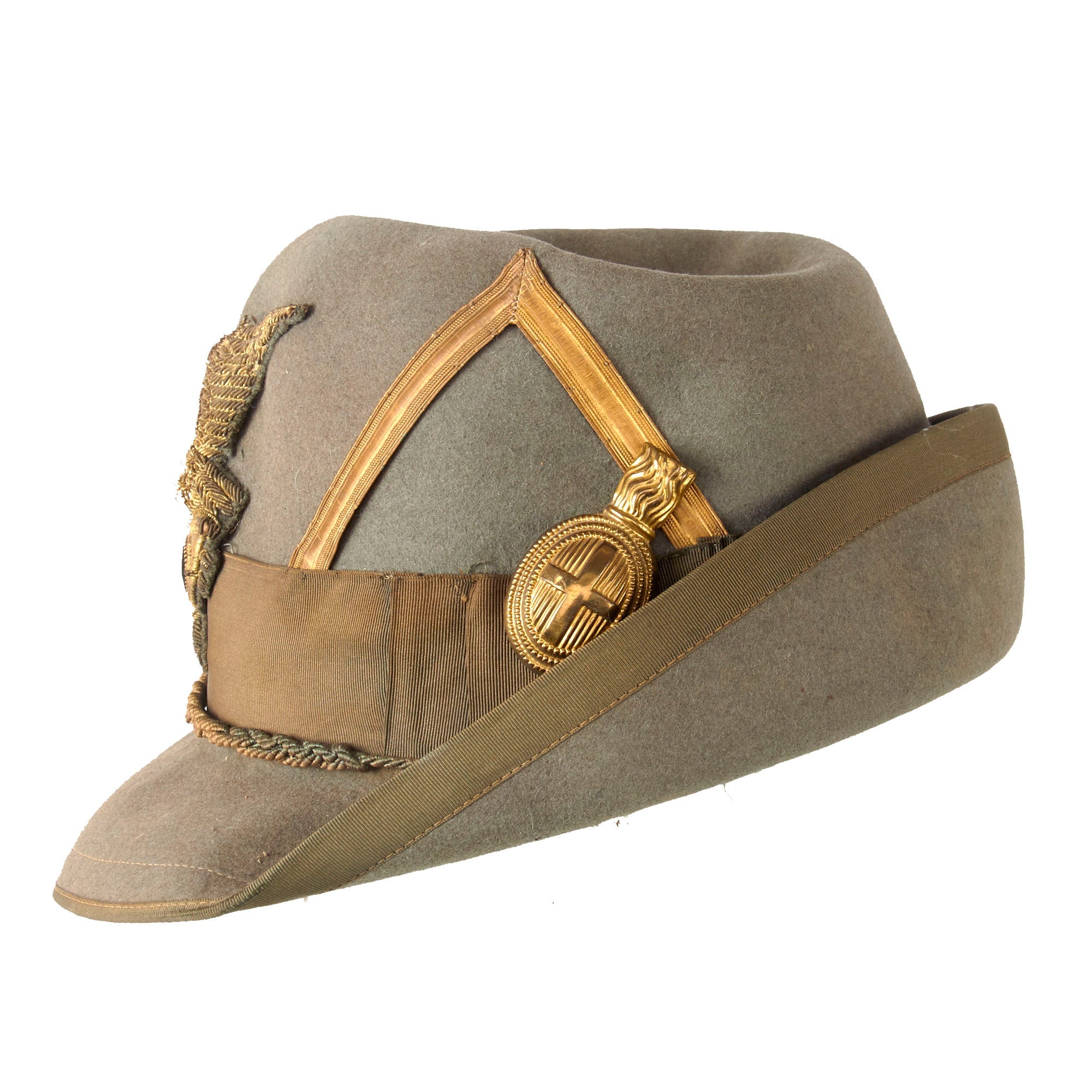 Original Item: Only One Available. This is a very nice felt Robin Hood style hat with a wide ribbed band and rope design around the base. Large relief embroidered gold bullion eagle over a 7 device with a blue-green background. Gold ribbon inverted chevron with an Italian flaming bomb plume holder attached. The interior features a brown leather sweatband with a white fabric liner marked with a pine tree and the brand name alpino. Shows some wear but overall nice condition.
