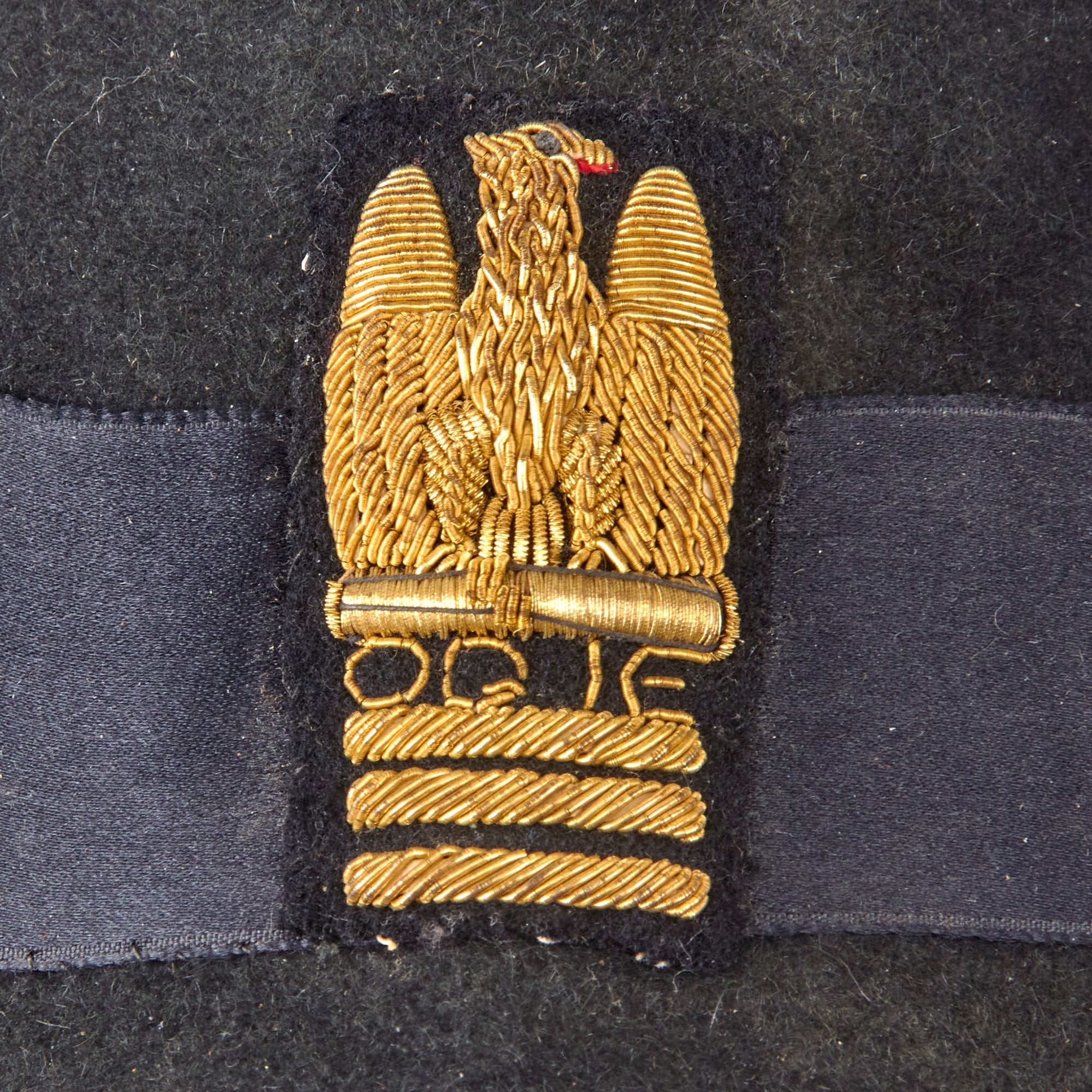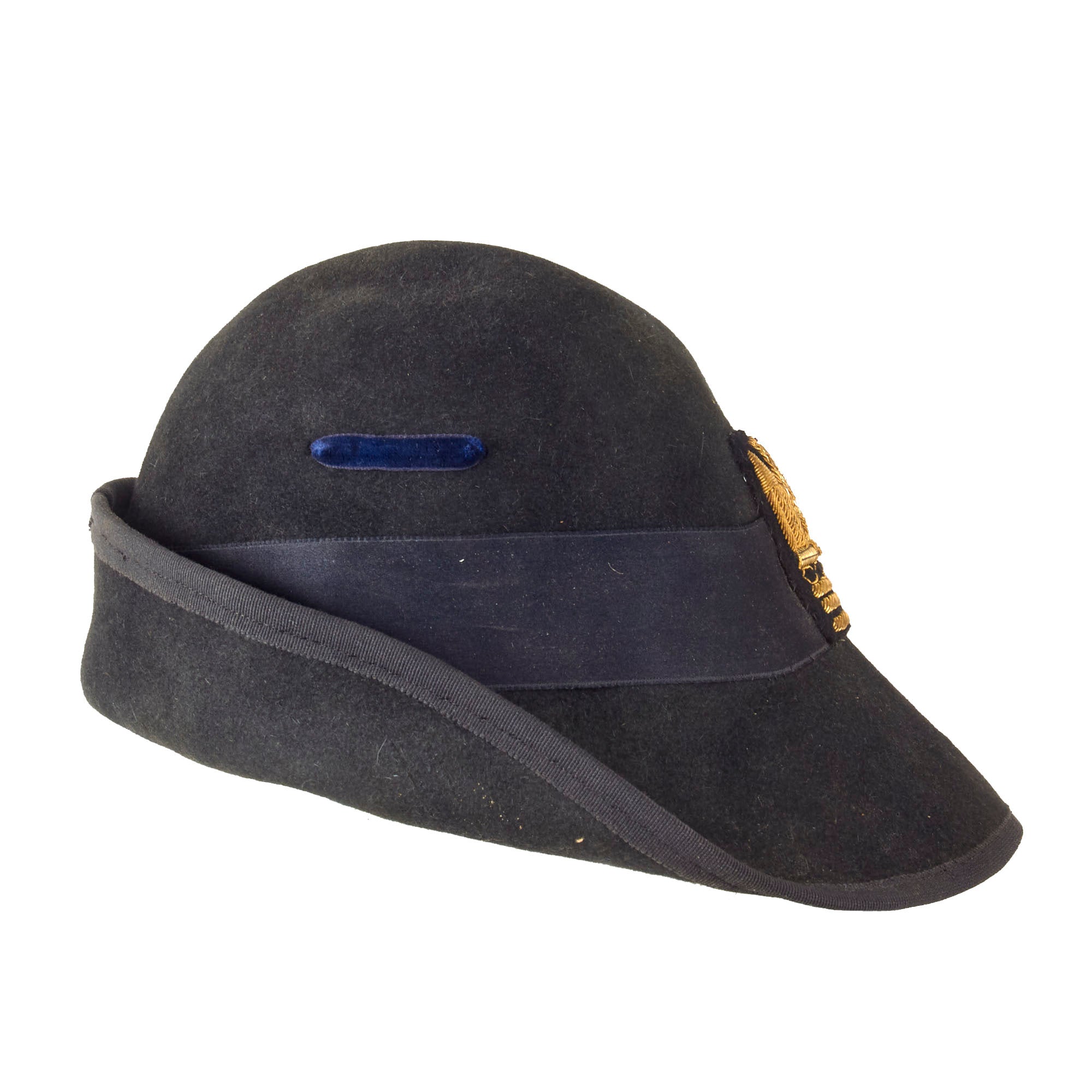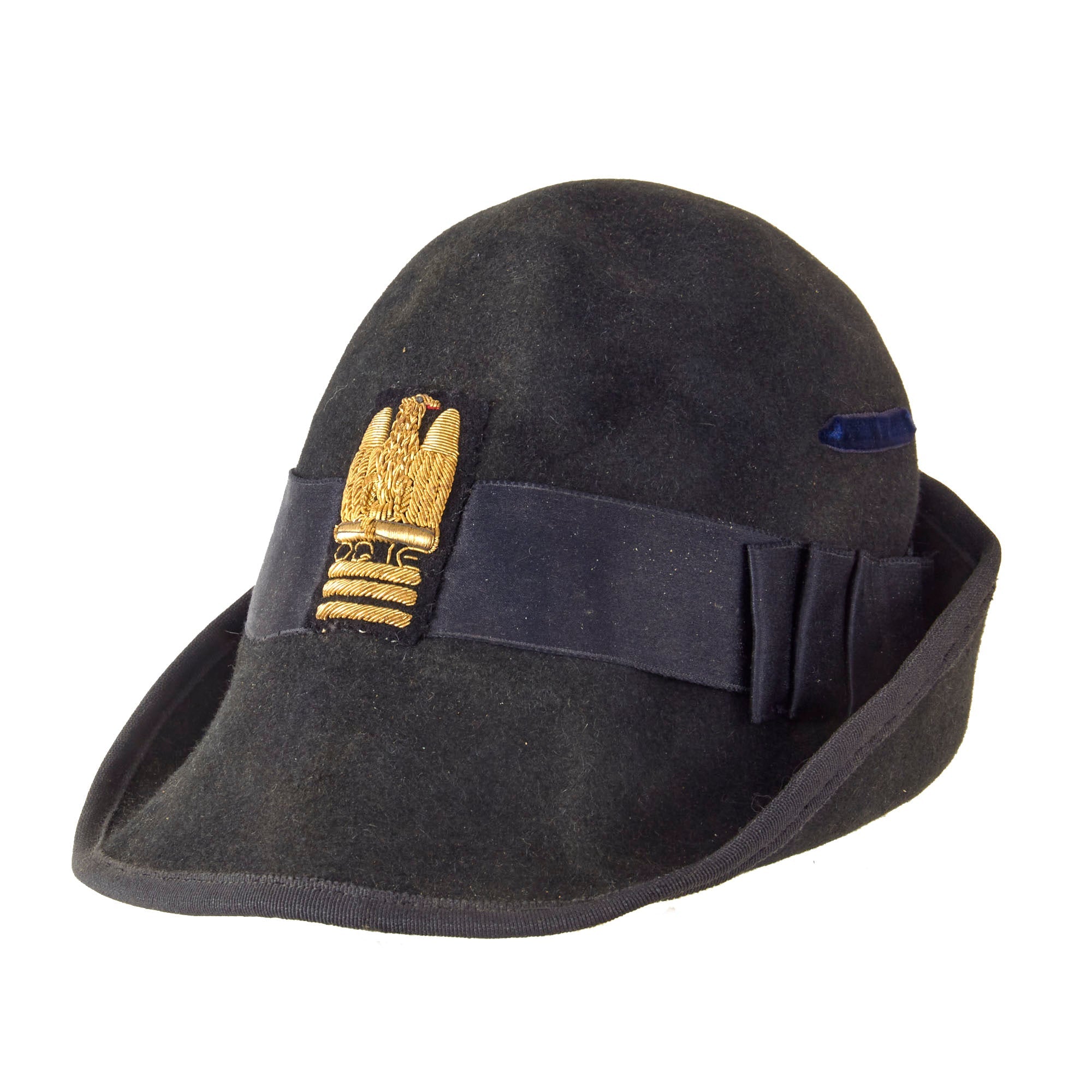 Original Item: Only One Available. Very nice felt Robin Hood style hat with a wide ribbed band and rope design around the base. Large relief embroidered gold bullion eagle with over OQIE(?) and three gold bars. The black construction and eagle style denotes the Fascist MVSN or a connected organization. The interior features no lining, and there are two small blue velvet Shows some wear but overall nice condition. The size is roughly 7.