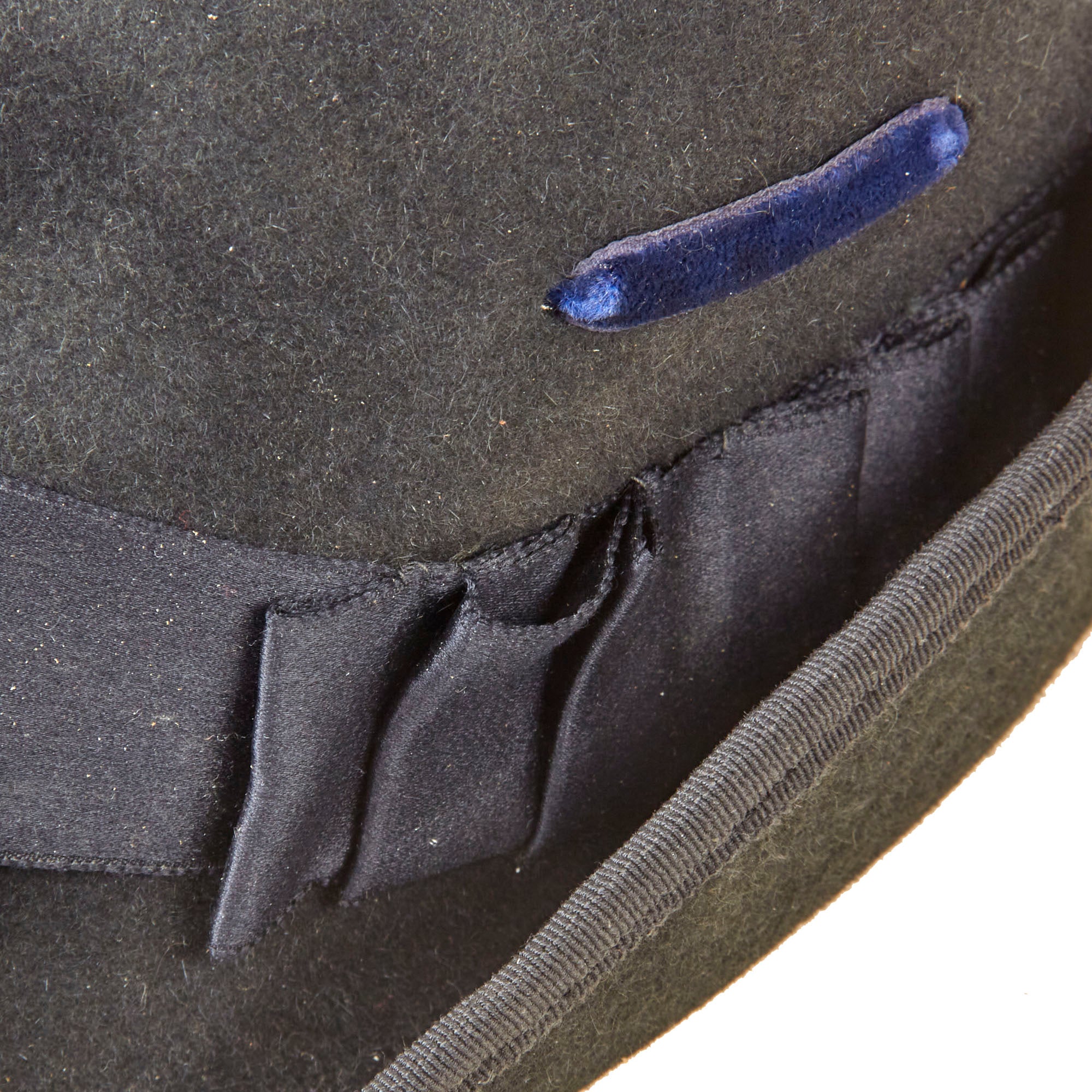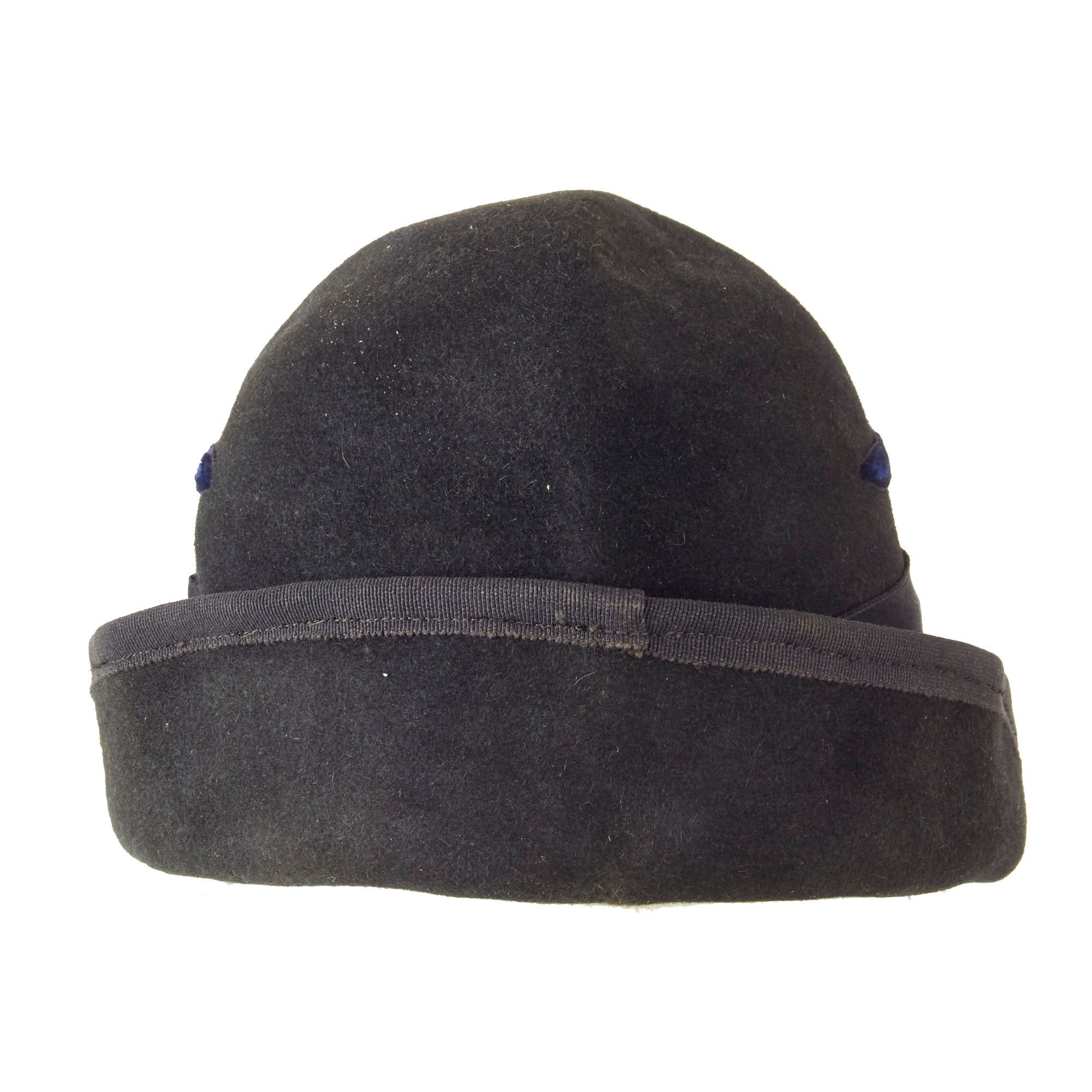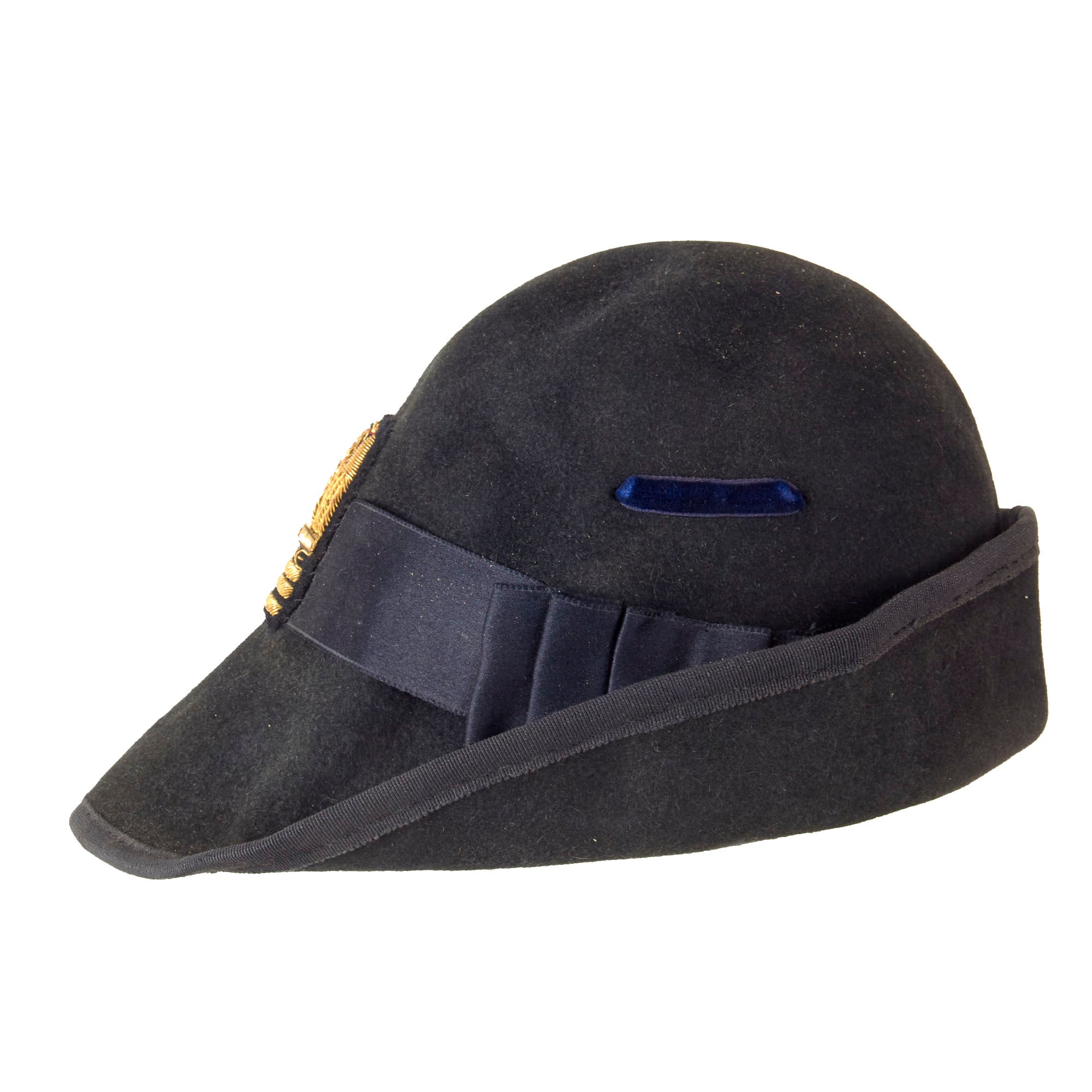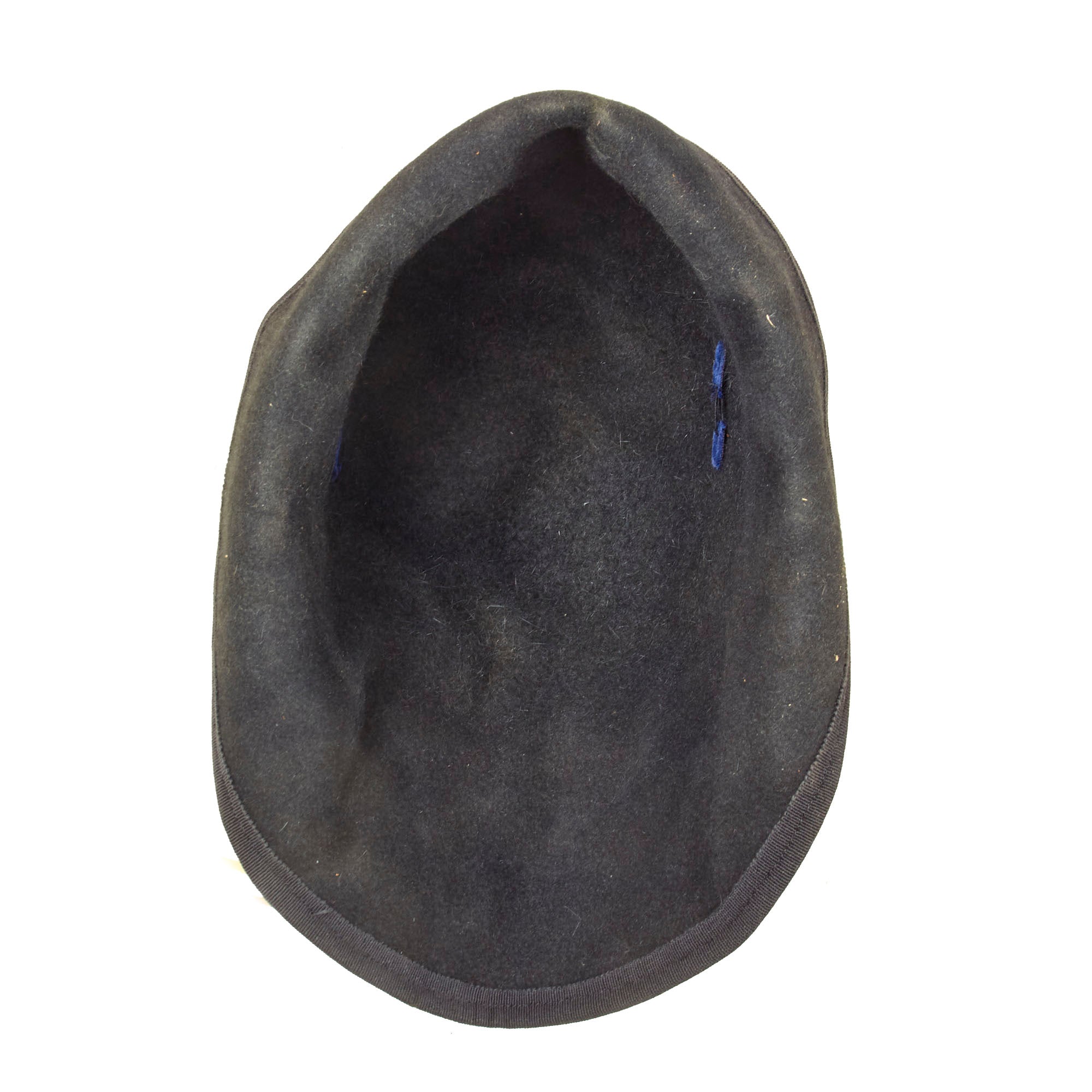 Original Item: Only One Available. Very nice felt Robin Hood style hat with a wide ribbed band and rope design around the base. Large relief embroidered gold bullion eagle with over OQIE(?) and three gold bars. The black construction and eagle style denotes the Fascist MVSN or a connected organization. The interior features no lining, and there are two small blue velvet Shows some wear but overall nice condition. The size is roughly 7.