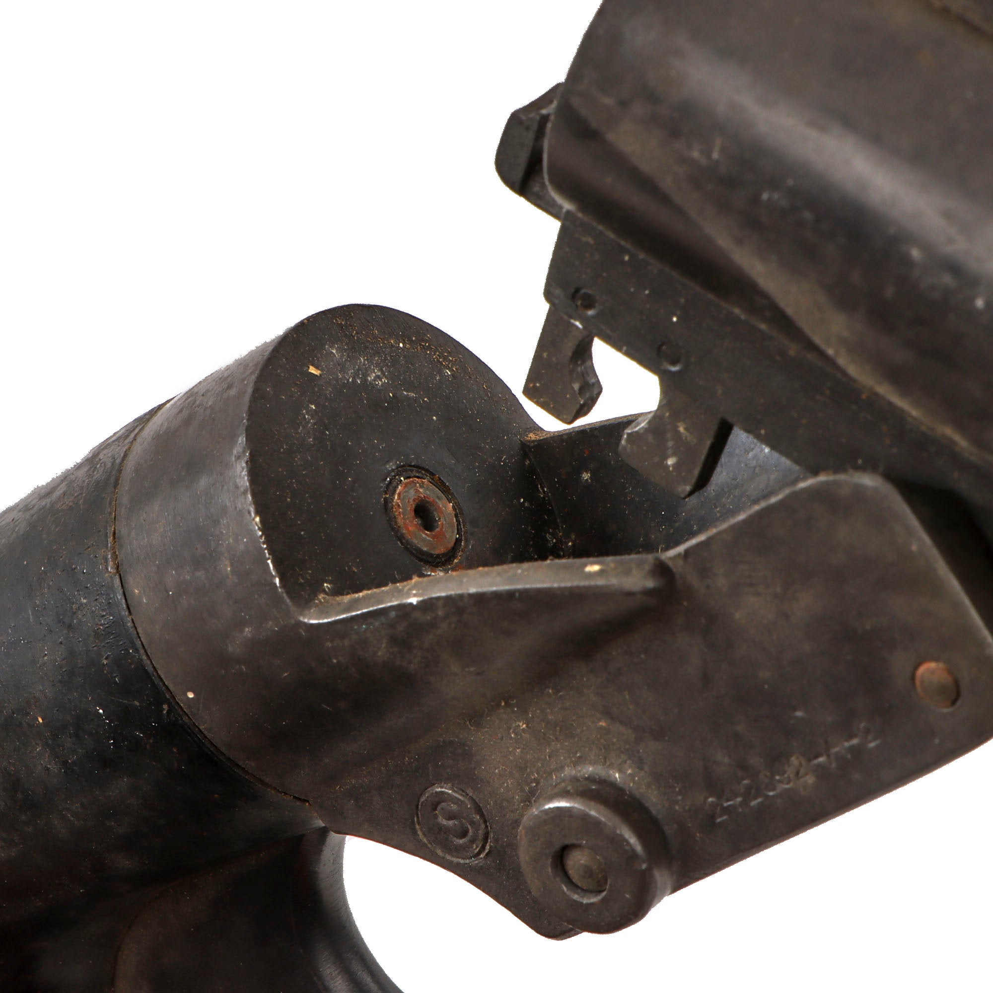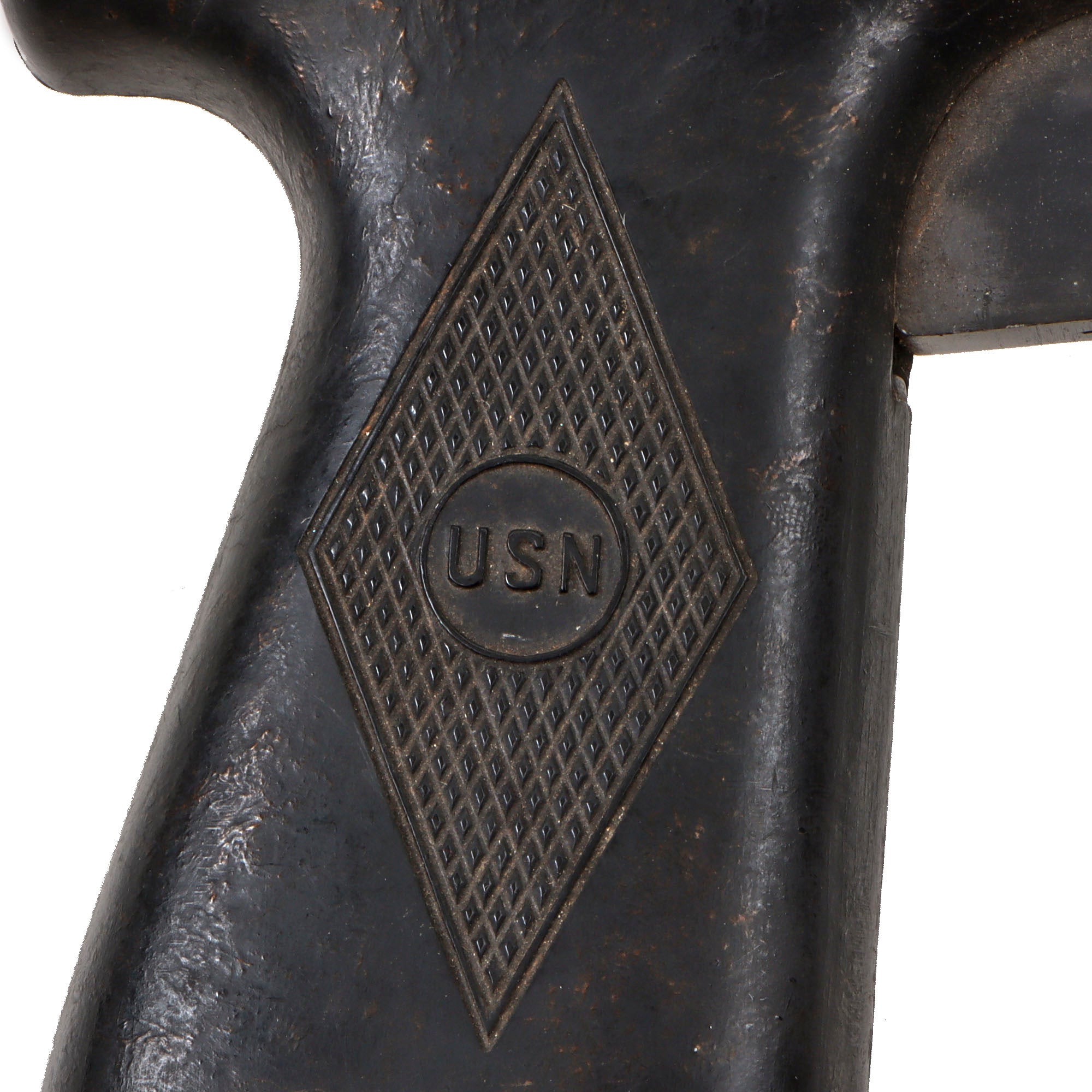 The grips are marked USN on both sides, which is uncommon, as often the marking was removed when being sold out of Navy storage. The barrel, frame, and grip are all marked with model number 242692-A-2, each with a different suffix. The frame also has the "Circled S" Sedgley logo.