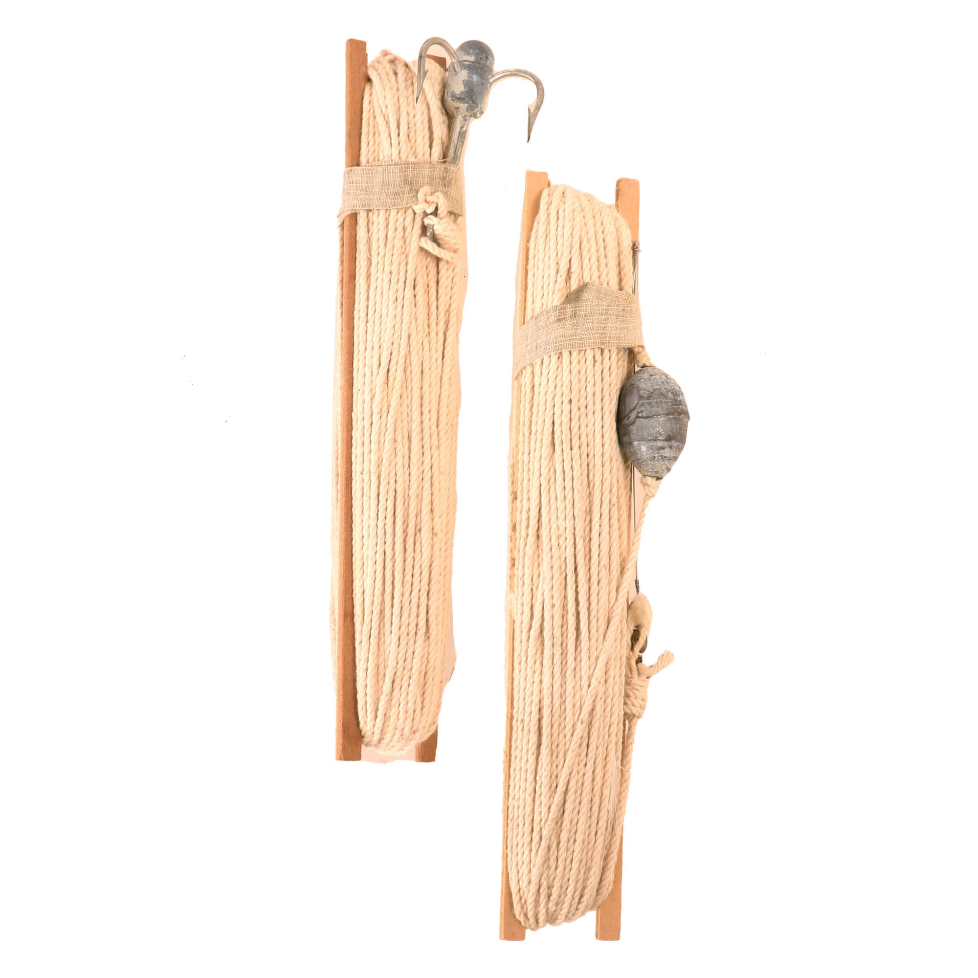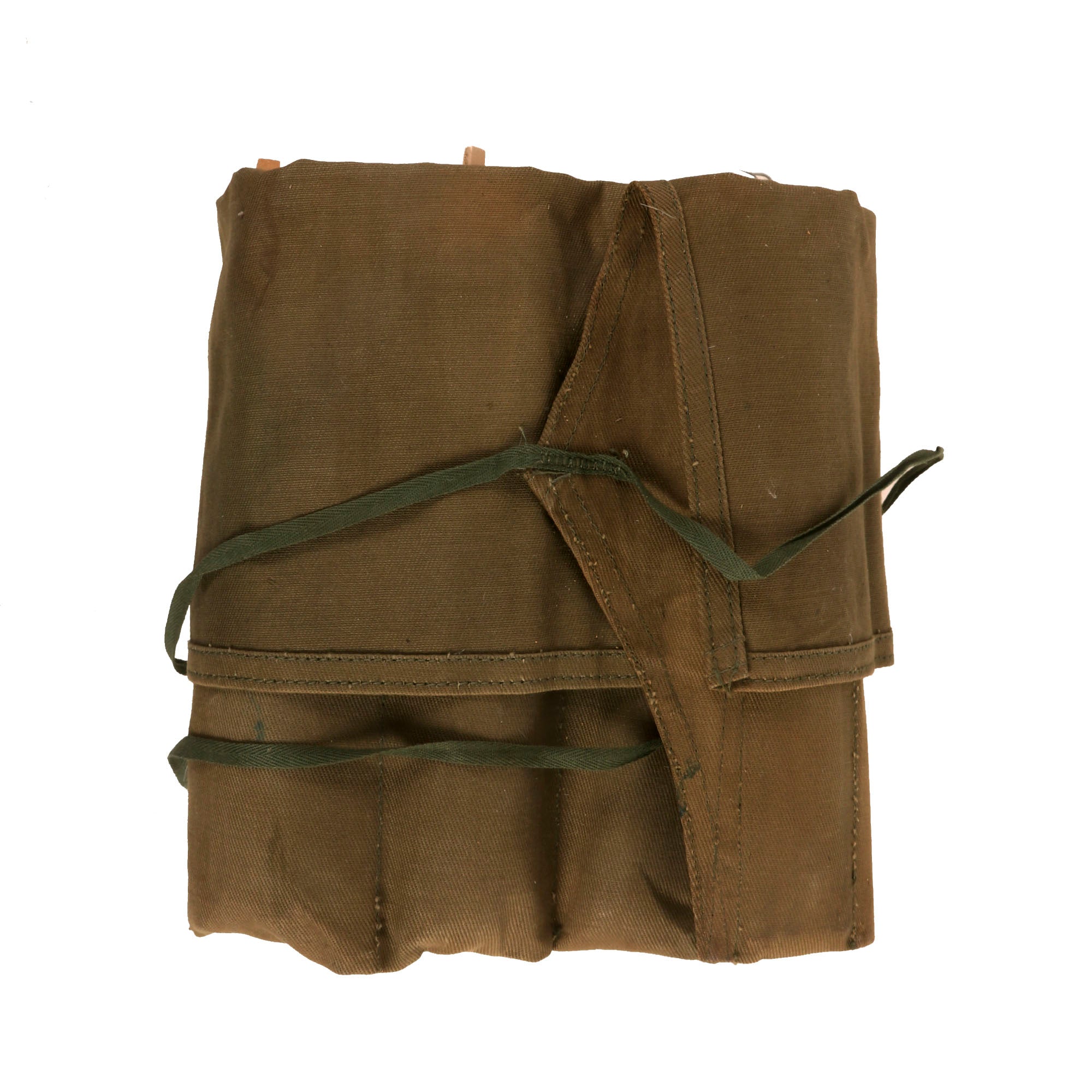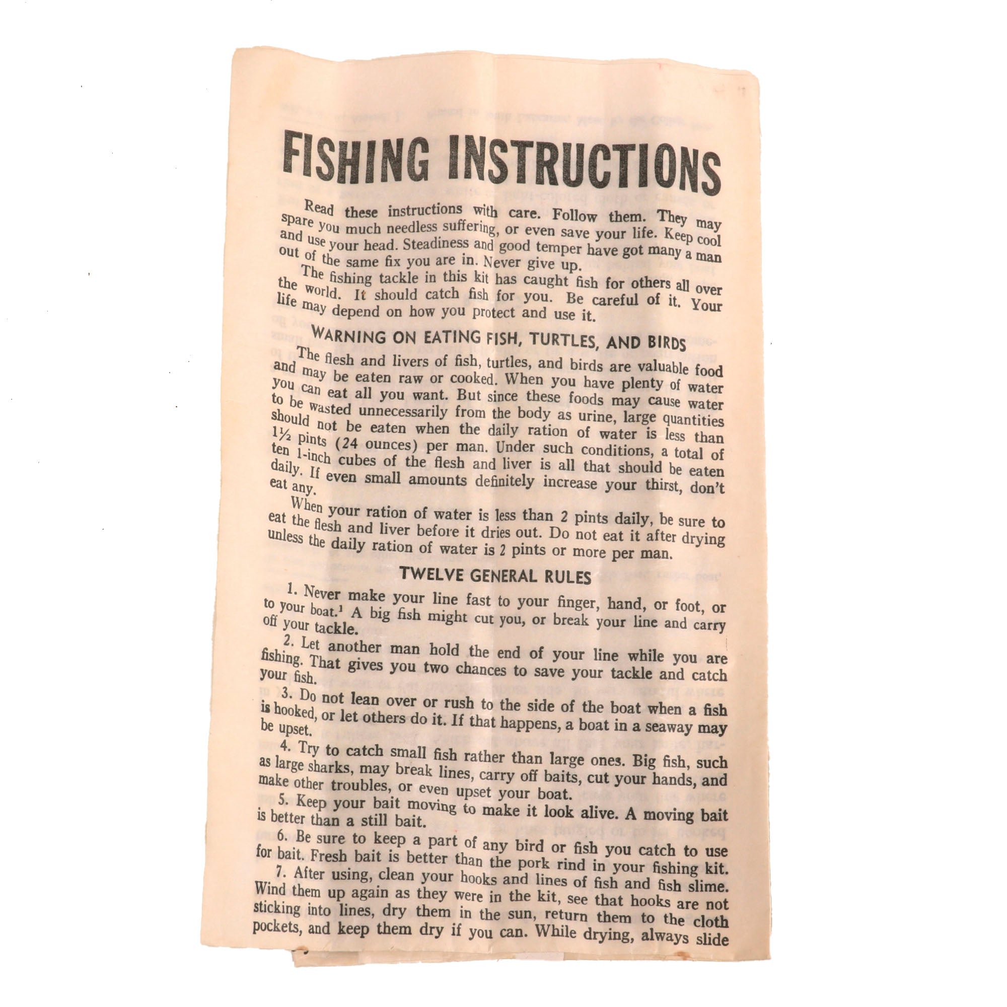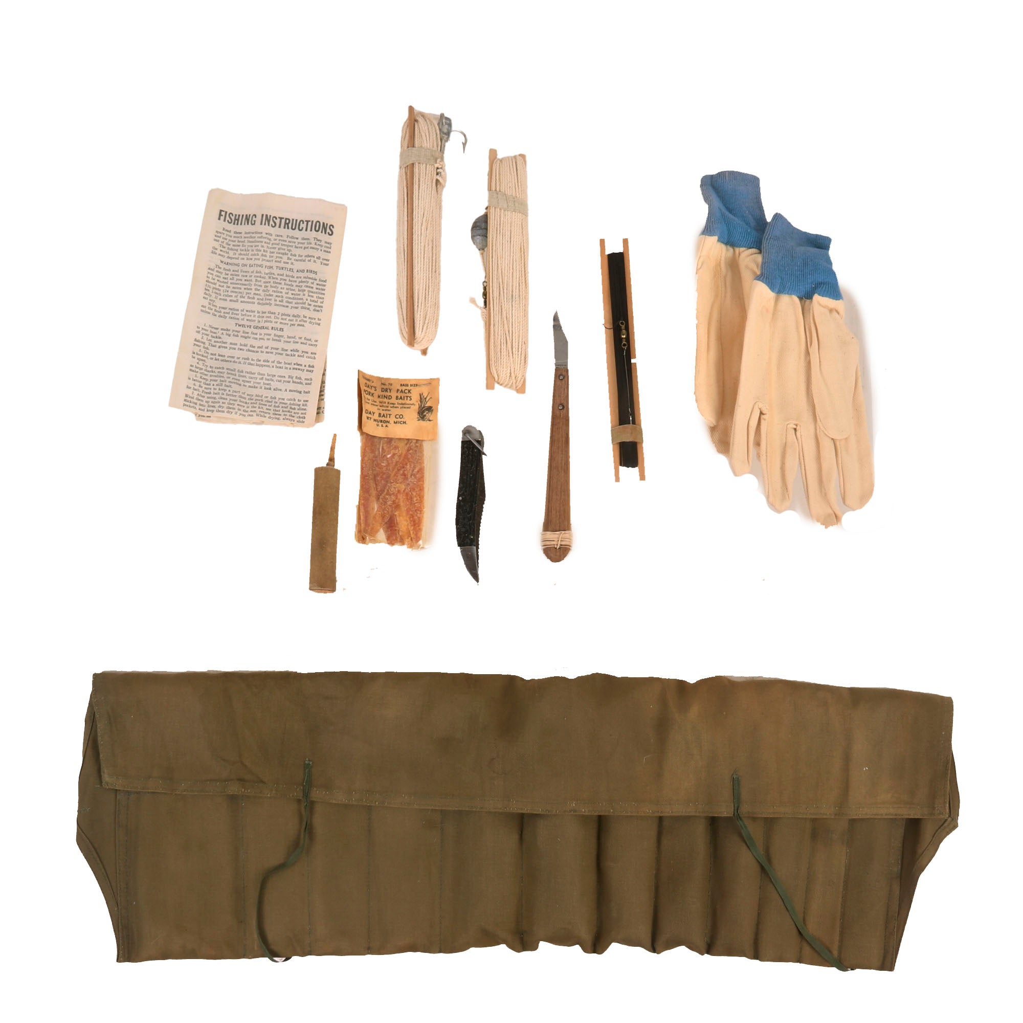 Original Items: Only One Available. This is a very nice U.S. Navy WWII Emergency Fishing Kit, used by servicemen, presumably after they had to abandon ship for some reason. In the sea, their only source of food would be rations on hand, and fish, so to survive an extended time at sea, fishing was the only option for food, as well as the water the fish contained. The kit is a nice OD Green HBT roll, containing various fishing hooks, lures, and lines. There is also some original dehydrated bait, as well as two sets of instructions on how to use the kit.