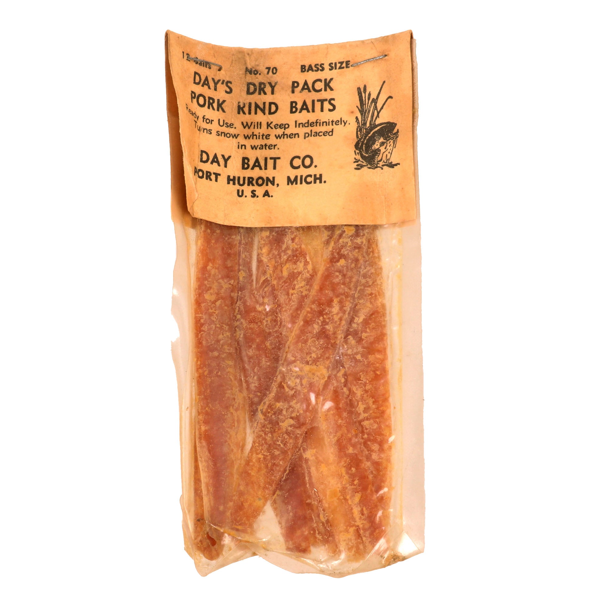 The roll is not marked anywhere we could find, and has 12 different compartments. The most notable piece is the “Day’s Dry Pack Pork Rind Baits” by the Dry Bait Co. of Port Huron, Michigan. The pack is sealed and is really interesting.