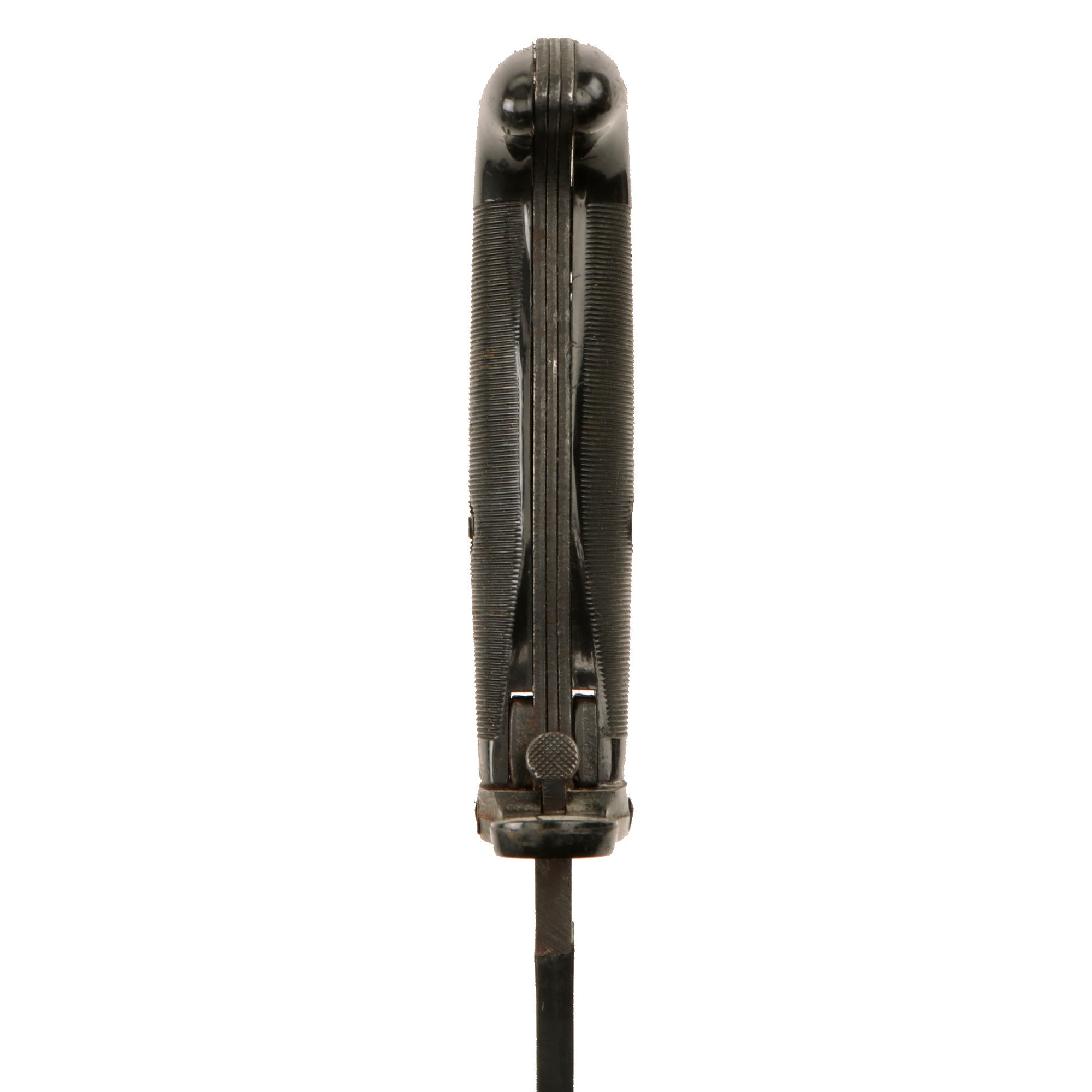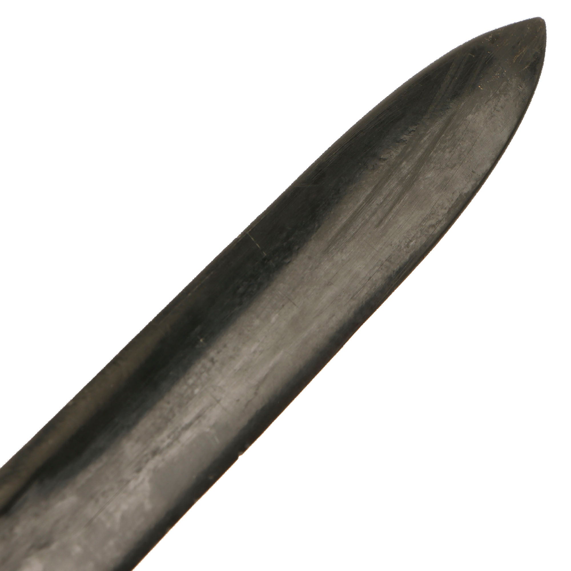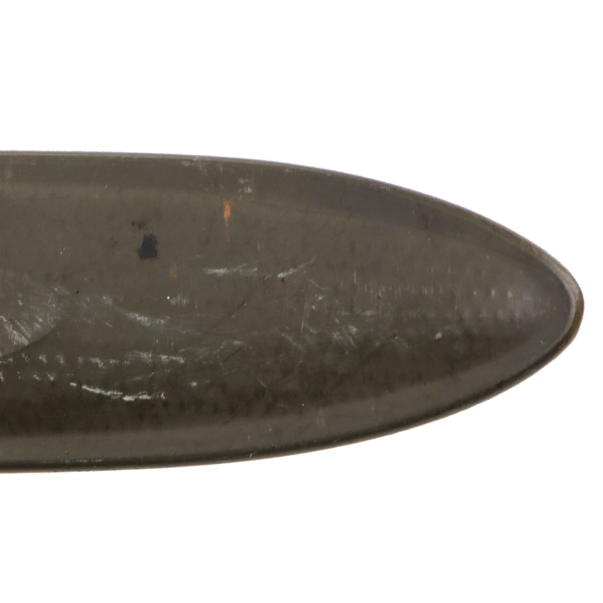 The bayonet design was reverse-engineered from the M1905 bayonet, and is made entirely of sheet steel and hard, black Bakelite plastic. The bayonet is fragile and could not stand up to rigorous use. Most examples encountered today exhibit breakage, however this one is fully intact, with just a slight bend to the blade. The blade ricasso is marked: