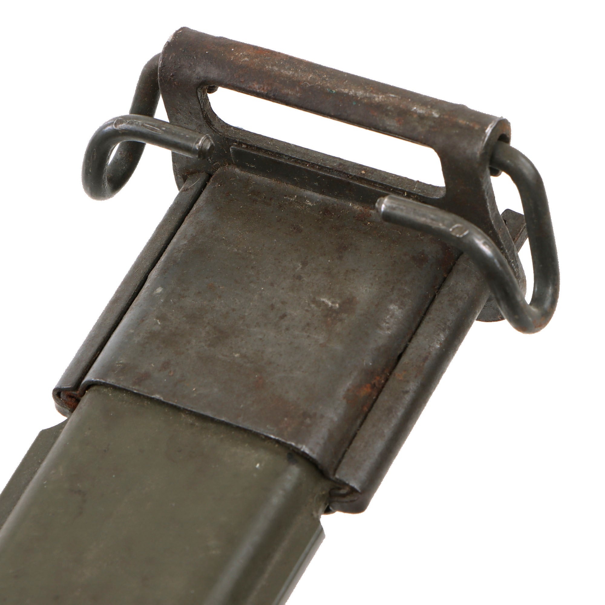 The original USN Mk1 scabbard is marked USN / MK 1 on the parkerized steel throat, and is in good condition. These scabbards are identical to the US Army M3 scabbard, except for the markings. The B N marking on the underside of the metal throat lip indicates manufacture by Beckwith Manufacturing, who produced a variety of thermoplastic impregnated cotton fabric scabbards during the war. The N is for New England Pressed Steel, who made the steel throats under contract with Beckwith. The parkerized finish on the throat is worn with some corrosion. The scabbard body has no cracks or major chips, with some nicks along the edge.