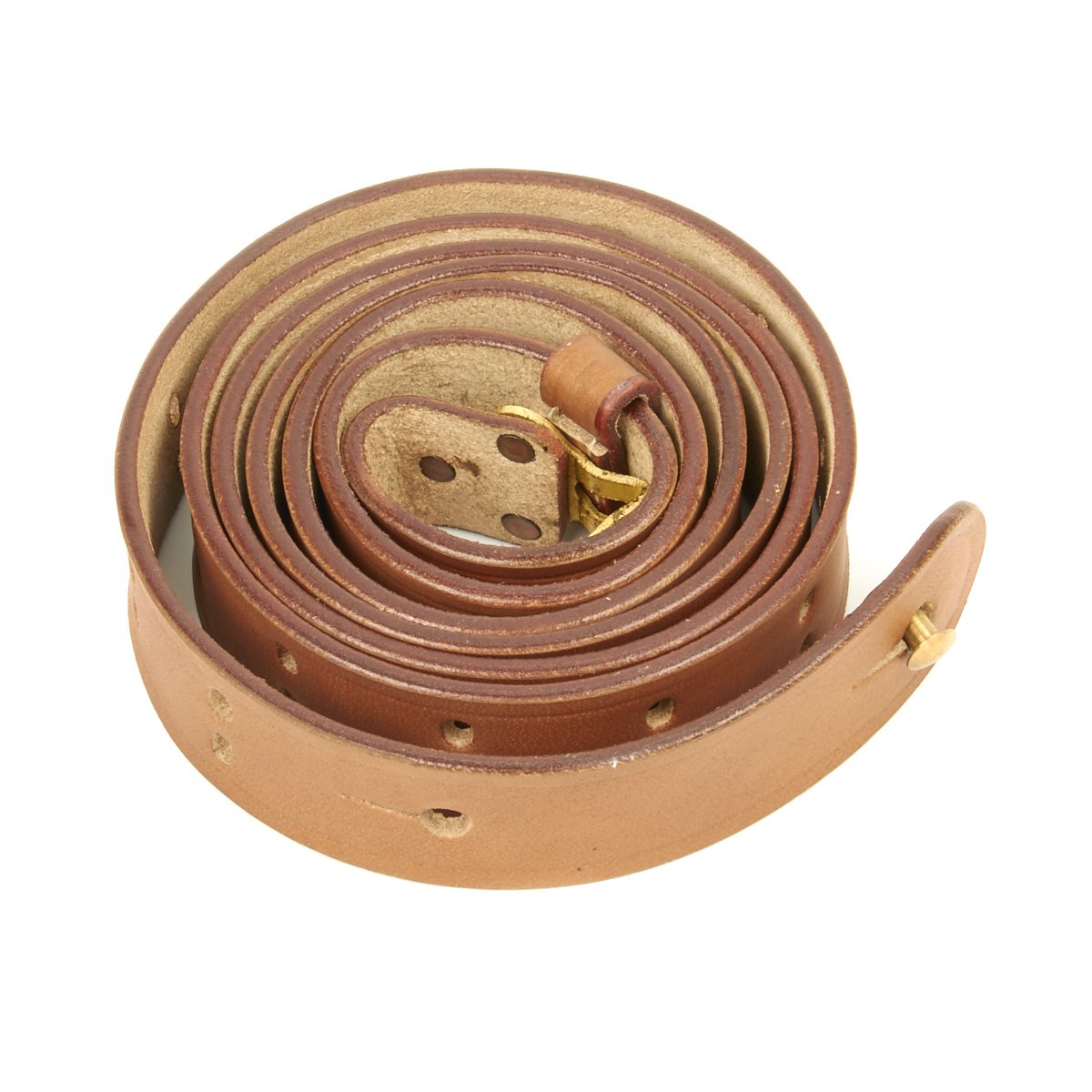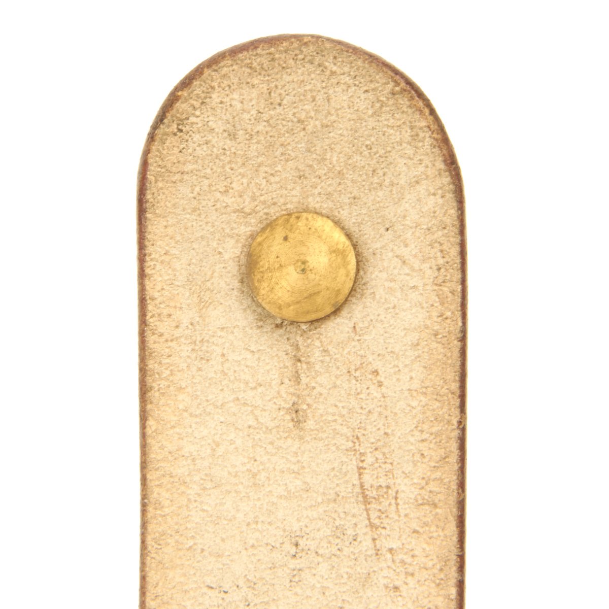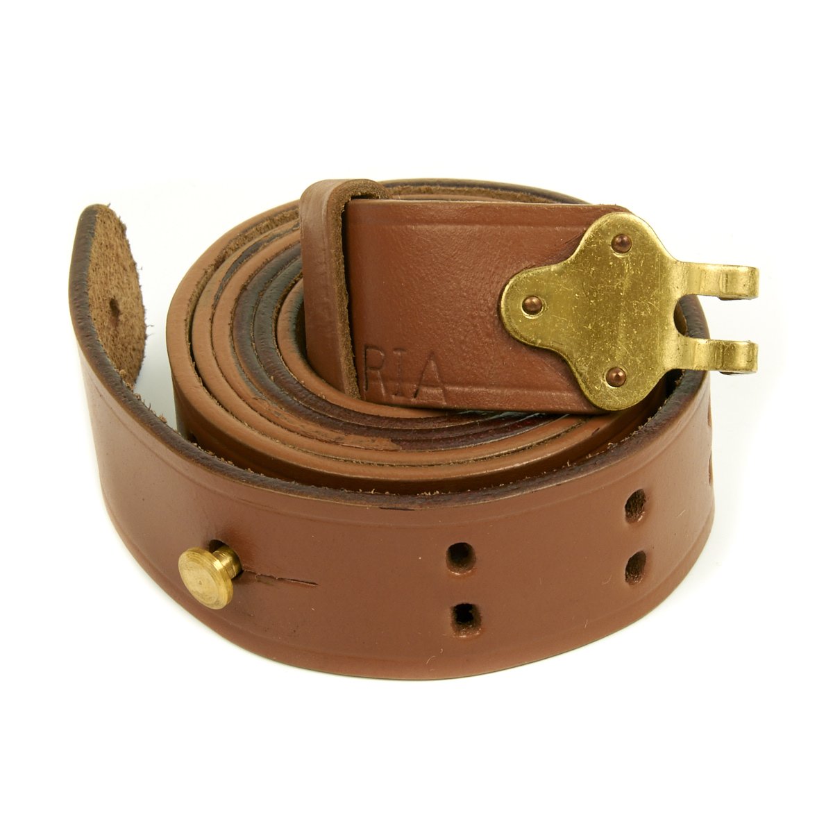 New Made Item: U.S. model 1887 KRAG and SPRINGFIELD TRAPDOOR rifle top-grain leather sling with all brass fittings, copper rivets, and a single keeper. This is an exact copy of an original sling in the IMA collection. Features high quality construction and is stamped "RIA" (Rock Island Arsenal) for added authenticity.