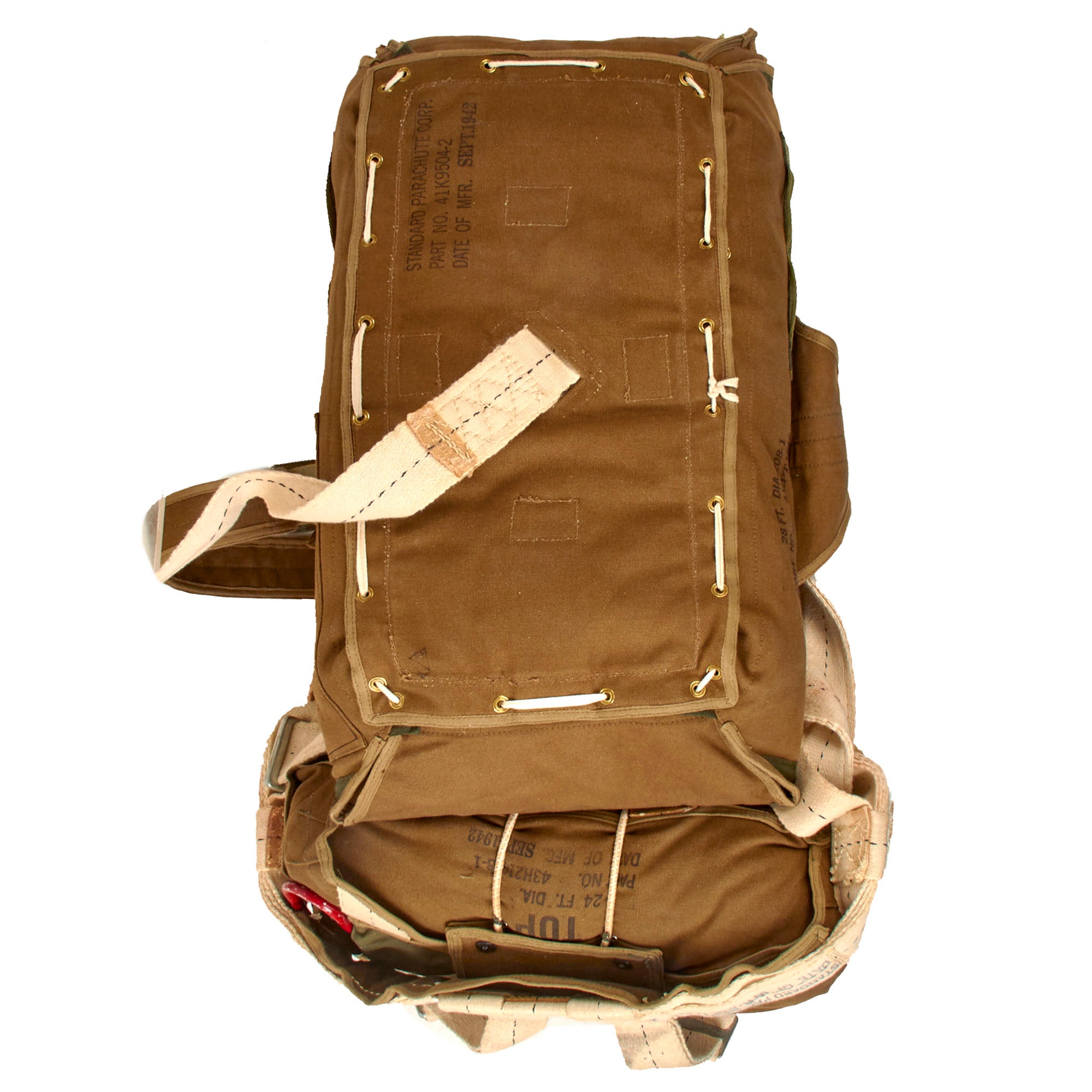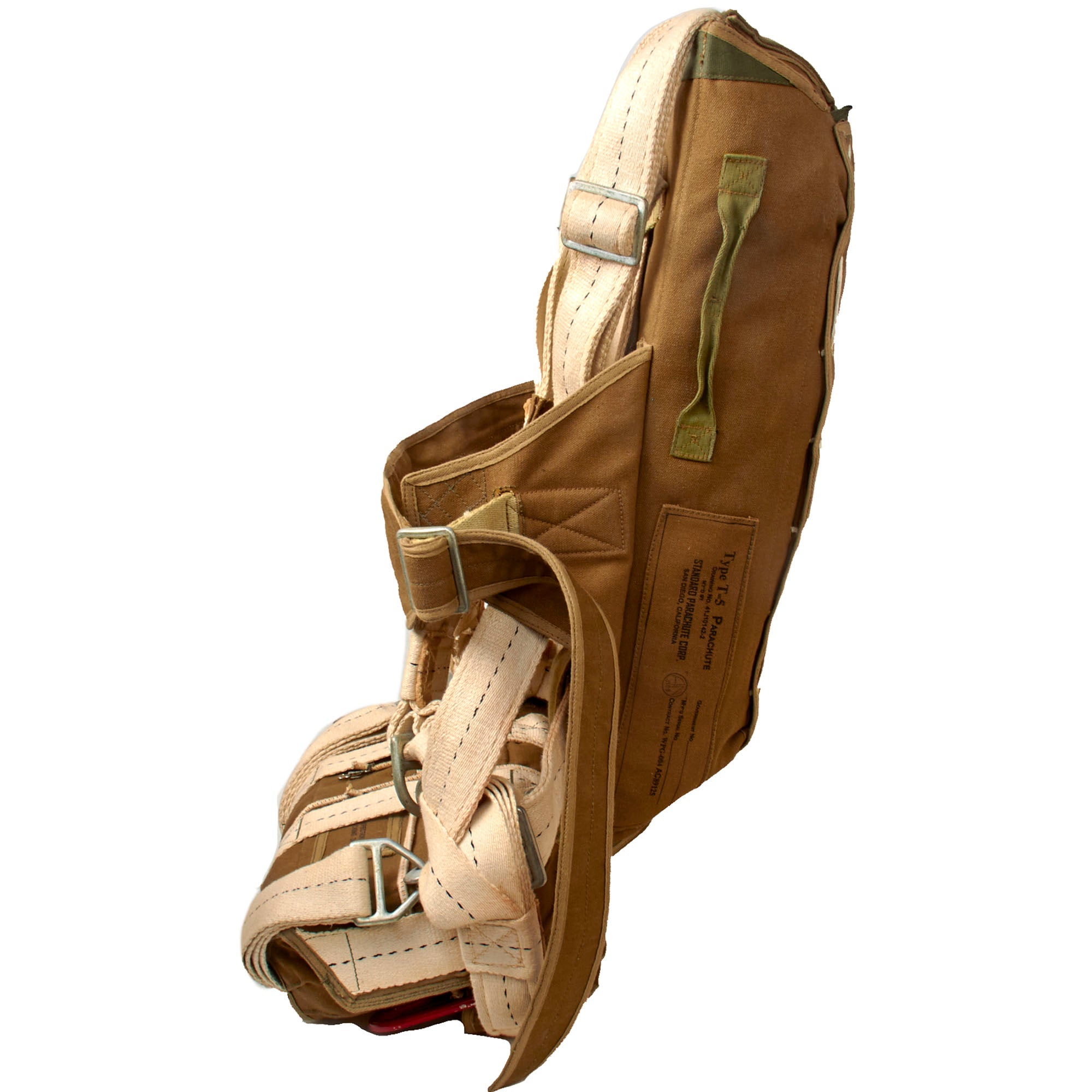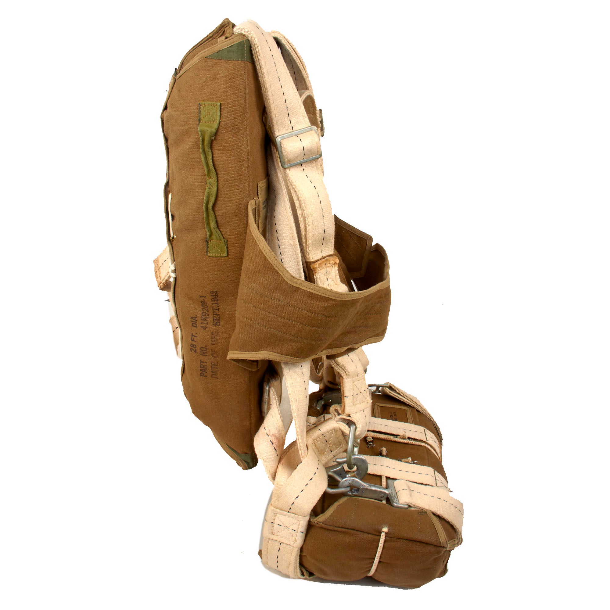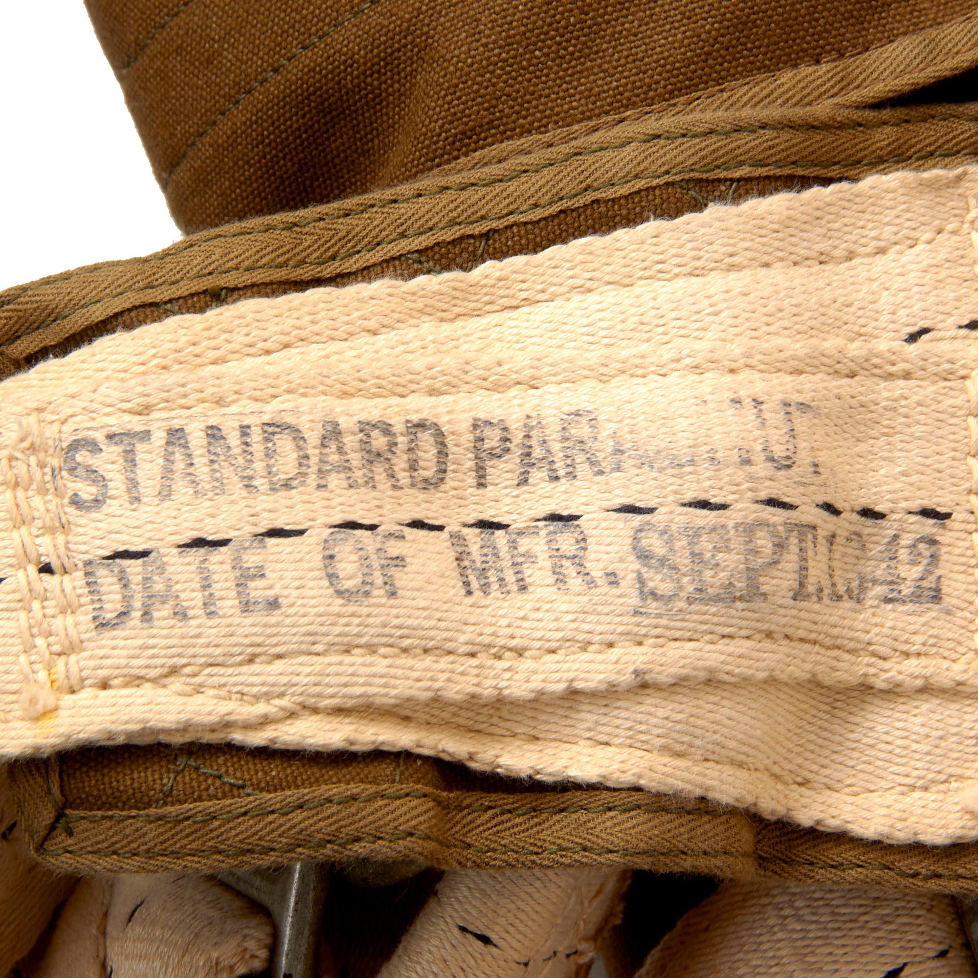 This reproduction set comes with a main canopy and reserve canopy. The main parachute does not bear any serial number, but all are marked to STANDARD PARACHUTE CORP with a "Manufacture Date” of September 1942. This set is accurately made with high quality materials, clothing and metal accessories are all high grade. From what we can tell there is no extensive damage or wear. This is a display reproduction and we do not recommend using it as a lifesaving or recreational device.