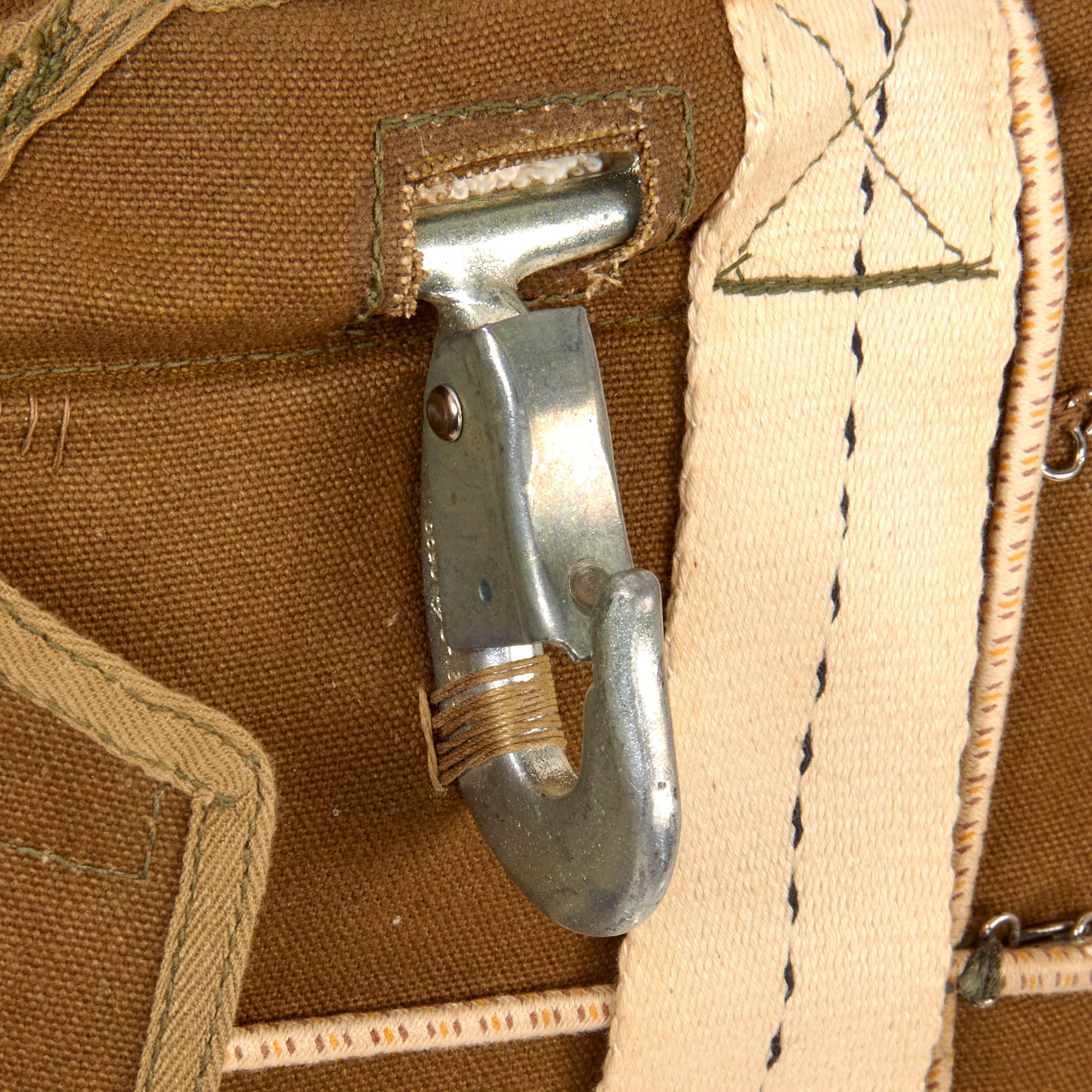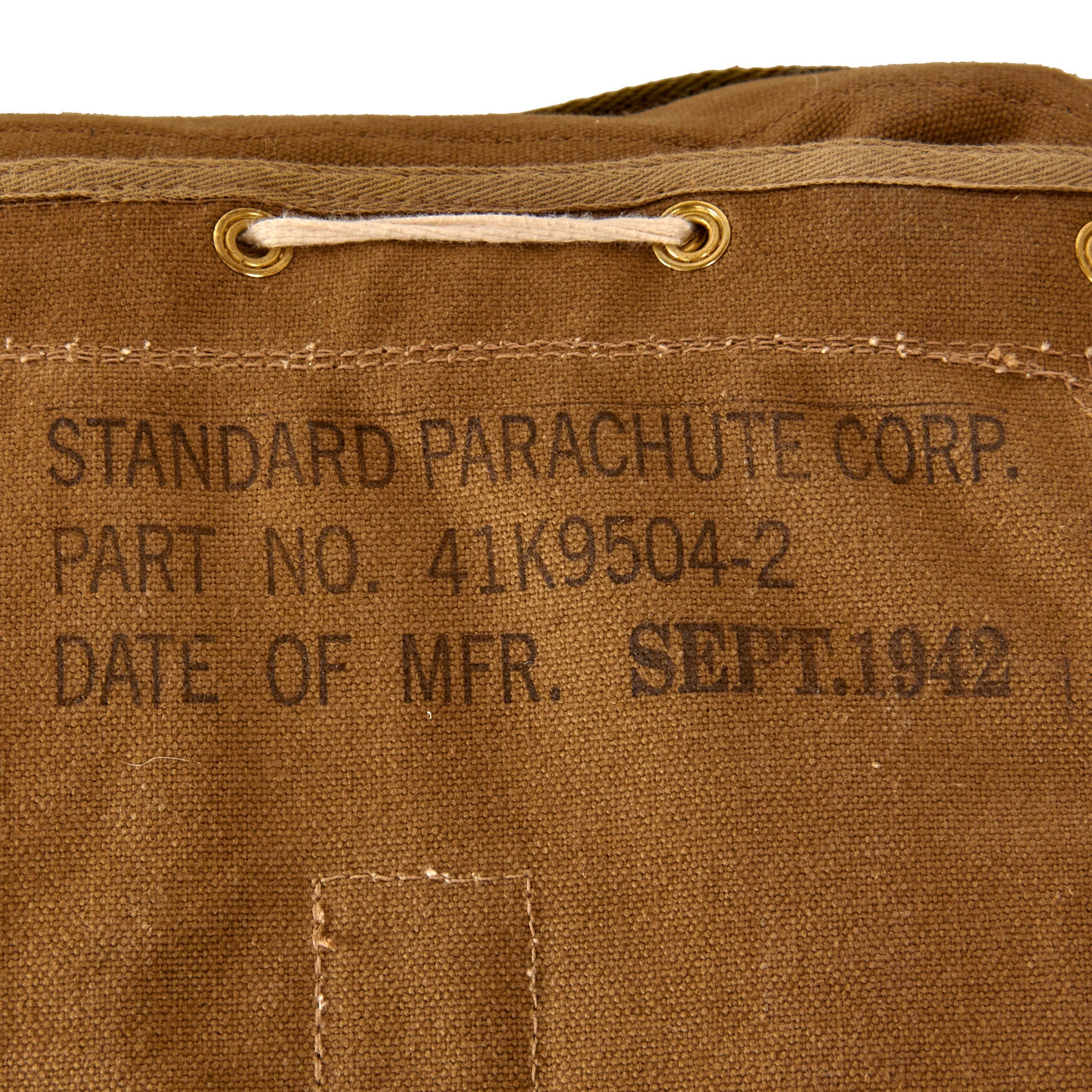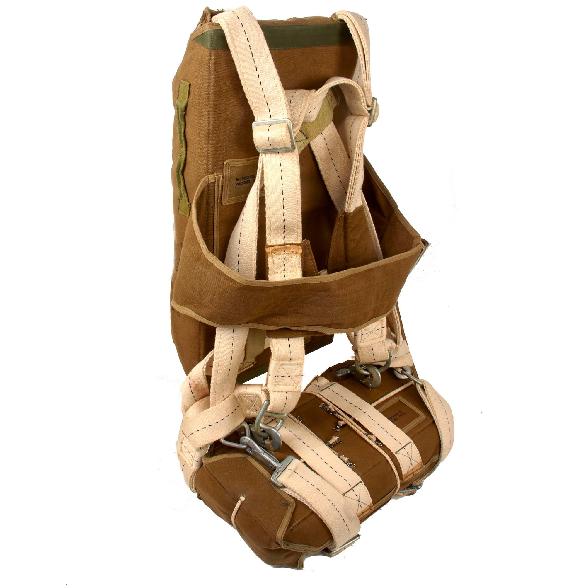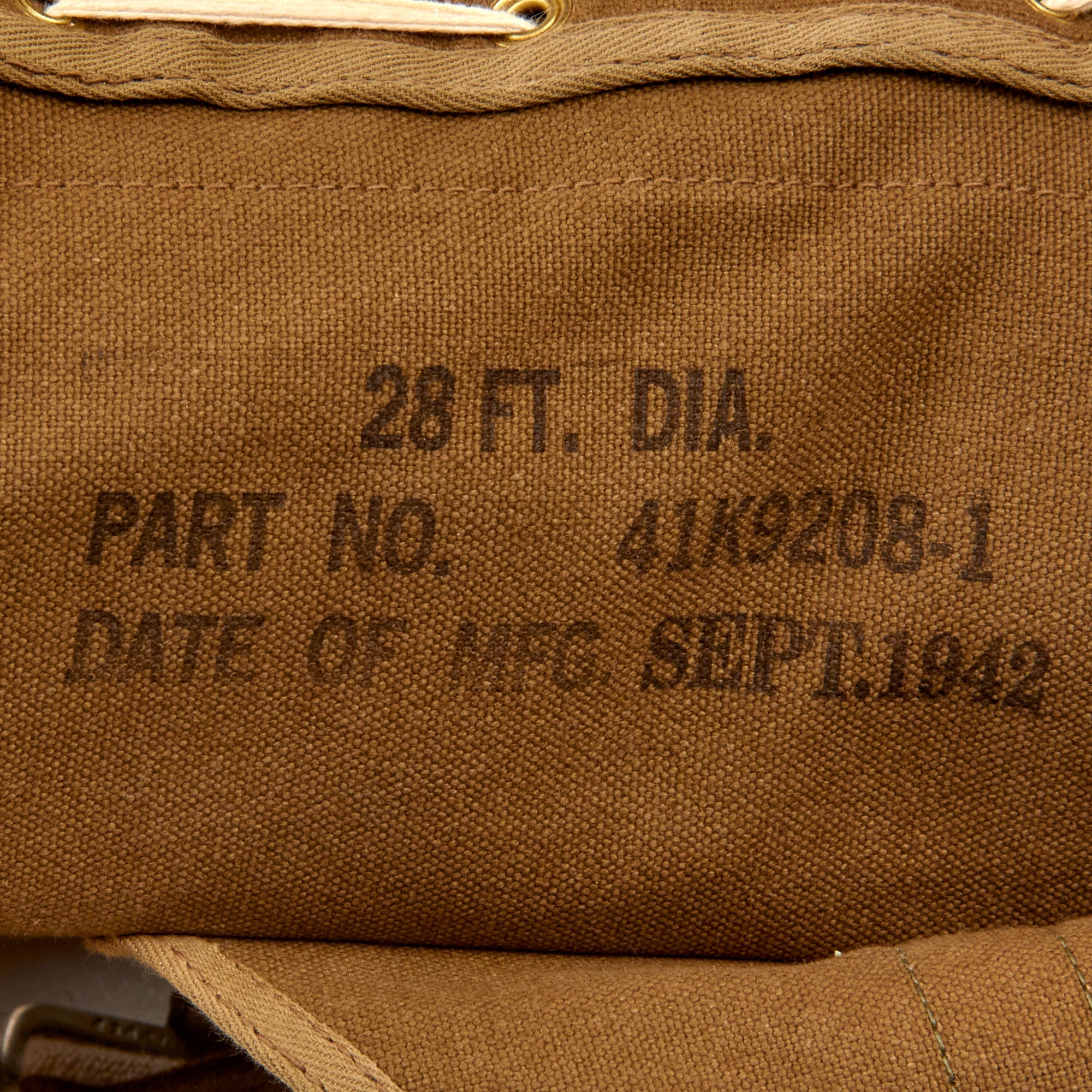 This reproduction set comes with a main canopy and reserve canopy. The main parachute does not bear any serial number, but all are marked to STANDARD PARACHUTE CORP with a "Manufacture Date” of September 1942. This set is accurately made with high quality materials, clothing and metal accessories are all high grade. From what we can tell there is no extensive damage or wear. This is a display reproduction and we do not recommend using it as a lifesaving or recreational device.
