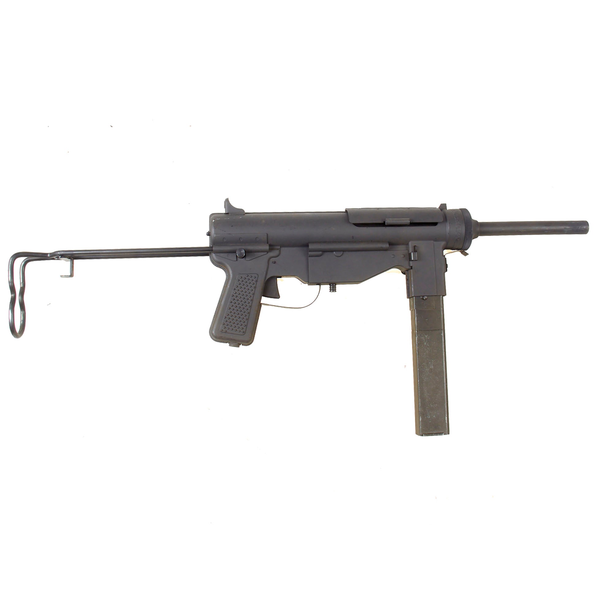 M3 submachine gun was a full-automatic blowback-operated firearm that fired from an open bolt. The receiver was made from steel stampings. M3 featured spring-loaded ejection port cover (which also acted as safety, locking the bolt when it is closed) and crank-type bolt retracting (cocking) handle at the right side of the receiver.