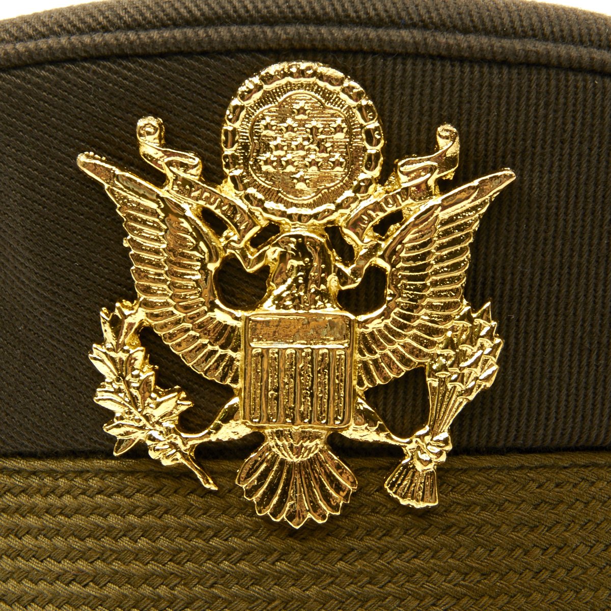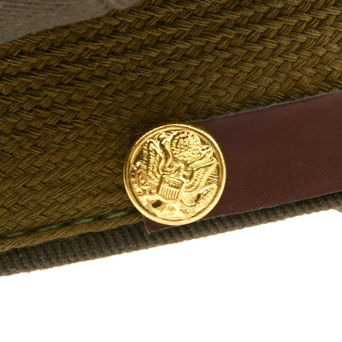 Cap features cotton twill construction, all leather visor, sweatband, chinstrap, gold plate eagle buttons, and "gold plate" metal eagle badge.