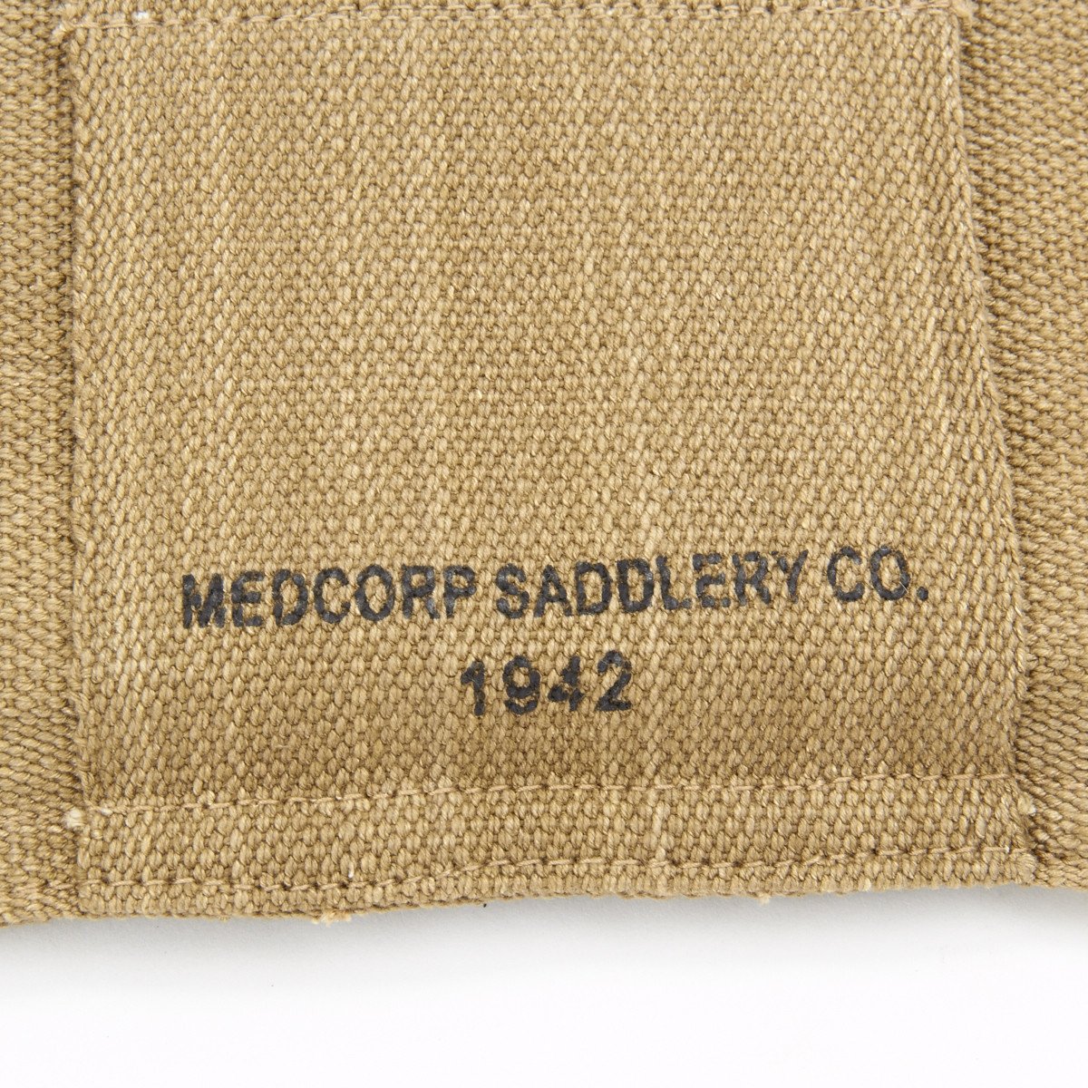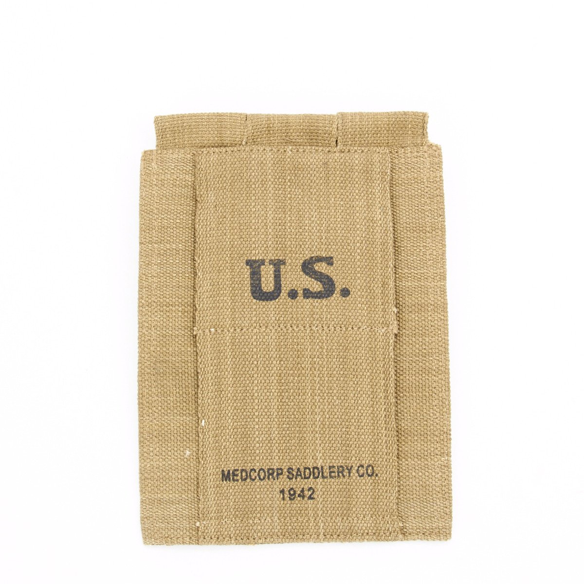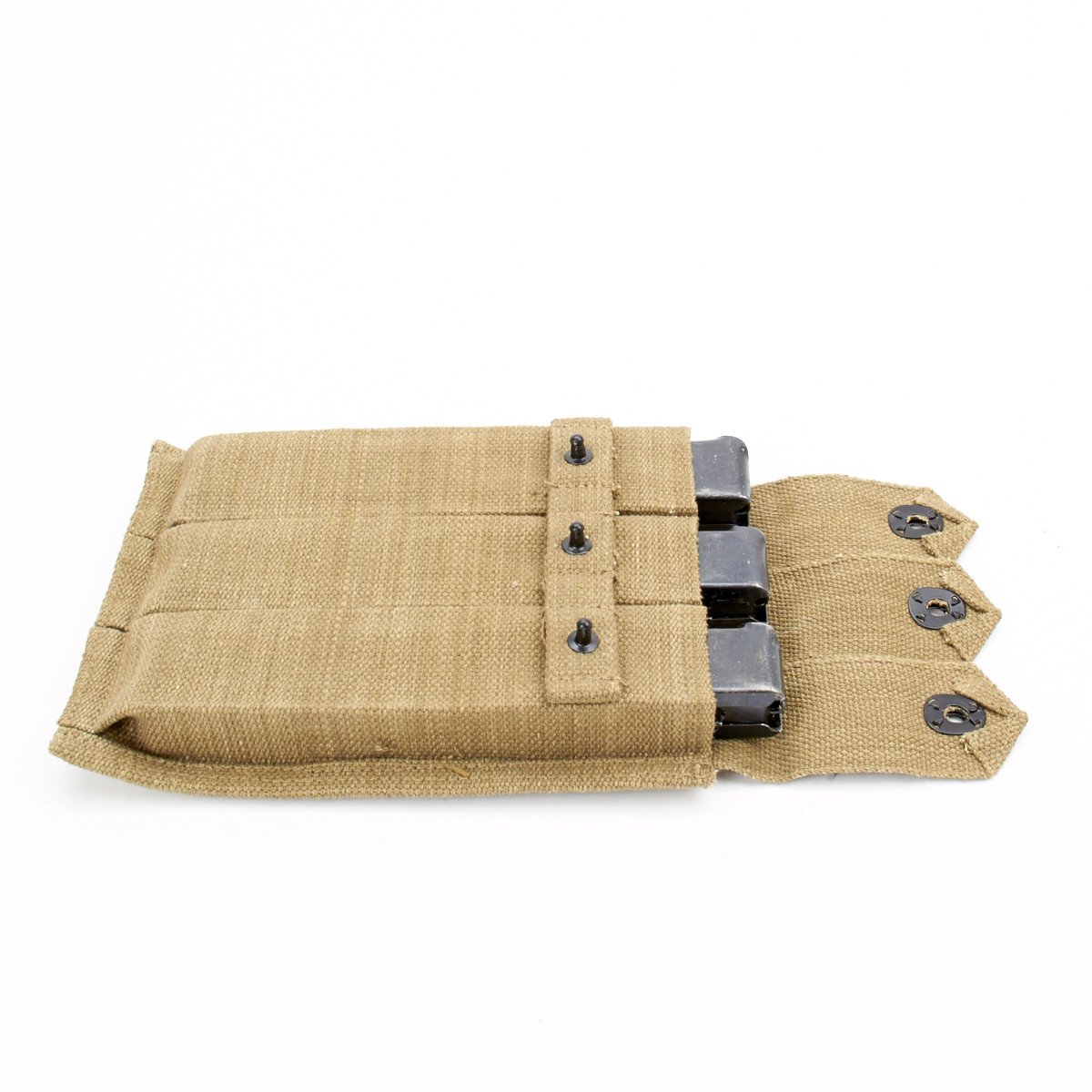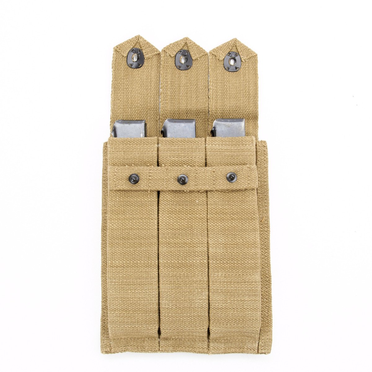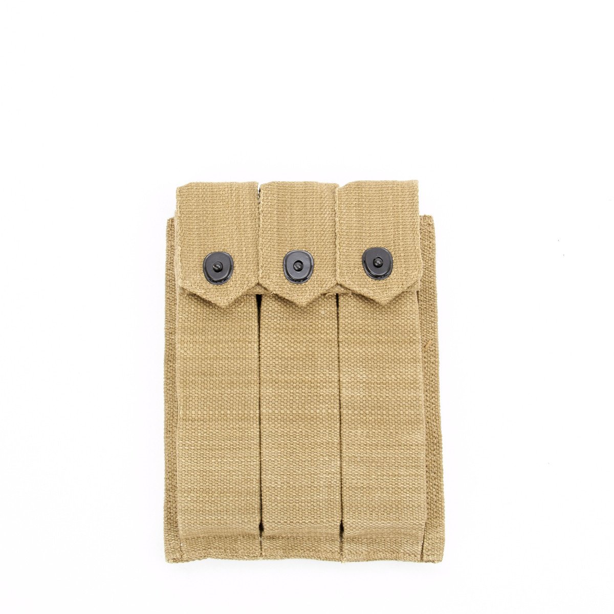 New Made Item: High quality reproduction of the WWII issue khaki web pouch with three magazine compartments each to accept one thirty round Thompson SMG stick magazine. Complete with replicated WW2 markings (manufacturer and date vary) and lift the dot style snaps.