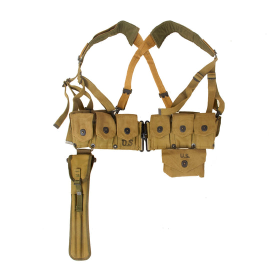 Original U.S. WWII M1923 Cartridge Belt Rig & Named Musette Bag Lot - BAR Part Box & Cleaning Rod Kit