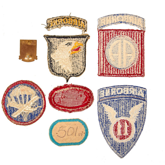 Original U.S. WWII Airborne Patch & Insignia Lot - 101st & 82nd Divisions, 501st & 101st Artillery Ovals & 22nd Bombardment Group DI - 7 Pieces Total