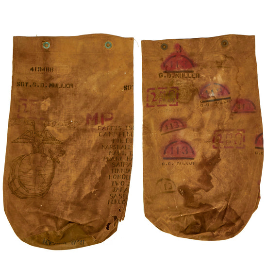 Original U.S. WWII Named US Marine Corps Sea Bag Lot Featuring Artwork, UNIS Markings and Locations - Sgt. George Muller 3rd Provisional Military Police Battalion, 4th Marine Division