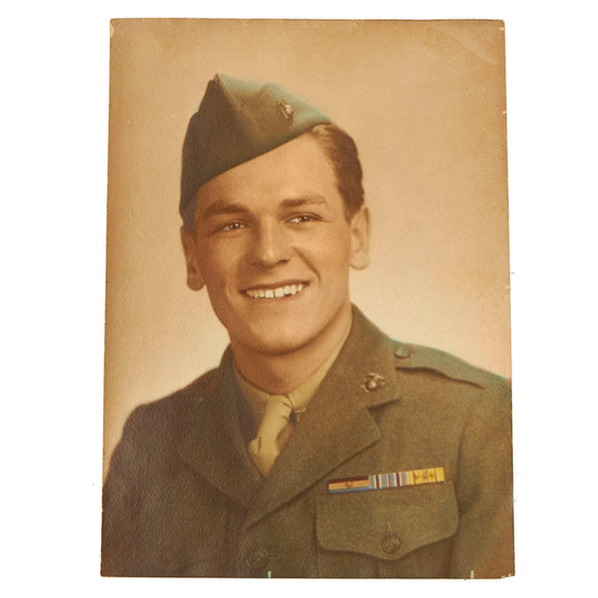 Original U.S. WWII Named 6th Marine Division Uniform Jacket & Visor Cap with Reprinted Photos & Belt - Private First Class Bruno J. Mingrone