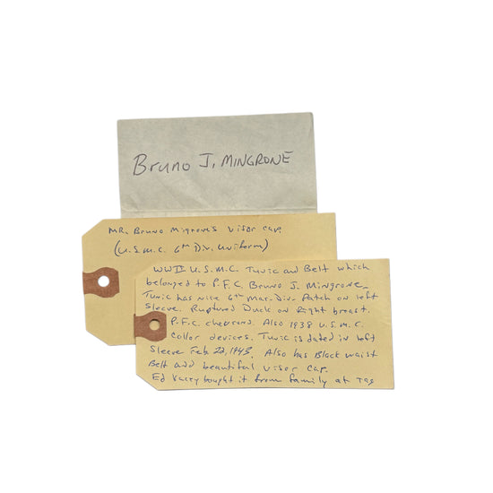 Original U.S. WWII 6th Marine Division Uniform Jacket & Visor Cap with Reprinted Photos & Belt - Attributed to Private First Class Bruno J. Mingrone