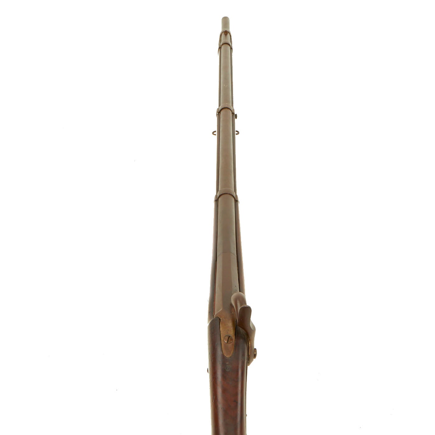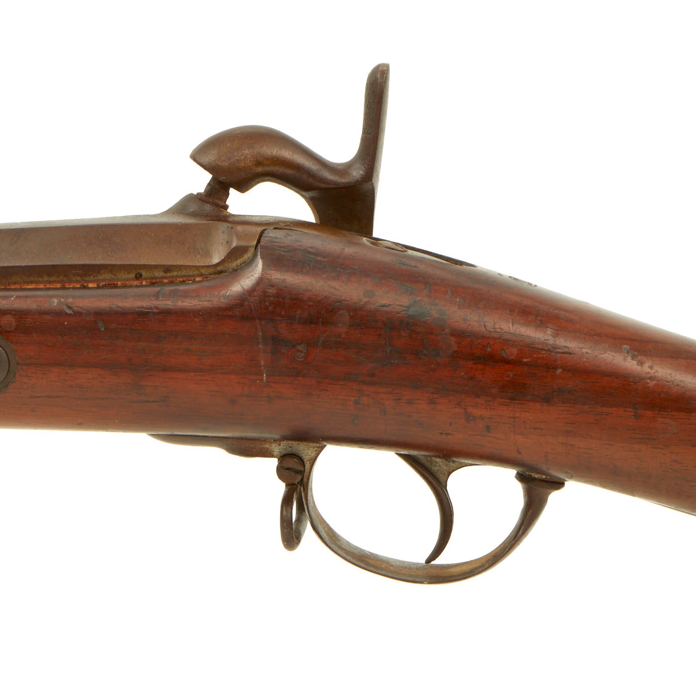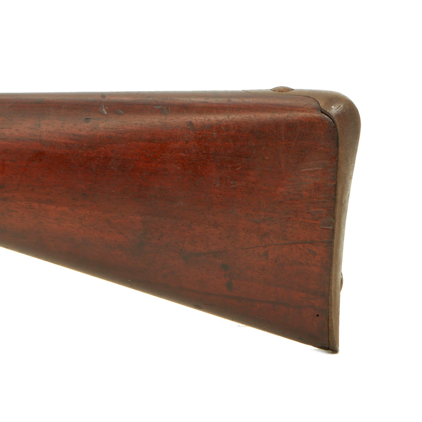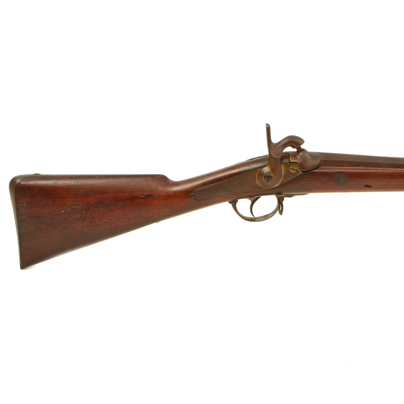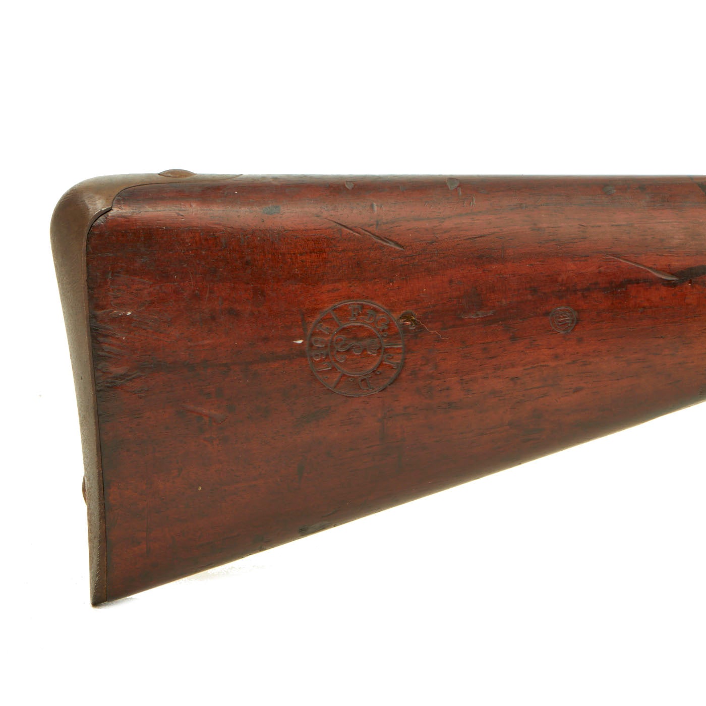 • Original Item: Only One Available. This is an interesting Belgian Percussion rifled musket, which as far as we can tell was converted from a BREECH LOADING Albini-Braendlin rifle. The markings, the style, and the shape all match. We assume that this was a cadet or more likely colonial issue rifled musket, which would serve to limit the possibilities should it be captured by the native population. We can see wooden shims around the breech plug area, filling up the extra space that the breech loading mechanism once occupied.