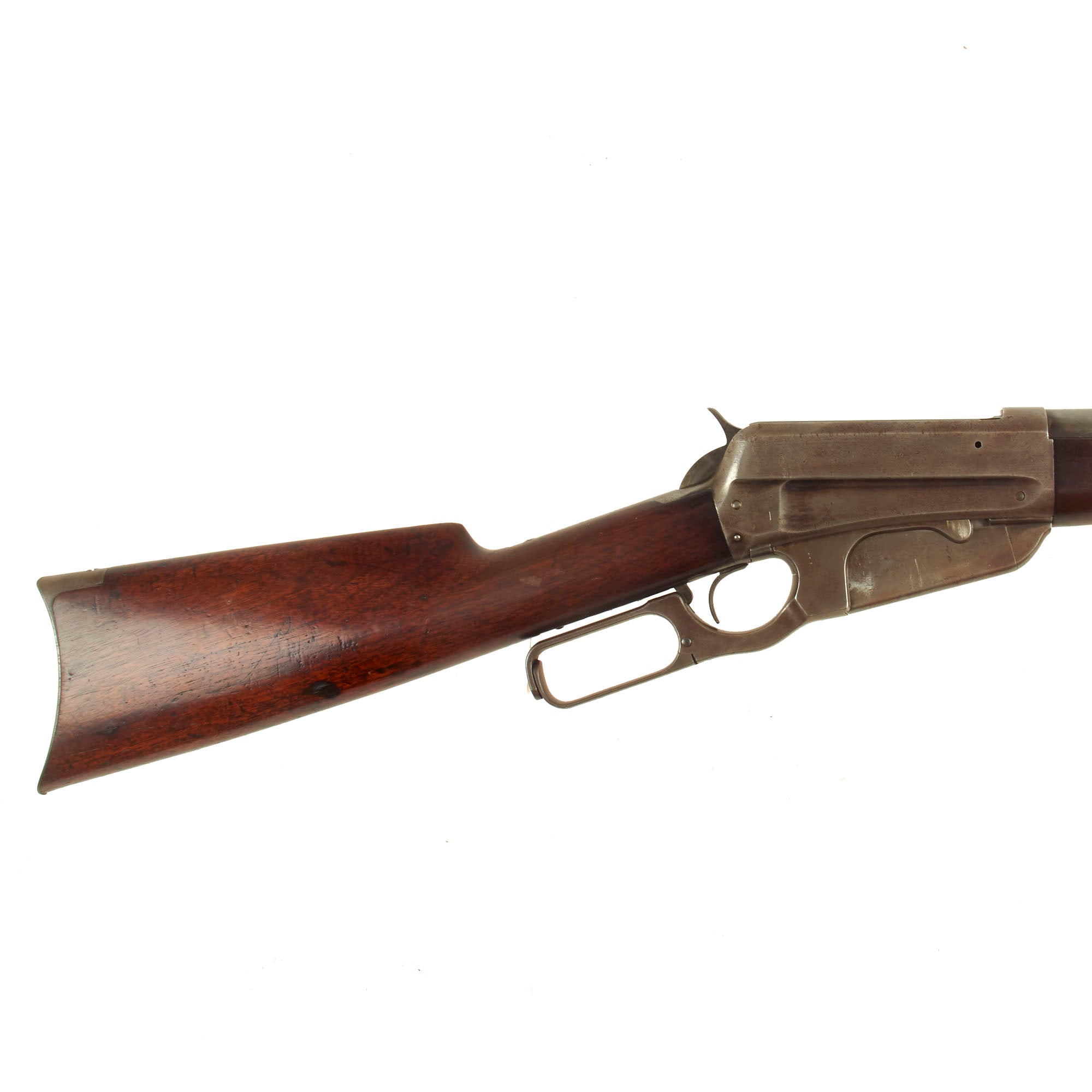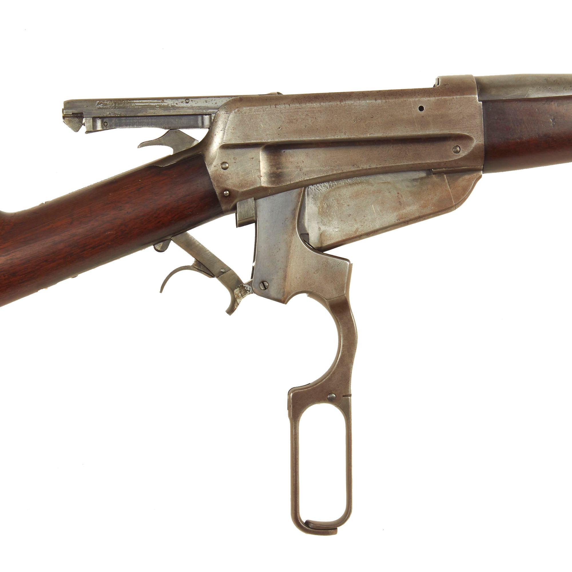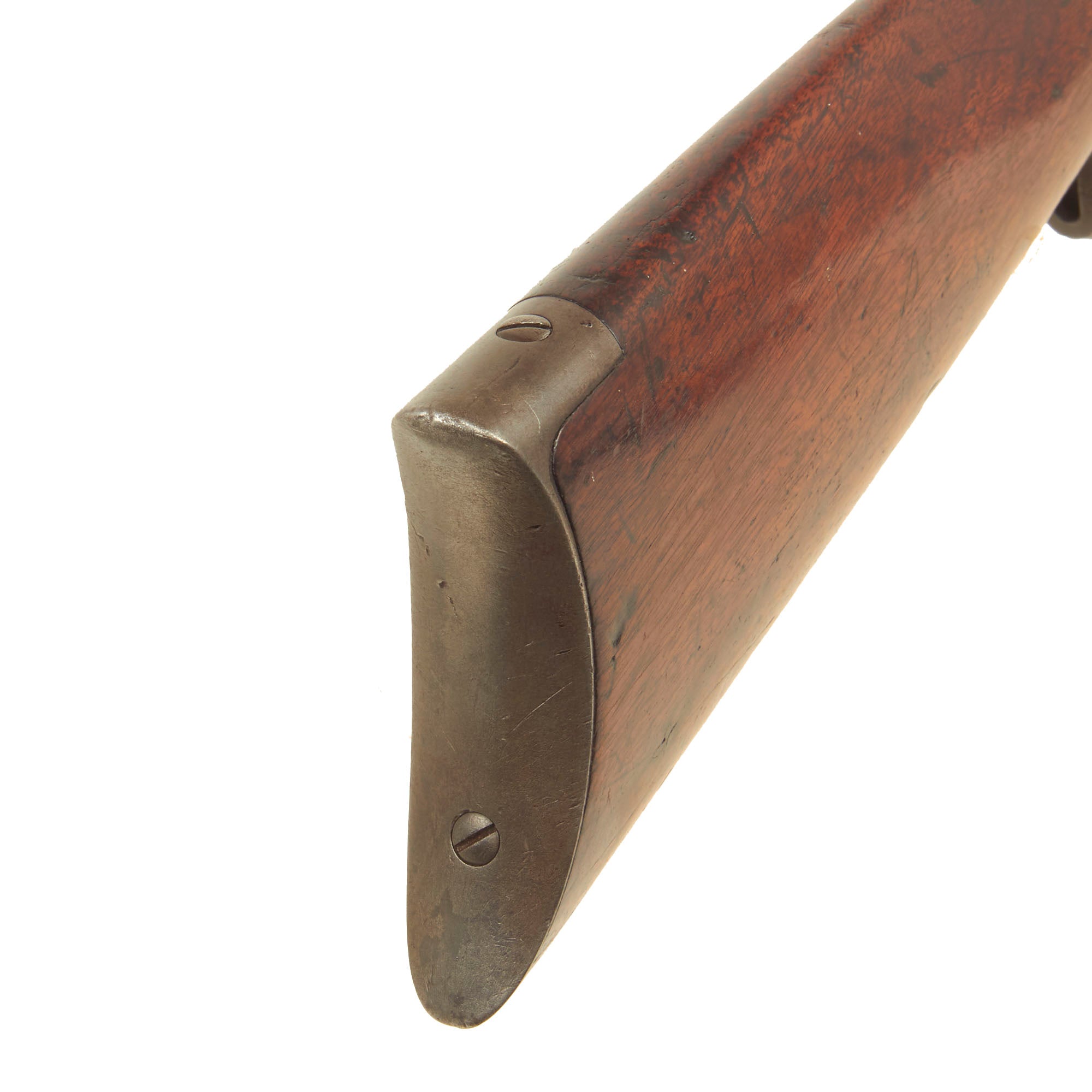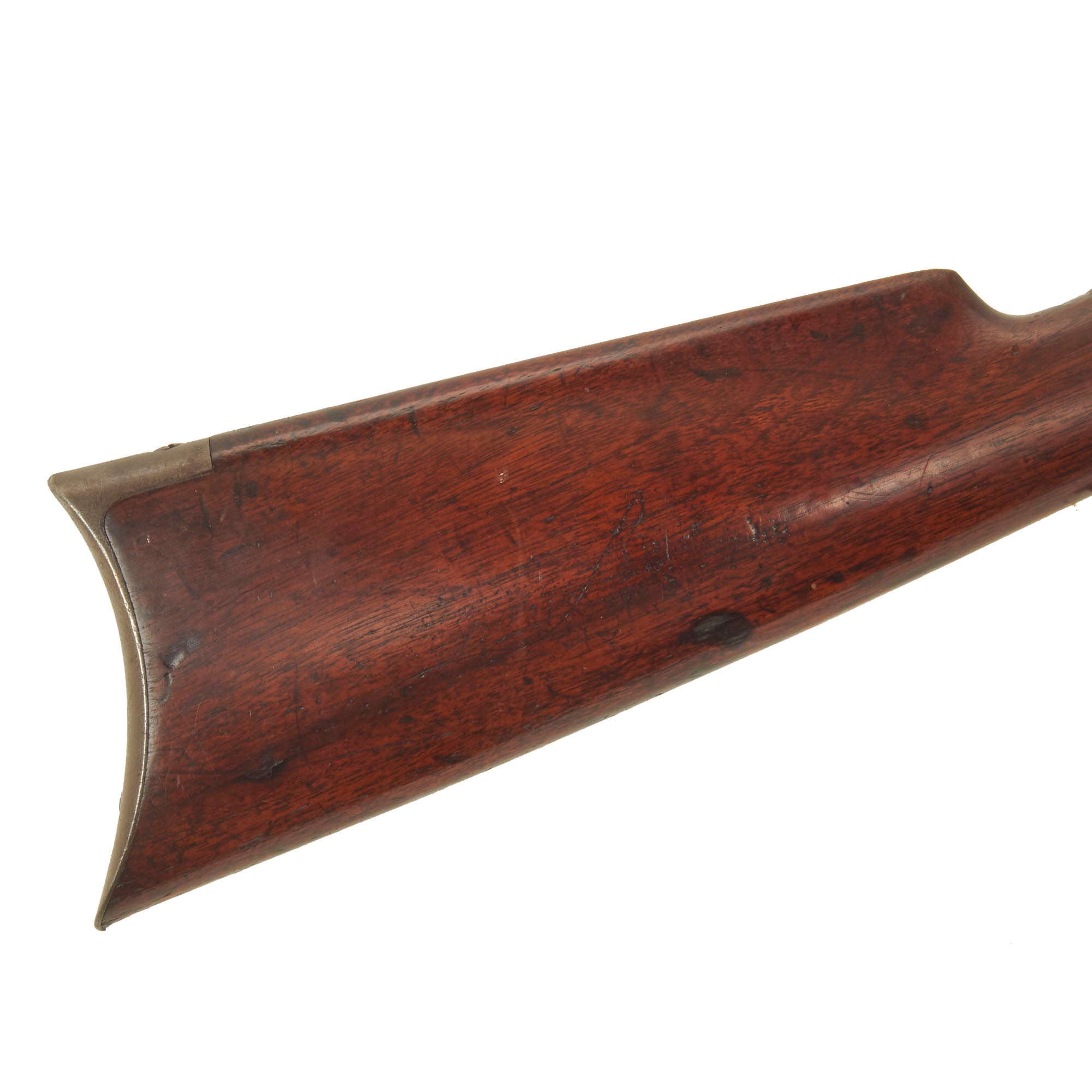 The stocks are in vert good condition, showing lovely grain and the beautiful red-brown color of oiled aged walnut. They do show some dents, scrapes, and dings, but no structural damage. This looks like a rifle that saw some real use out hunting, possibly during the end days of the western frontier.
