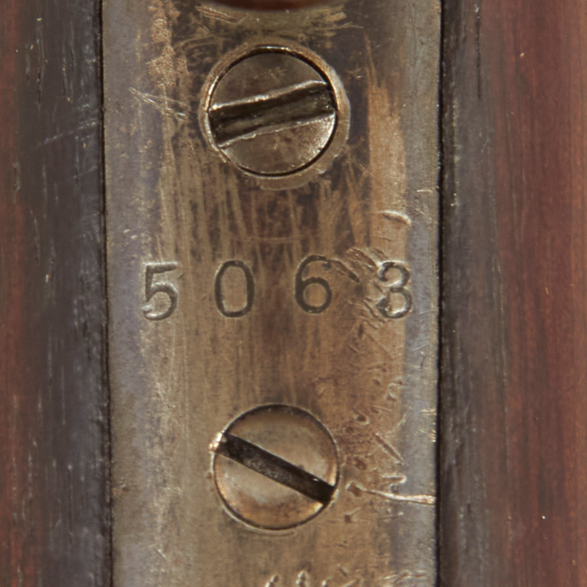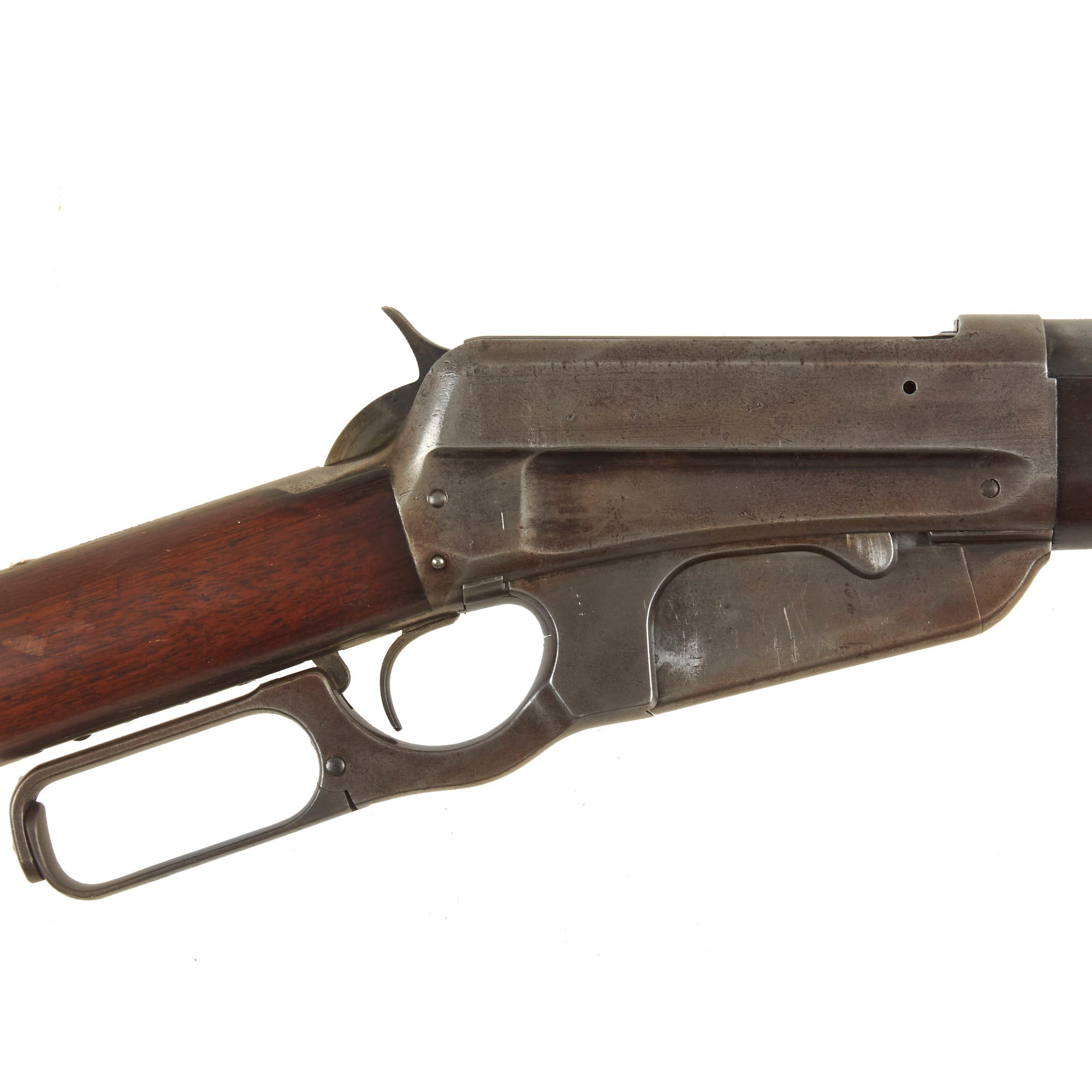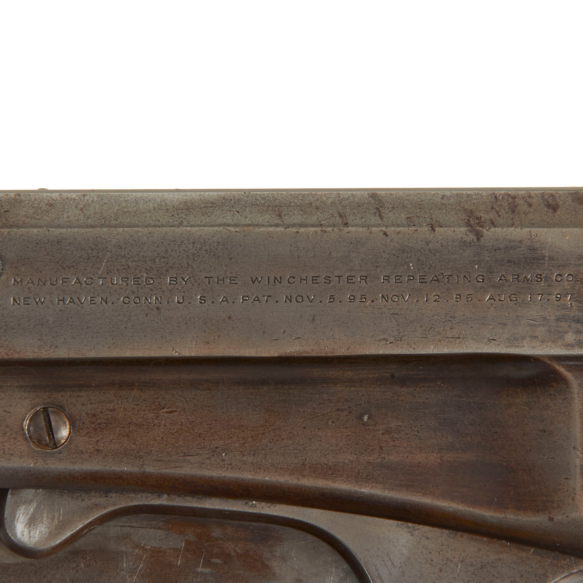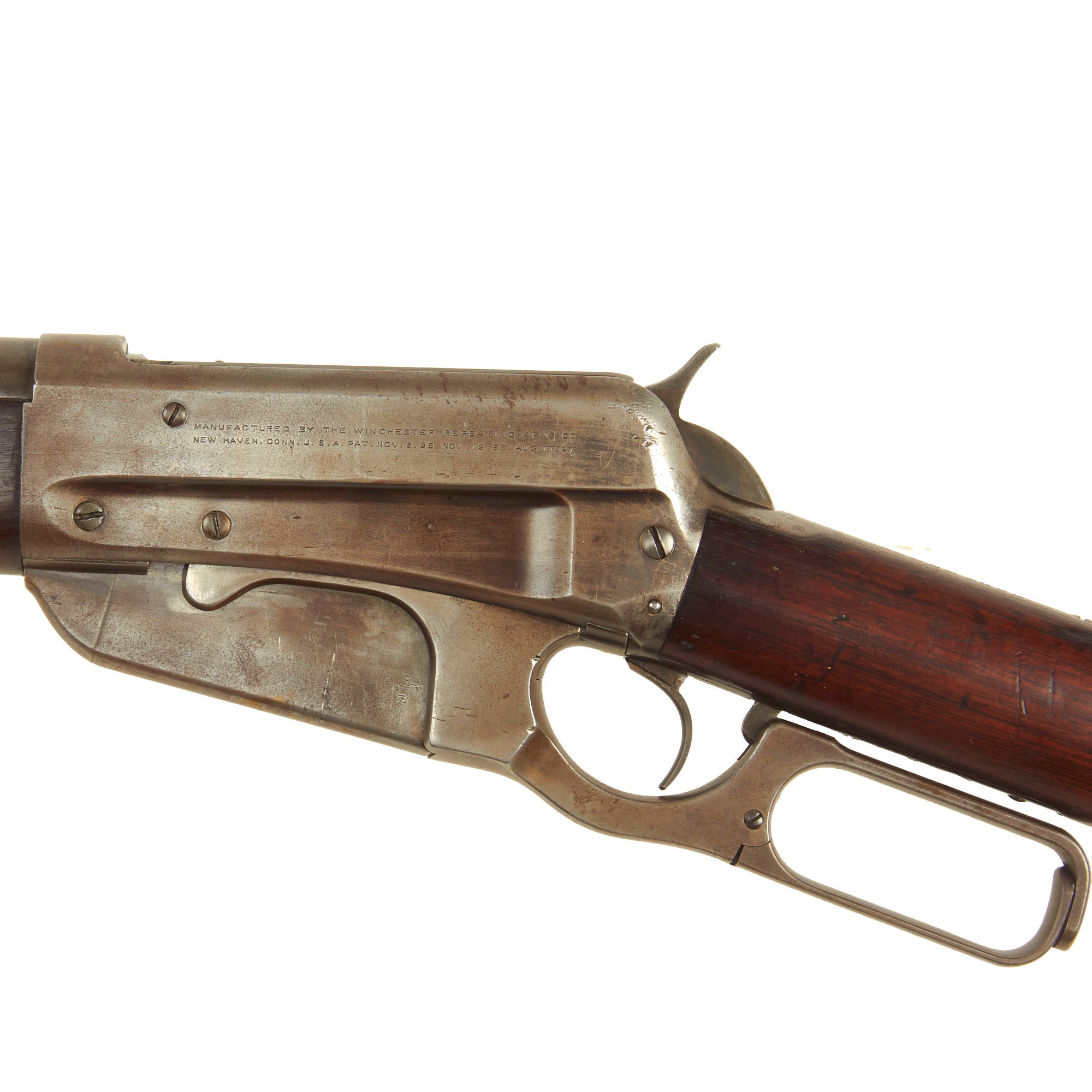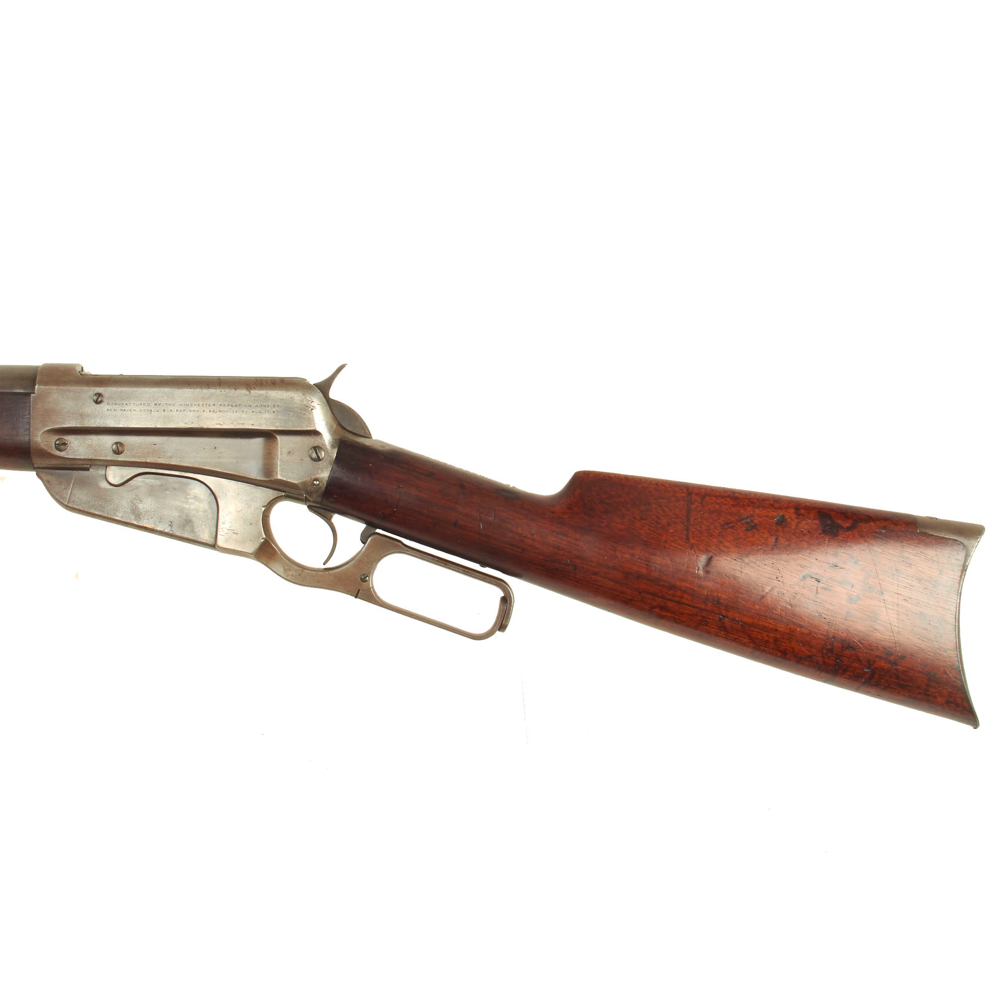 The lower receiver tang is marked with serial number 5063, meaning it was actually manufactured in 1896 making this be Classed as an "ANTIQUE" by Federal Law. It features a "fluted side" receiver, introduced after serial number 5000, so this is one of the first made! Prior to this they all featured a "flat sided" receiver, and by serial number 6000 all of the previously produced flat receivers had left the factory.