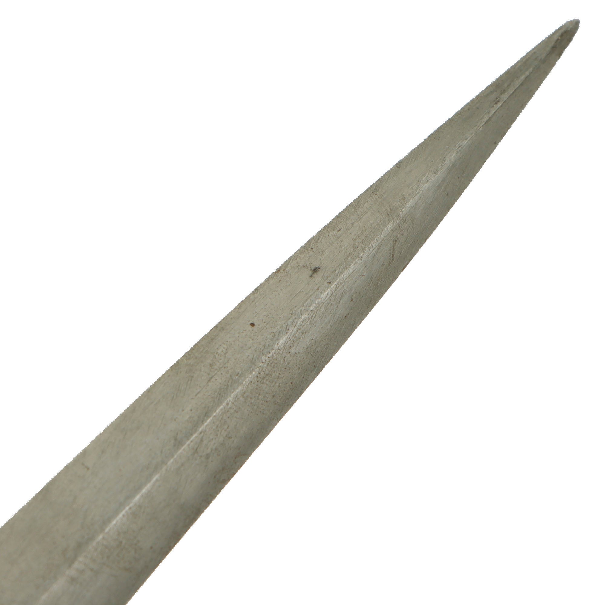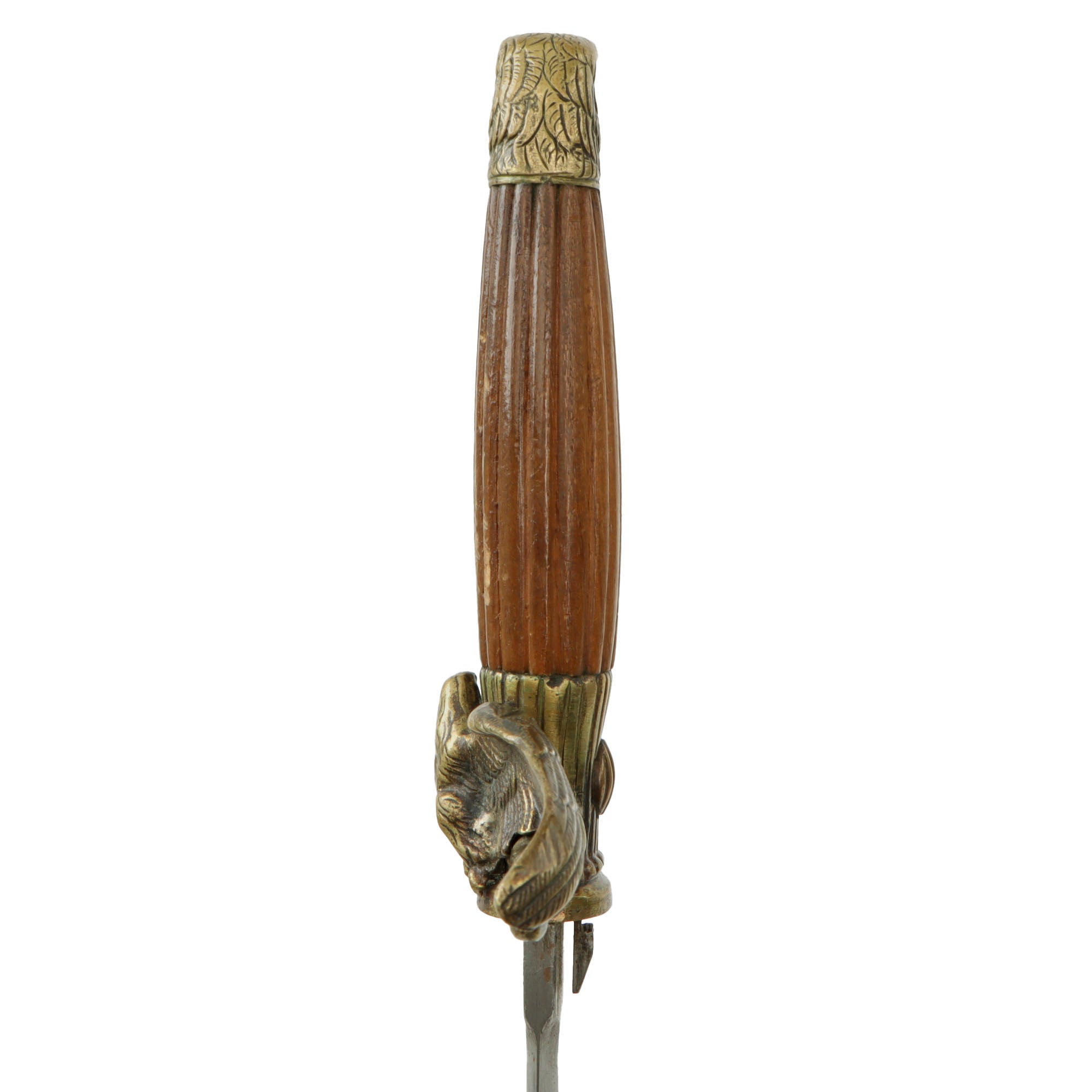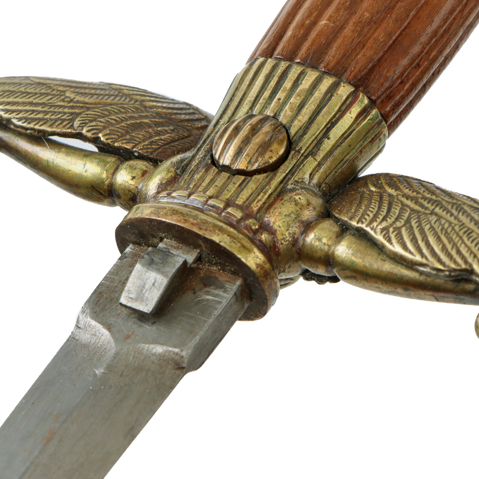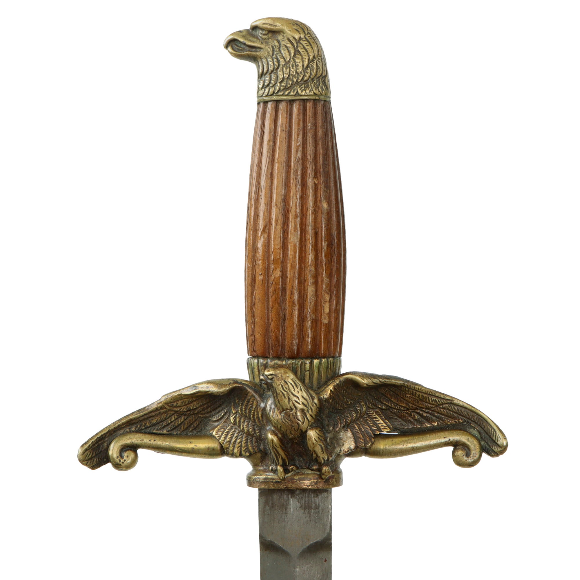 The dagger has a lovely Eagle's head pommel, rare wooden grip, and brass crossguard. The Eagle on the cross guard is the correct Nickel Silver for a lower ranked officer: high ranked officers would have a gold Eagle on the cross guard. The hilt has a scabbard release button on the opposite side from the great wing guard. The 8 1/2" blade looks to have been cleaned multiple times, which has worn away any markings. There are no markings on the ricasso.