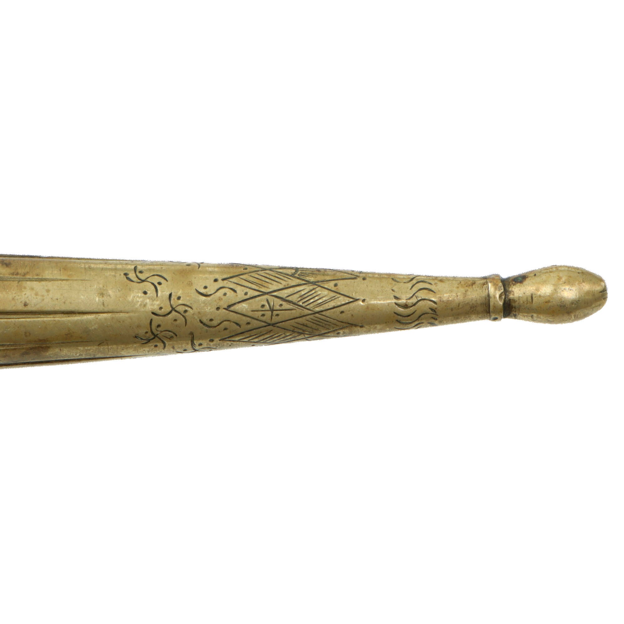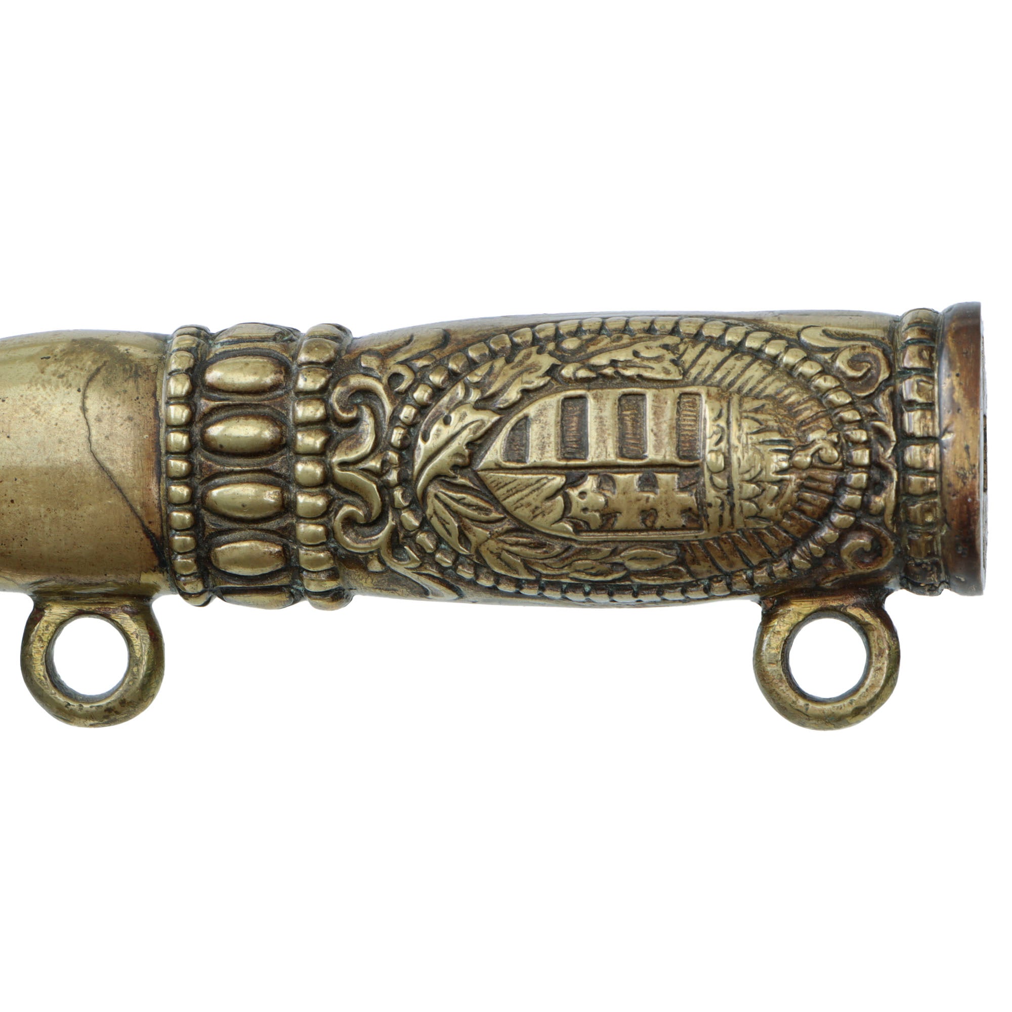 The scabbard is the standard type seen, made of lacquered polished brass. It has the Royal Coat of Arms of Hungary inside a wreath embossed onto the scabbard. The two hanger rings are present, but the hanger itself is absent.
