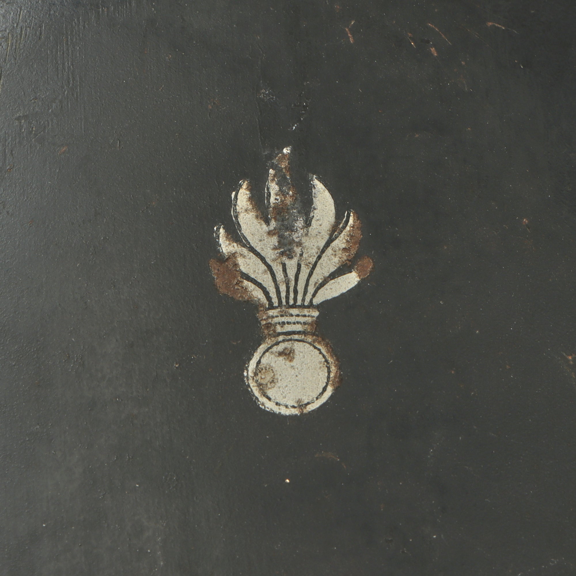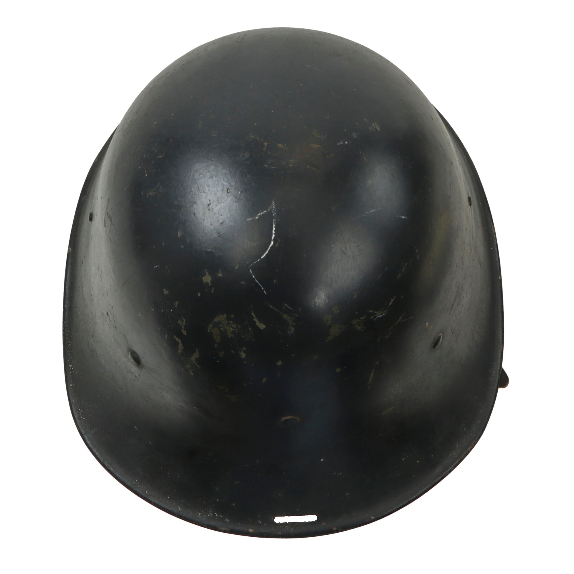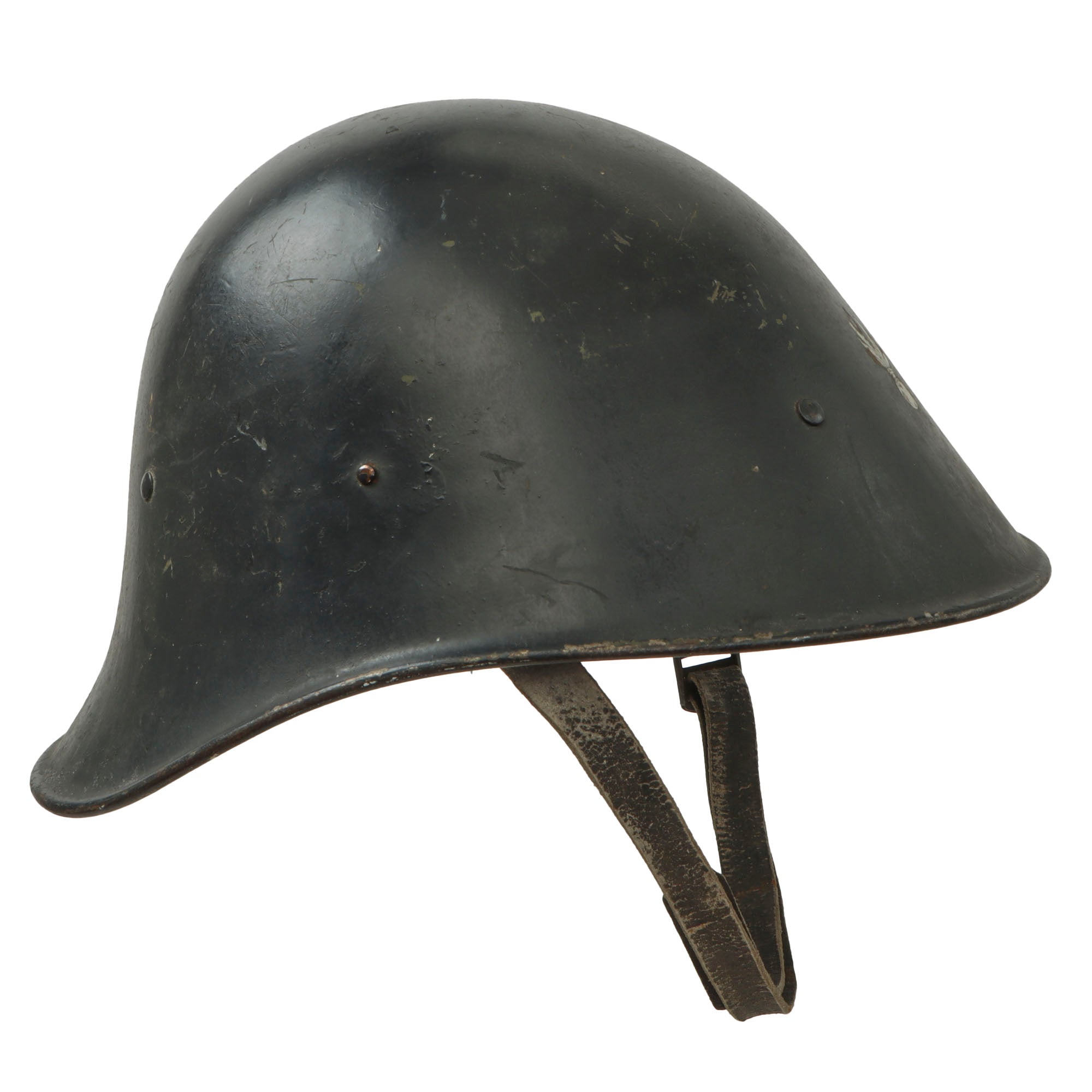 Original Item: Only One Available. This is an original pre WWII Dutch M23/27 or M28 Dutch military steel helmet with chin strap and head liner. The Dutch had a very small army in the 1920's and thus only produced very small numbers of these helmets. Estimates are that around 105,000 of all variants were made. The M23 designation indicates the design date of 1923, and the "27" signifies the date of adoption, 1927. They are sometimes also referred to as the M28 "Nieuw Model" . This helmet still has its period paint visible under the black repaint, which was a Flat Dark Olive and has a Gendarmerie bursting bomb on the front, for the Military Police.