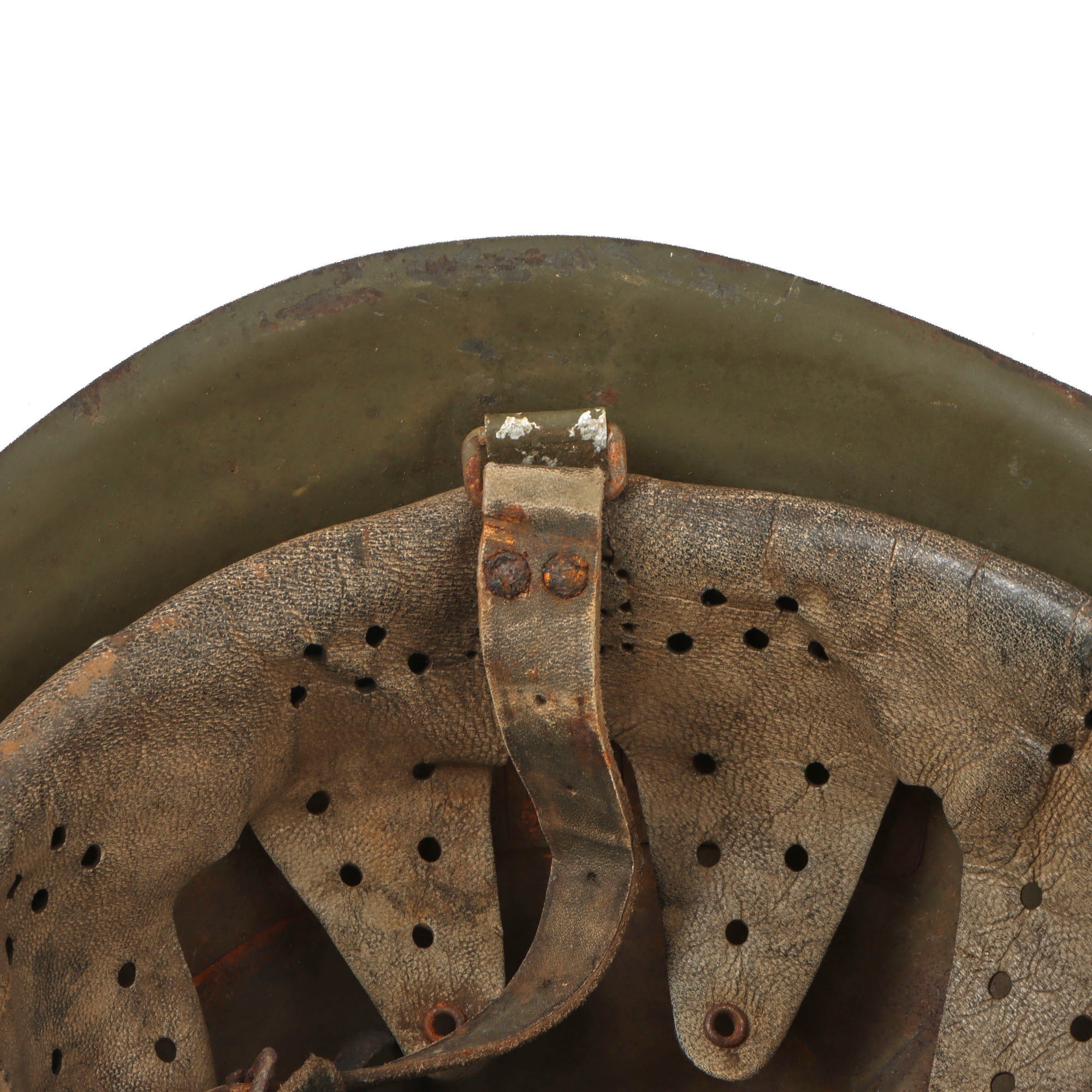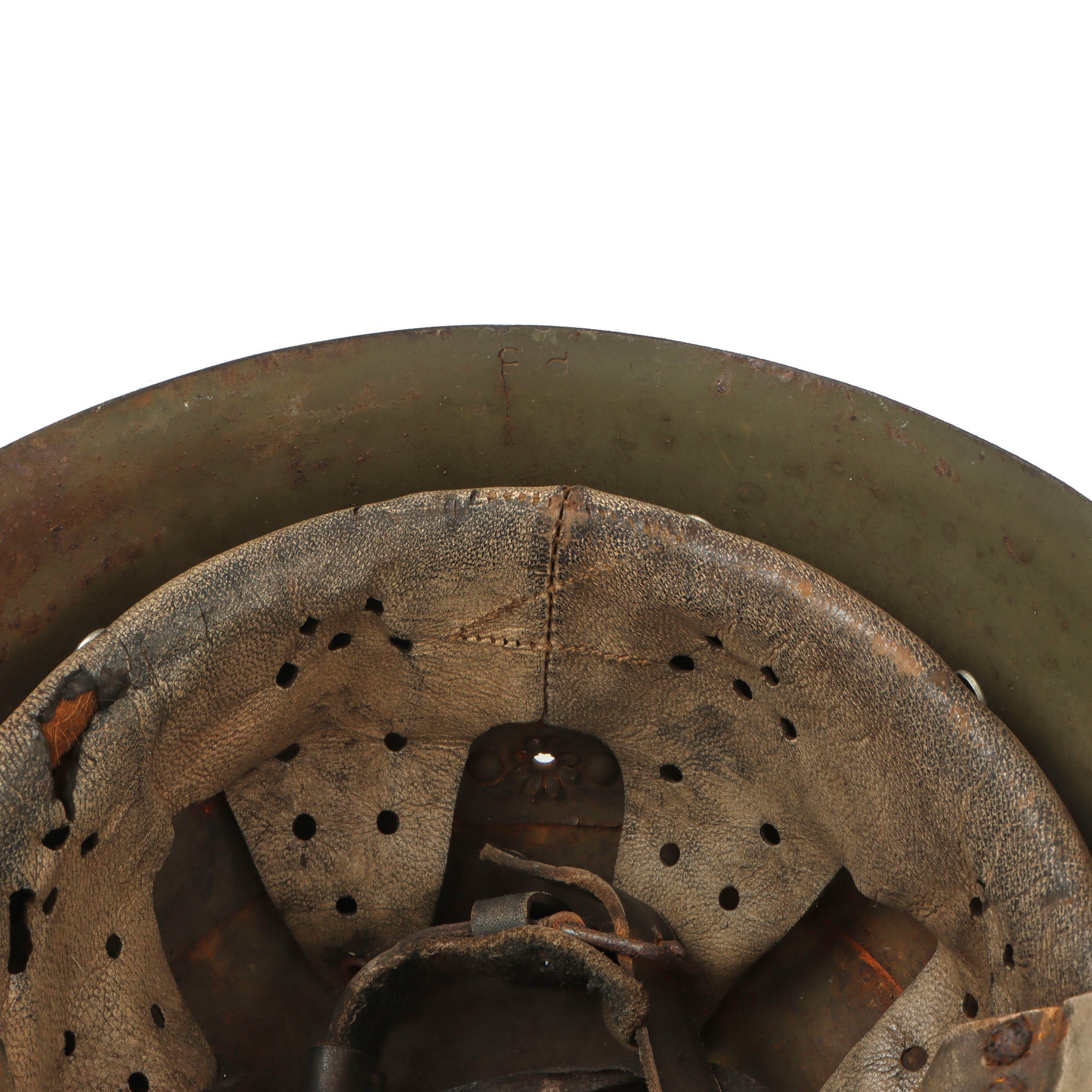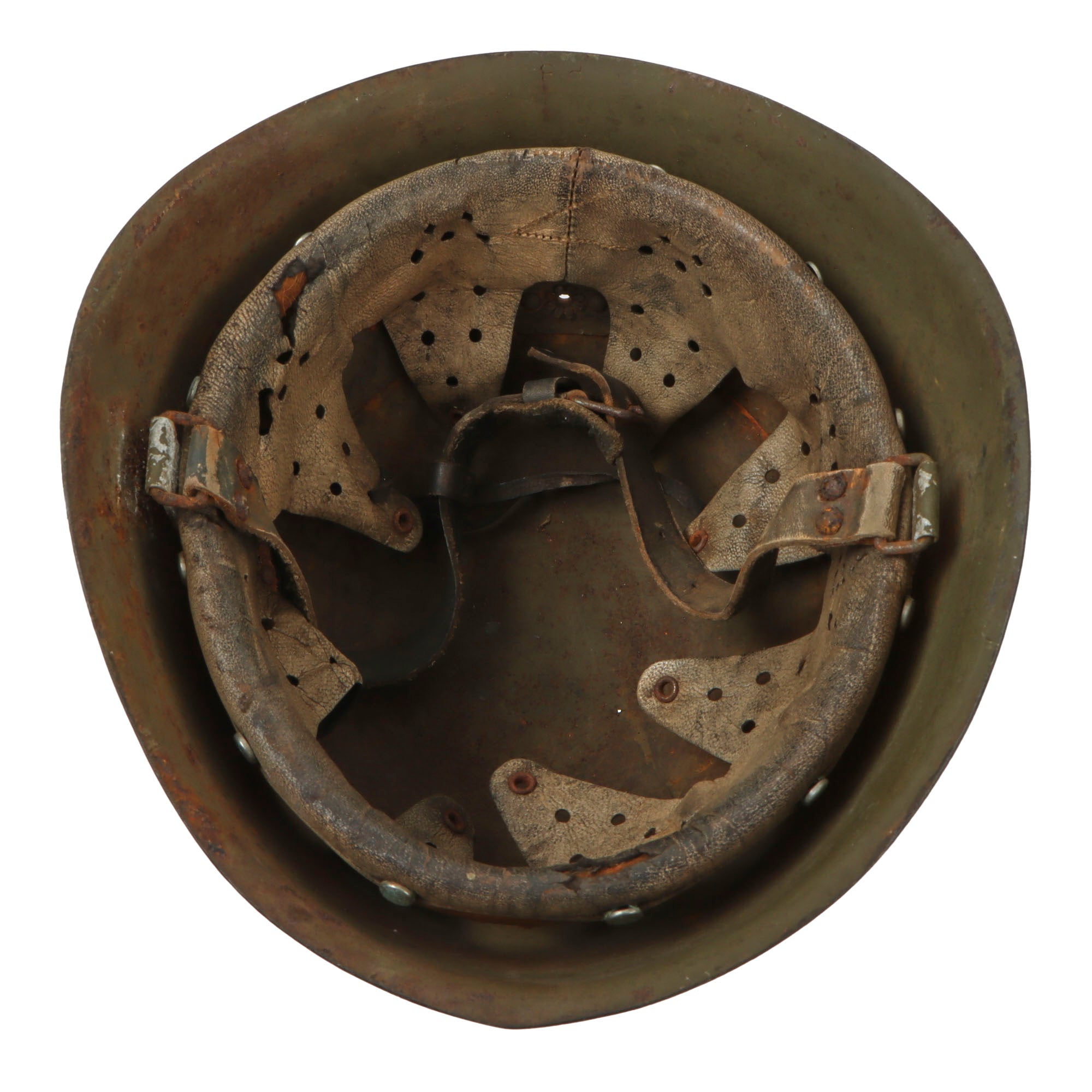 The shell itself has heavy oxidation spotting across the finish. The interior shows that the leather liner is intact and in very worn shape, with the correct Z-stitch to the rear and the proper rectangular chinstrap bales, although they show heavy oxidation. The leather chinstrap is still intact and is worn with some crazing. There is perforation in the liner for the size, 57. The rear of the shell is stamped P5, and there is a stress crack in the shell at this spot.