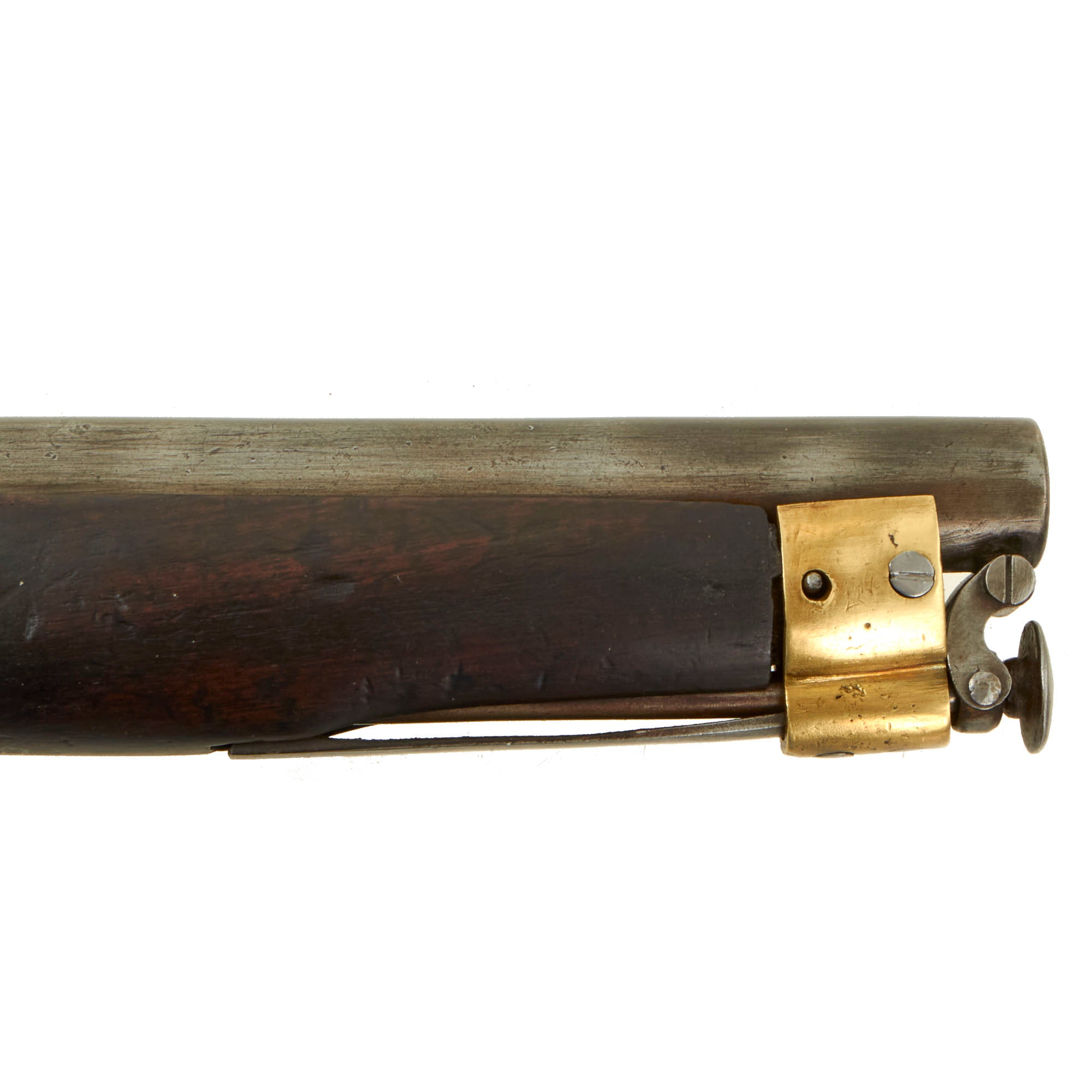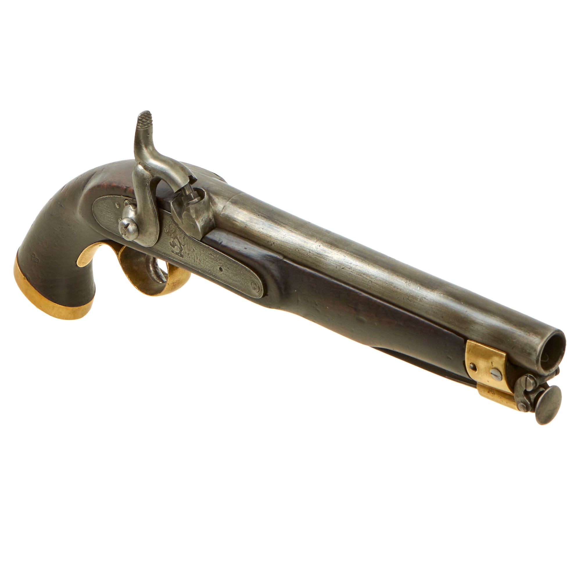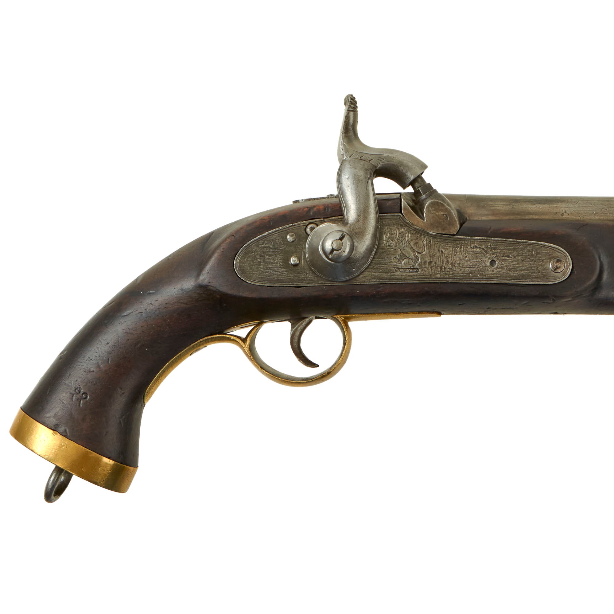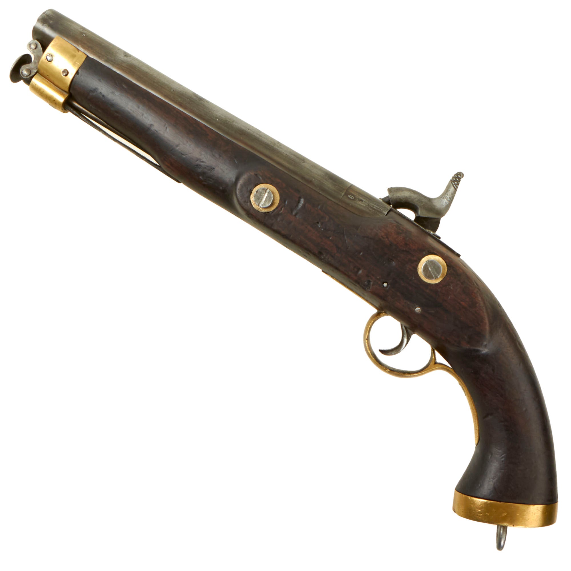 Original Item: Only one available. This is a standard British EIC Cavalry Pistol adopted in 1843 fitted with is known as the "new series side lock". This pistol replaced the Model of 1840 that had the "old series side lock" which appeared (but wasn't) to have been constructed from flintlock parts. This pattern 1843 became the principal handgun of the East India Company up until it was taken over by the British home Government in 1859.