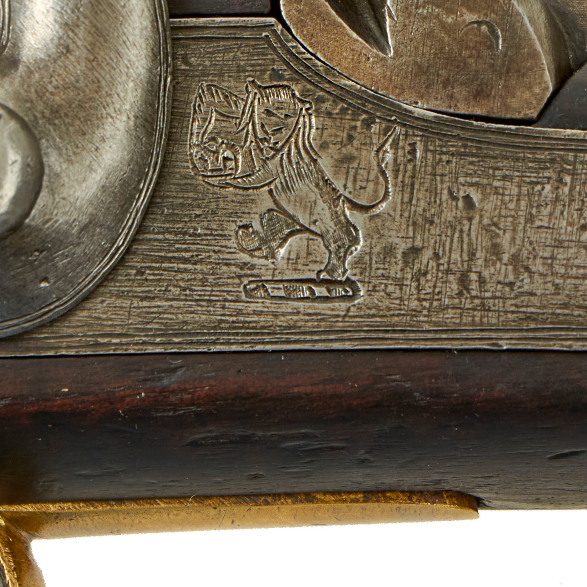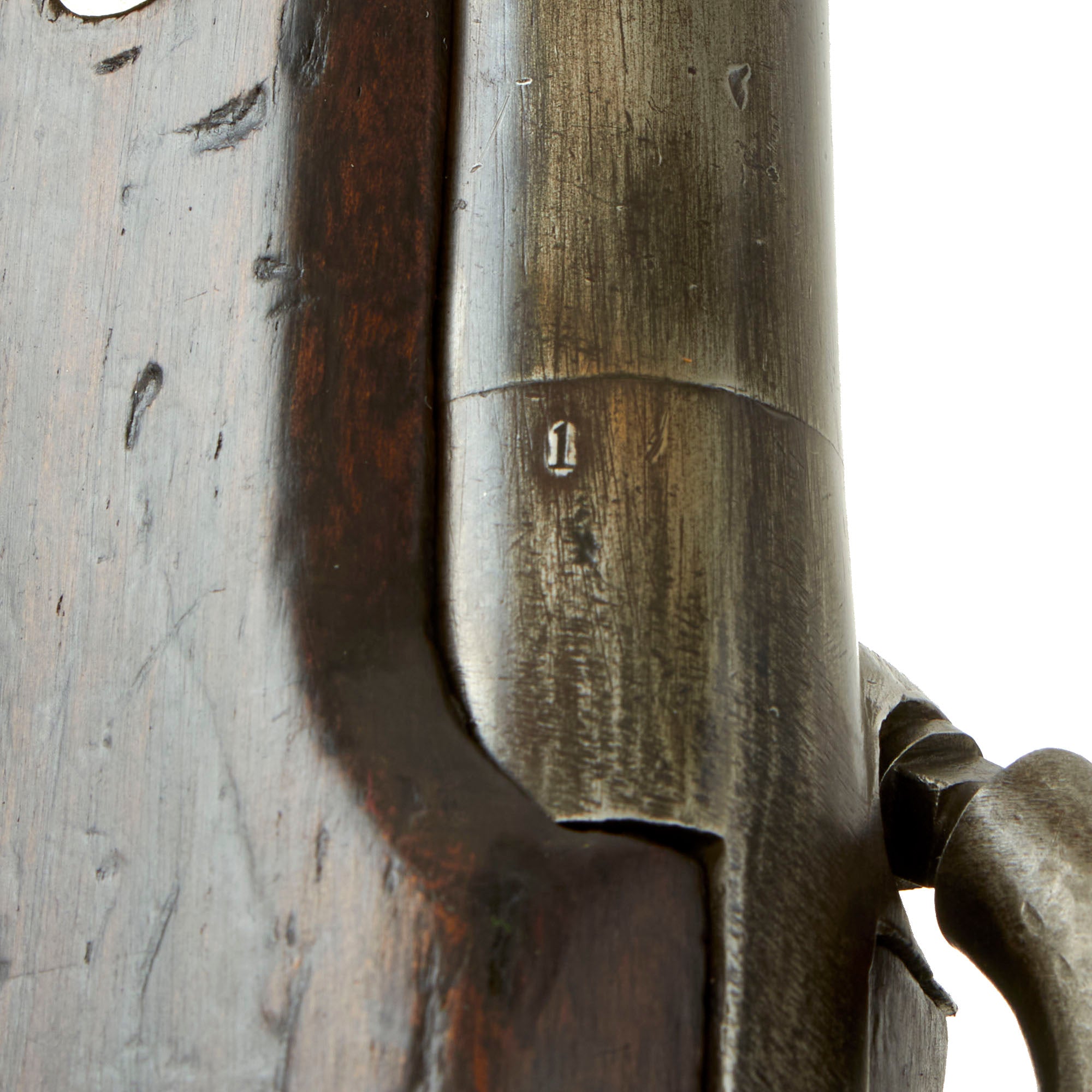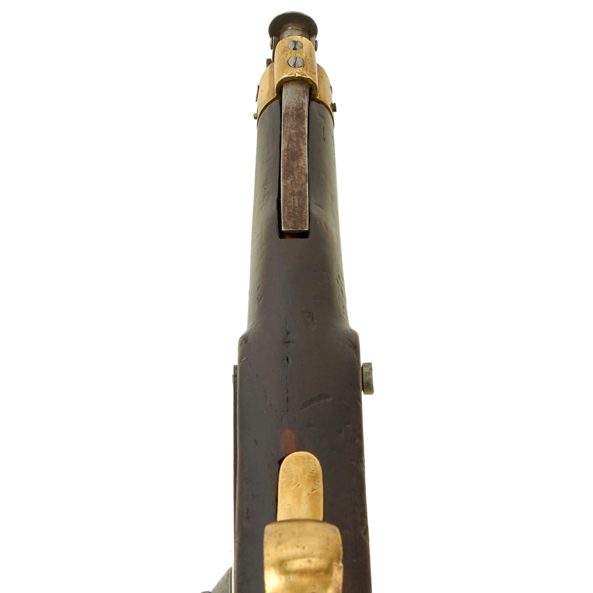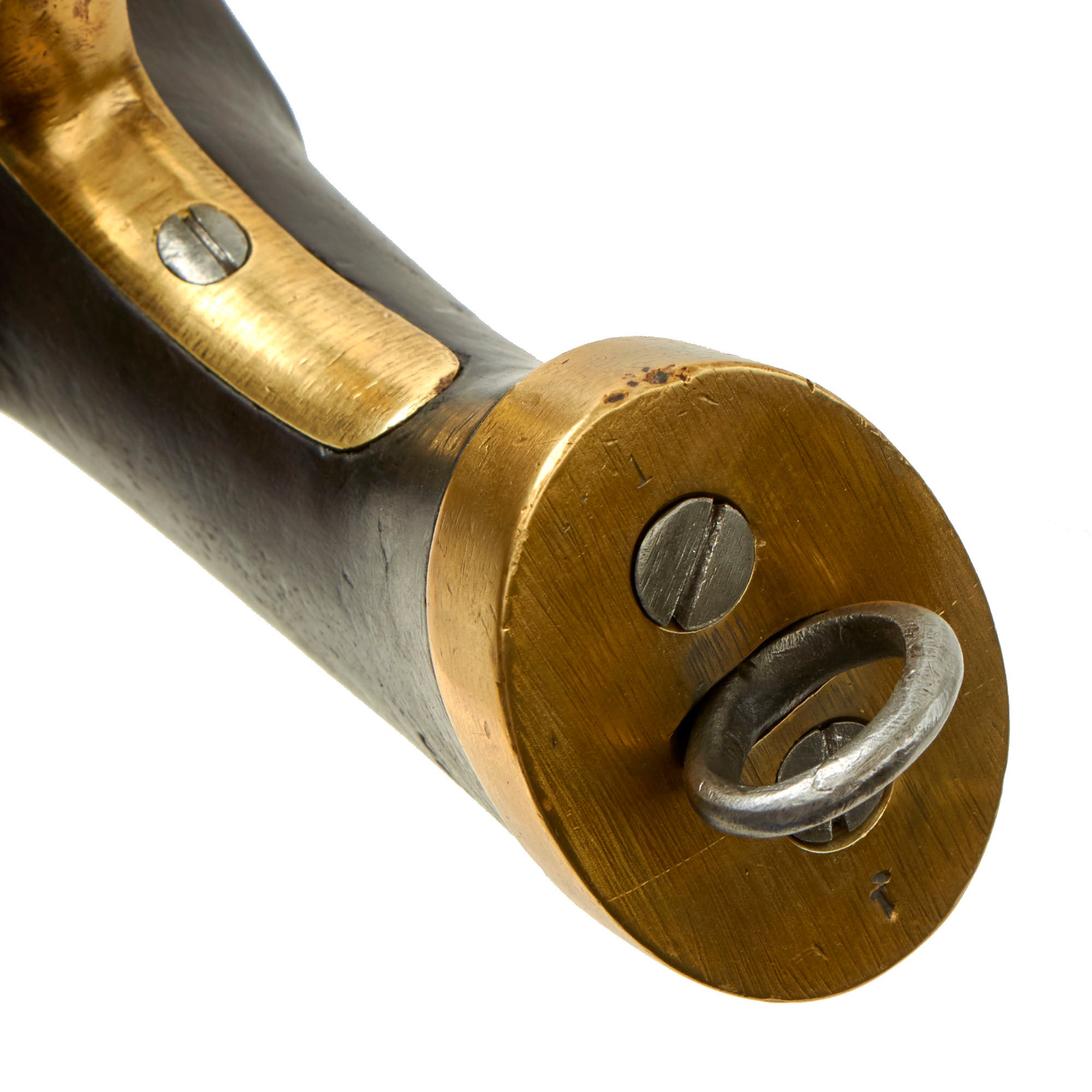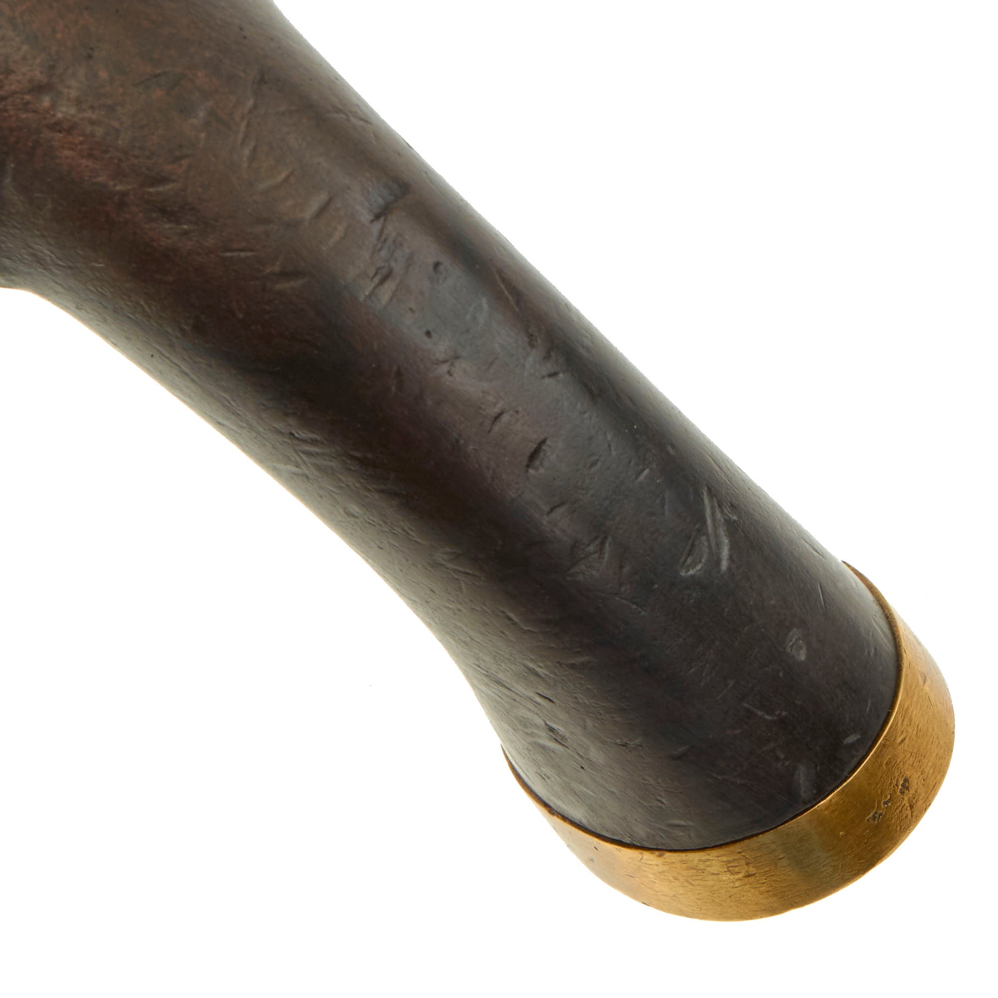 This example does not have any markings on the parts except for a few stamped numbers, so it was most likely assembled locally from unmarked parts. The pistol retains its trapped swivel ramrod for use while mounted on a horse, and it also has the standard lanyard ring on the butt, to keep it from being dropped. We checked the lock, and it is still fully functional, holding at half cock and firing at full. The stock shows the usual dents and dings from service, as well as what looks like a small repair on the bottom of the stock in front of the trigger guard. There are no major structural cracks or chunks missing from the rest of the stock, which has a lovely color.