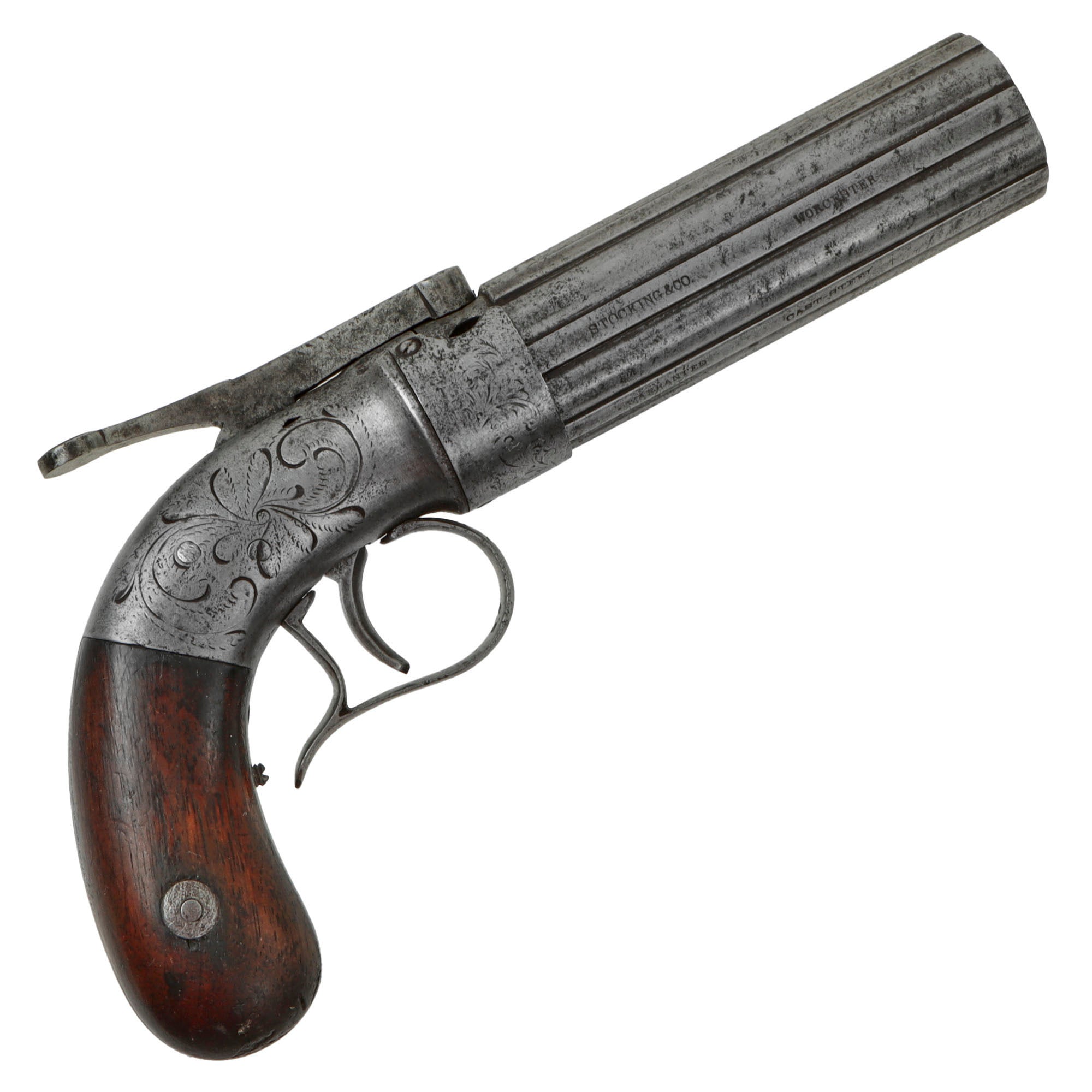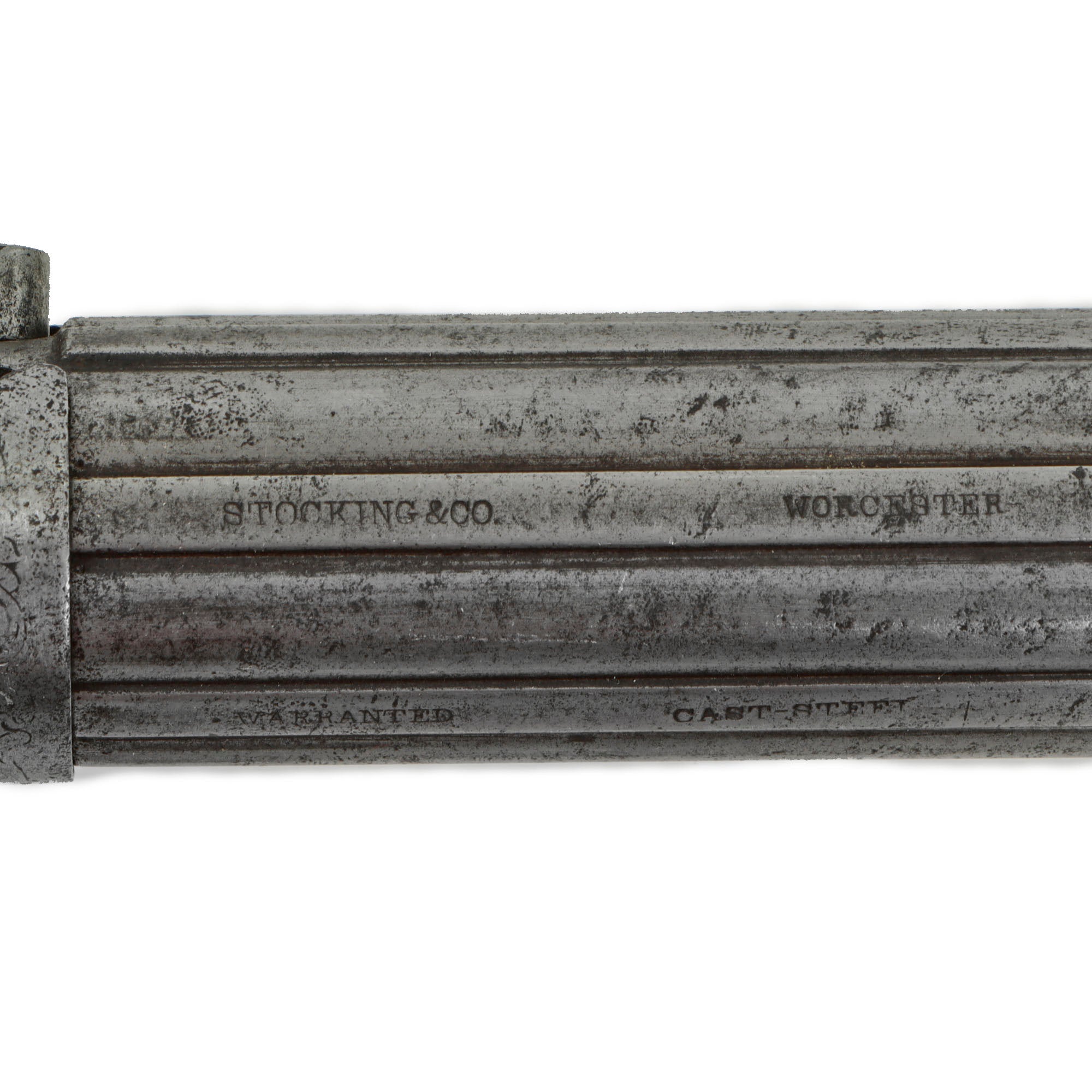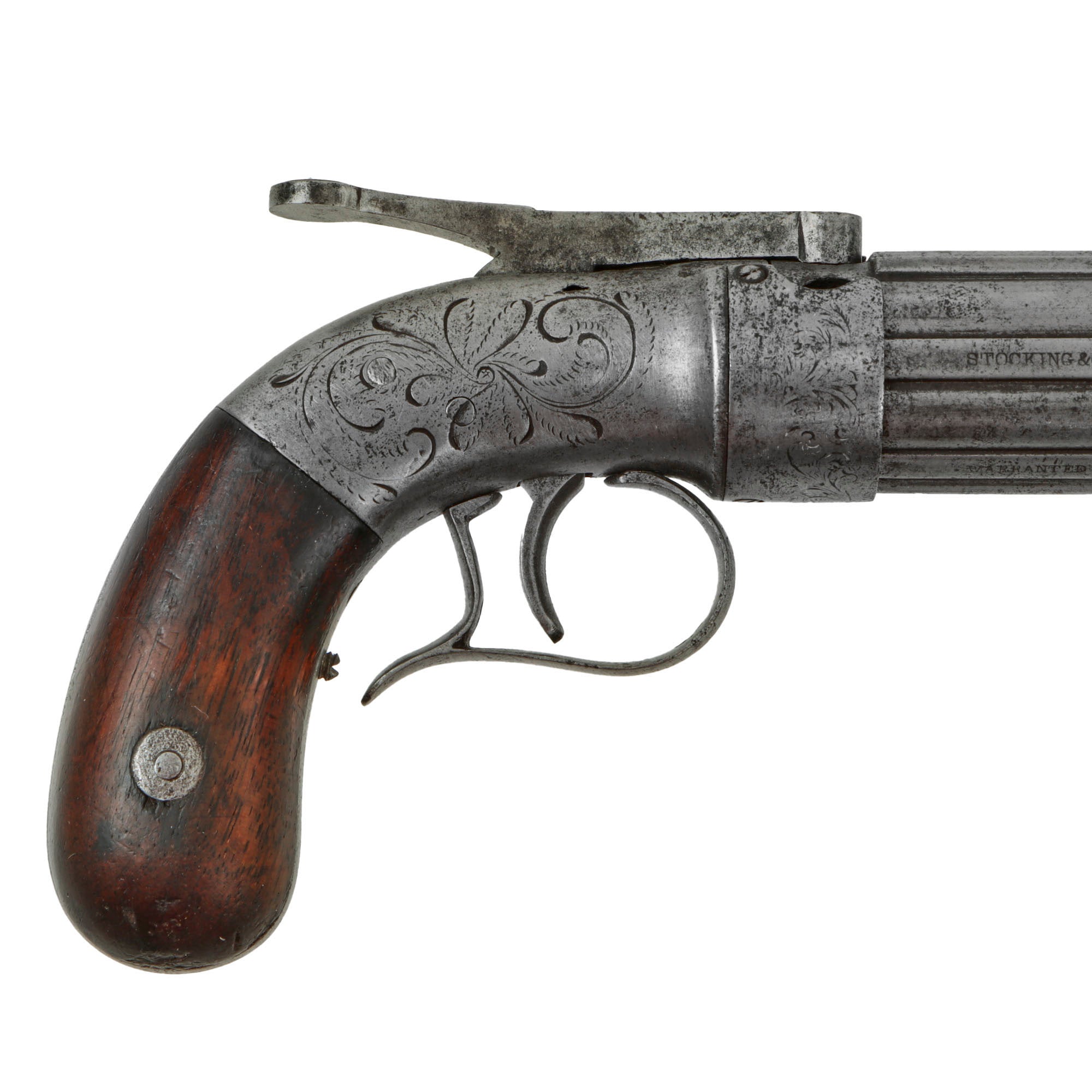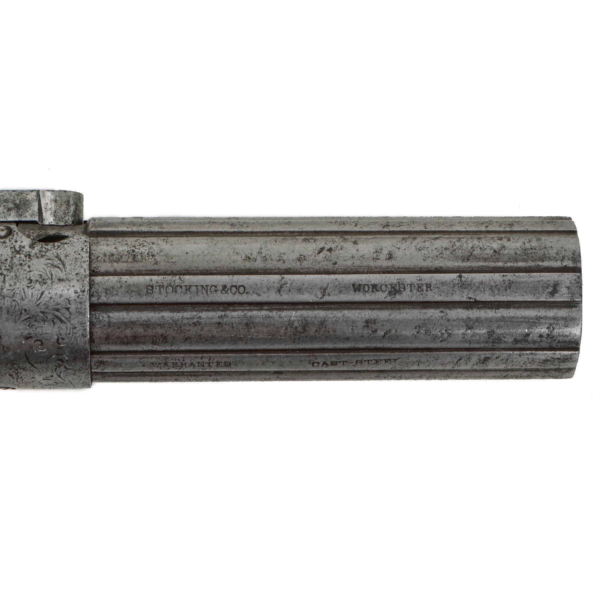 Original Item: Only One Available. This is an example of the unusual firearm system known as the "PEPPERBOX" revolver, where instead of a cylinder with a single barrel, the gun features assembly of multiple barrels. They were so named because the muzzle is similar in appearance to the business end of a Pepper Pot from the the early days of Queen Victoria: a circle of round holes. In very nice used condition, .28 caliber six shot percussion pepperbox revolver was manufactured by Stocking & Co. of Worcester, Massachusetts during the early 1850s. It measures 7 1/2 inches in overall length, with a 3 1/2 inch long barrel/cylinder. It is quite nicely engraved on both sides of the action, as well as on the barrel's flash guard.