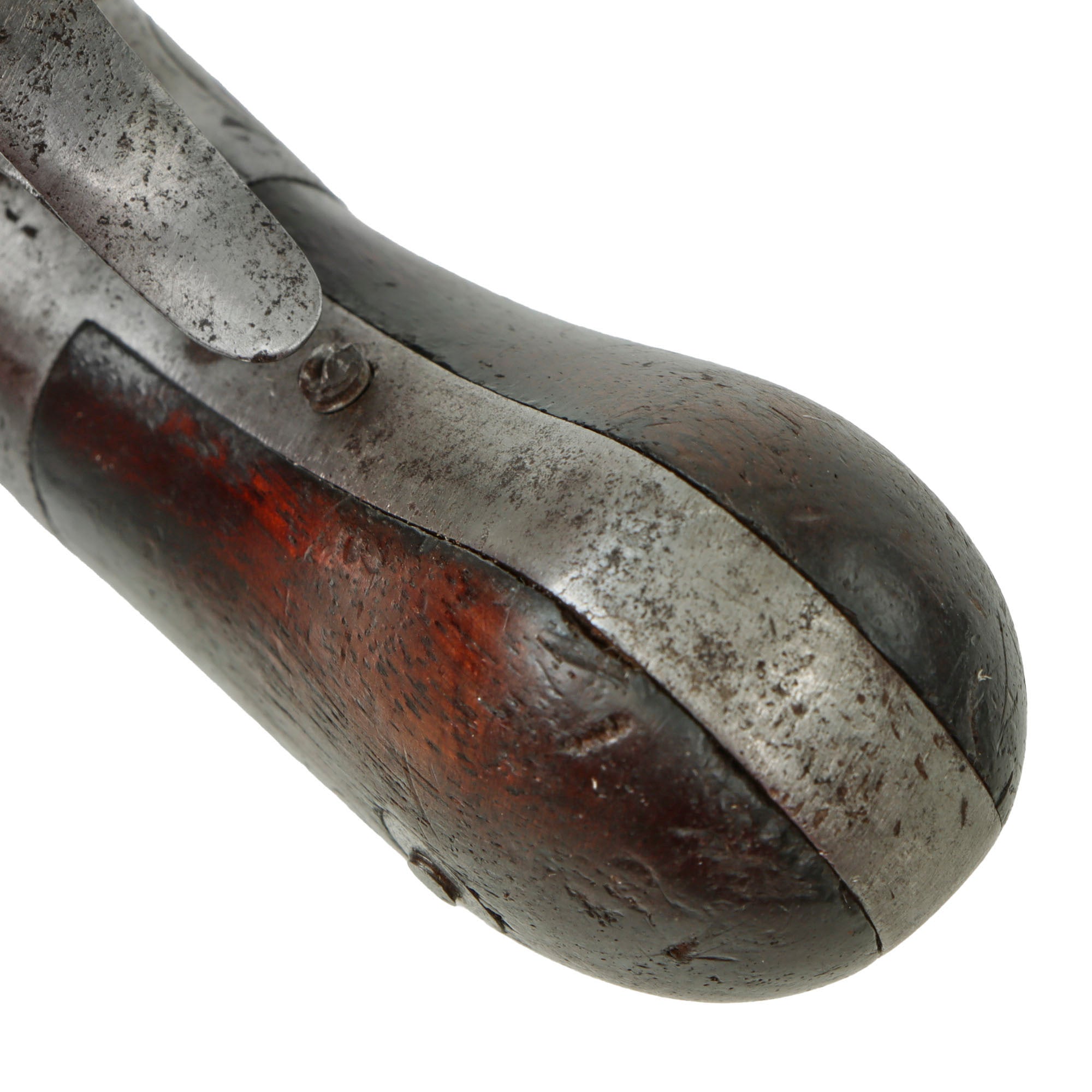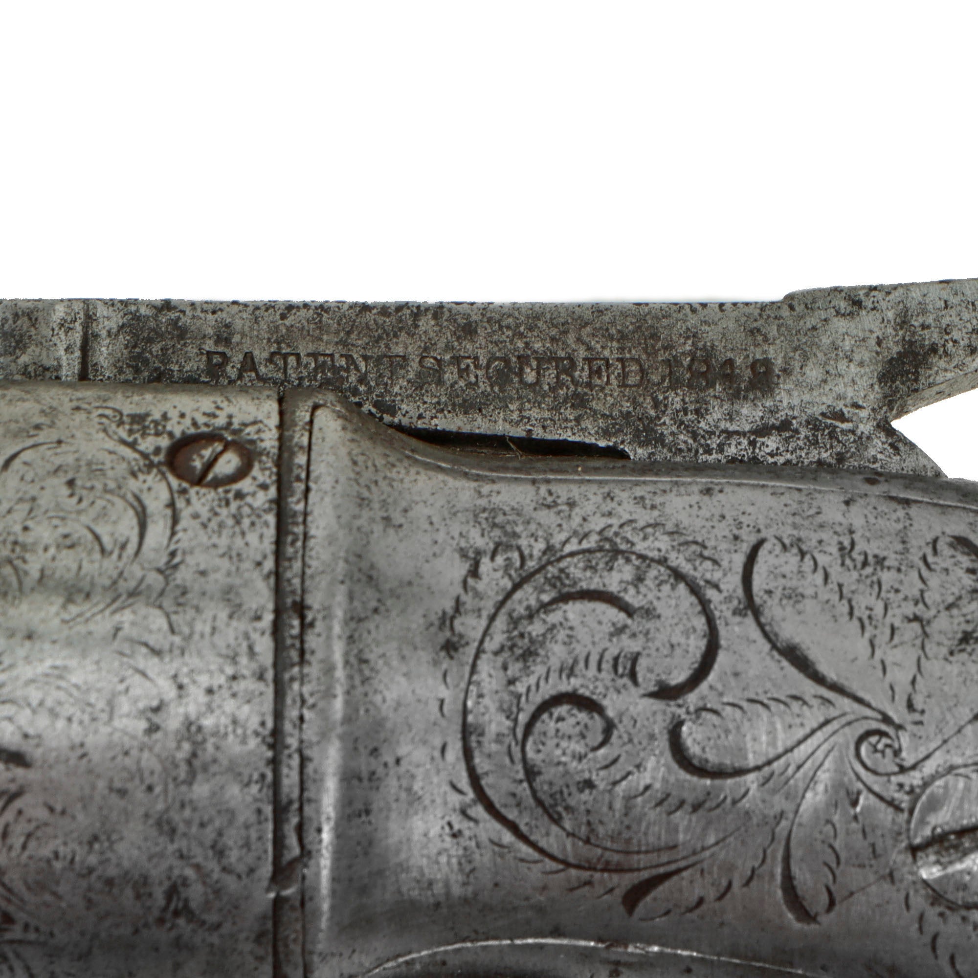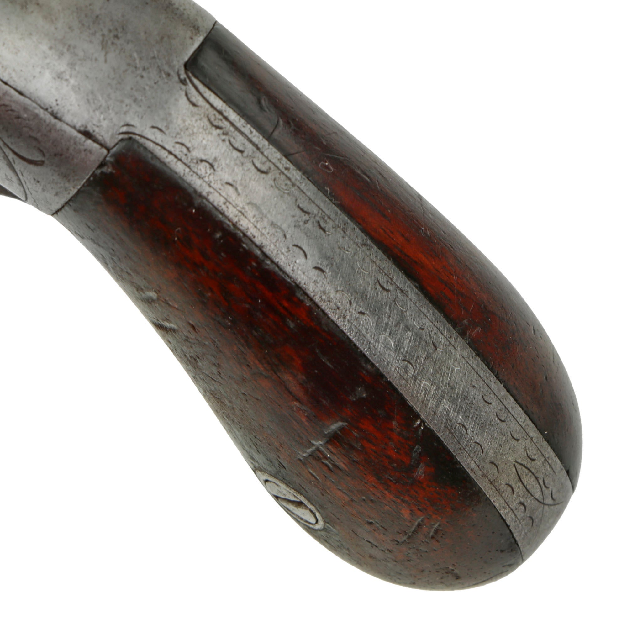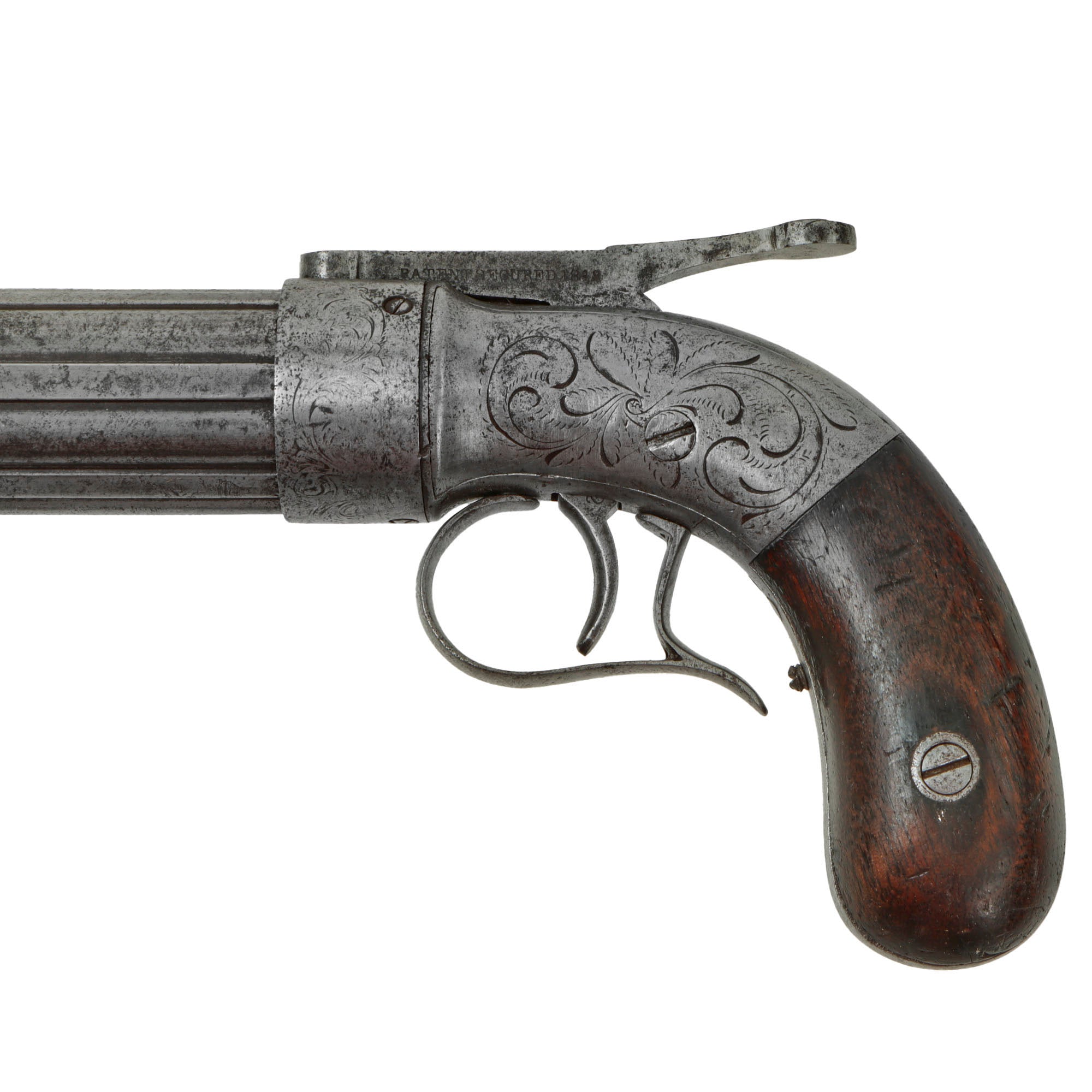 Original Item: Only One Available. This is an example of the unusual firearm system known as the "PEPPERBOX" revolver, where instead of a cylinder with a single barrel, the gun features assembly of multiple barrels. They were so named because the muzzle is similar in appearance to the business end of a Pepper Pot from the the early days of Queen Victoria: a circle of round holes. In very nice used condition, .28 caliber six shot percussion pepperbox revolver was manufactured by Stocking & Co. of Worcester, Massachusetts during the early 1850s. It measures 7 1/2 inches in overall length, with a 3 1/2 inch long barrel/cylinder. It is quite nicely engraved on both sides of the action, as well as on the barrel's flash guard.