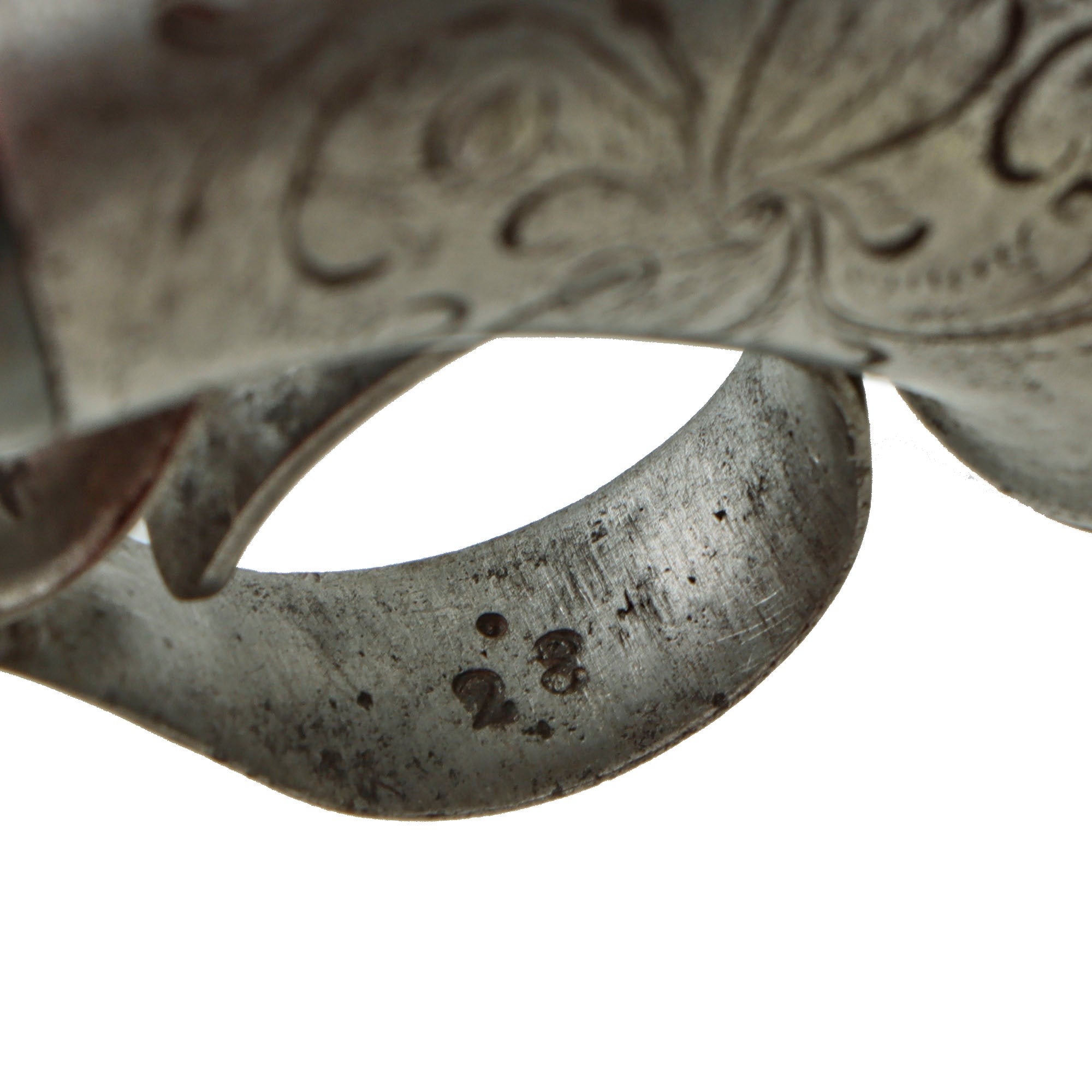The revolver is marked with serial number 32 on the cylinder, trigger guard, frame under the grips, trigger, and on the main spring, though the grip scales are both marked 23, very possibly a typo. We would definitely consider this to be an "Mostly Matching" example, and we very much feel that the grip scales were simply mis-marked. It is also marked on the flats between the barrels with the maker information, which is in the reverse direction from what we are used to seeing:-
