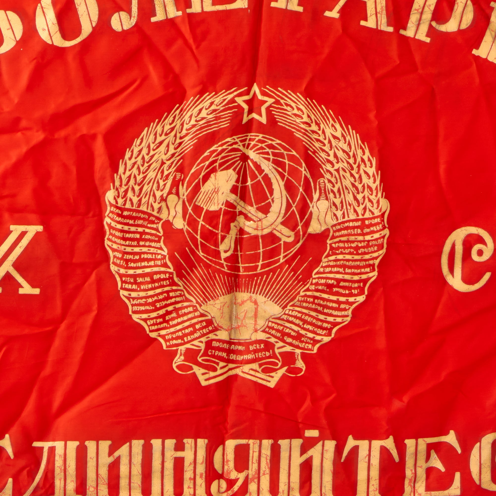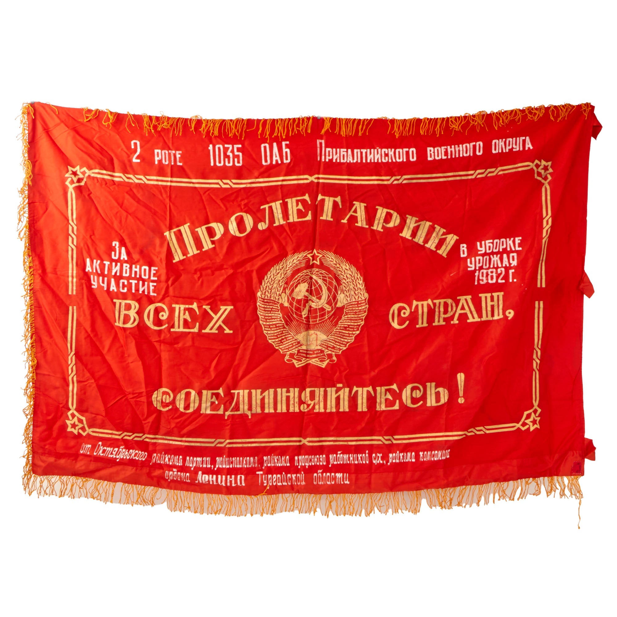 Original Item. Only One Available. Soviet Competition banners were awards given to individuals or teams for excelling in various fields, particularly in the Soviet Union's planned economy and industrial production. This is one such flag, with one side bearing the Hammer & Sickle over the Earth with the bottom scroll reading PROLETARIANS OF ALL COUNTRIES, UNITE! Under this emblem reads We arrive at the victory of communist labor! And the other side bearing a great motif of Lenin and Marx standing together over the award information.