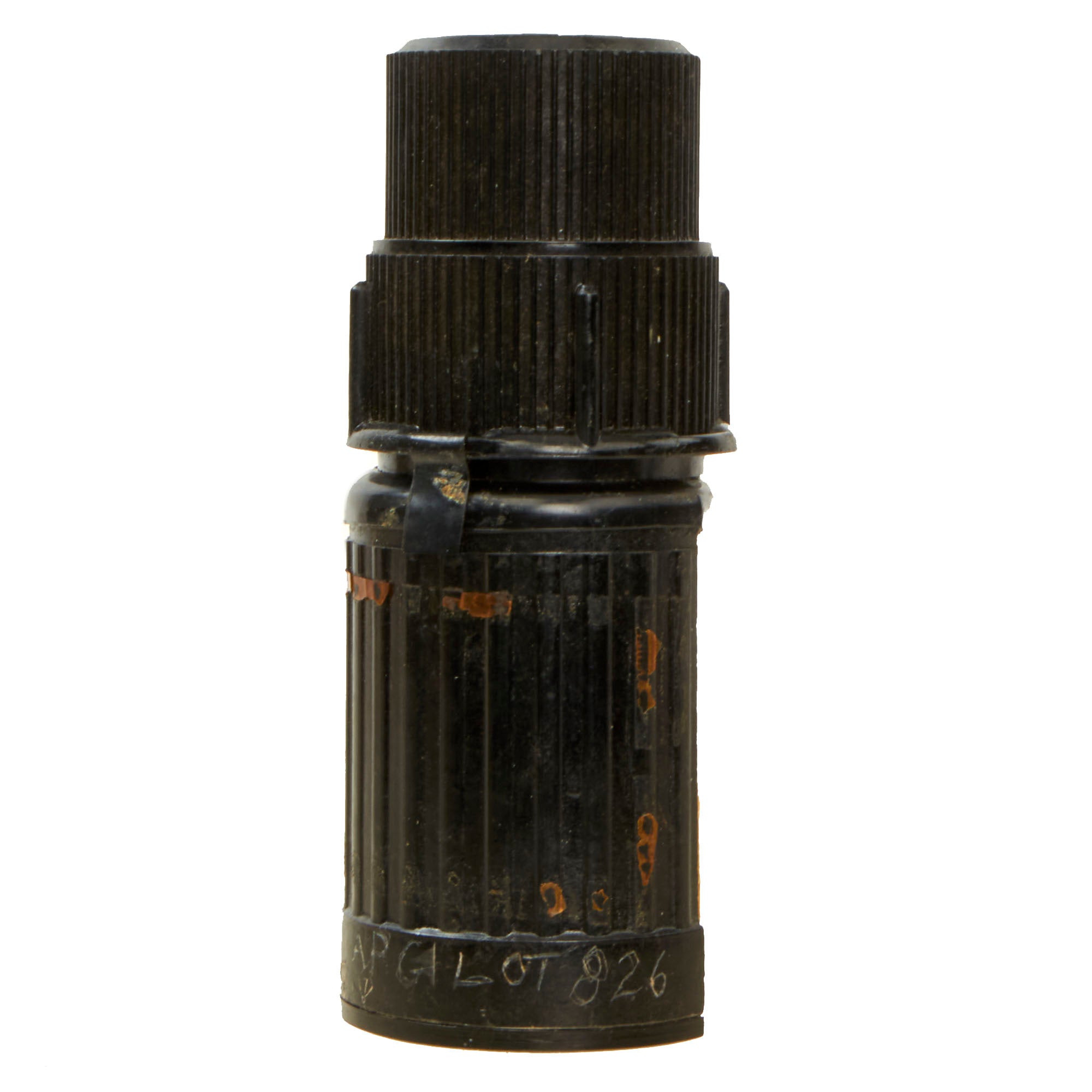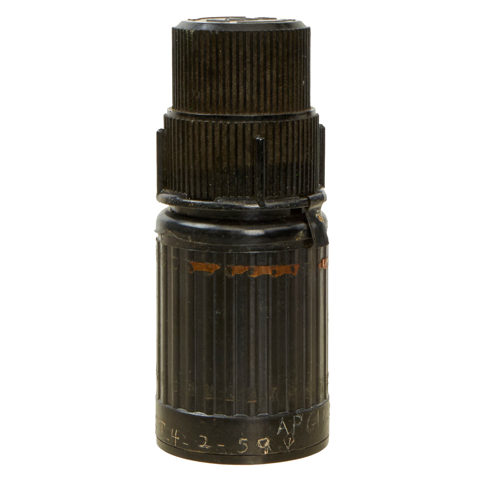The grenades are black and unmarked with a coat of arms or grenade model number molded on the top of the safety cap. This grenade has a black bakelite casing and was used as an offensive grenade and acts very largely by blast effect. The maximum effect is obtained at 2 metres and it is said to be effective at 3.5 metres with a deterrent effect at 10 metres radius. The impact fuze is similar in function to the British No 247 all-ways-acting fuze.