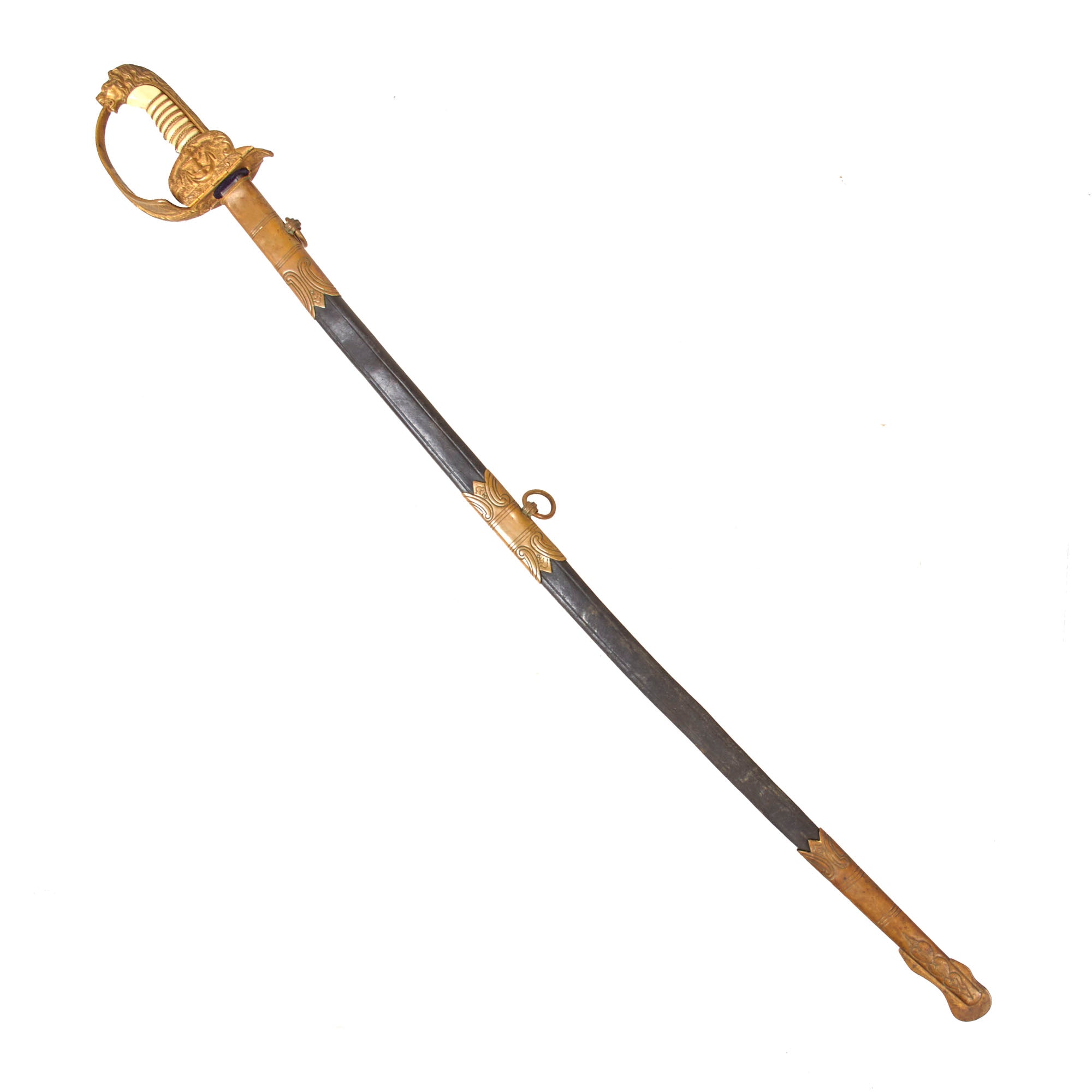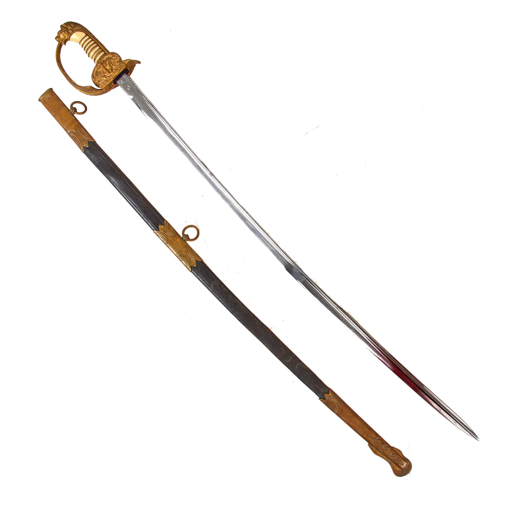 Original German WWII Kriegsmarine Navy Officer Pipe Back Lion Head Sword by WKC Waffenfabrik with Leather Scabbard