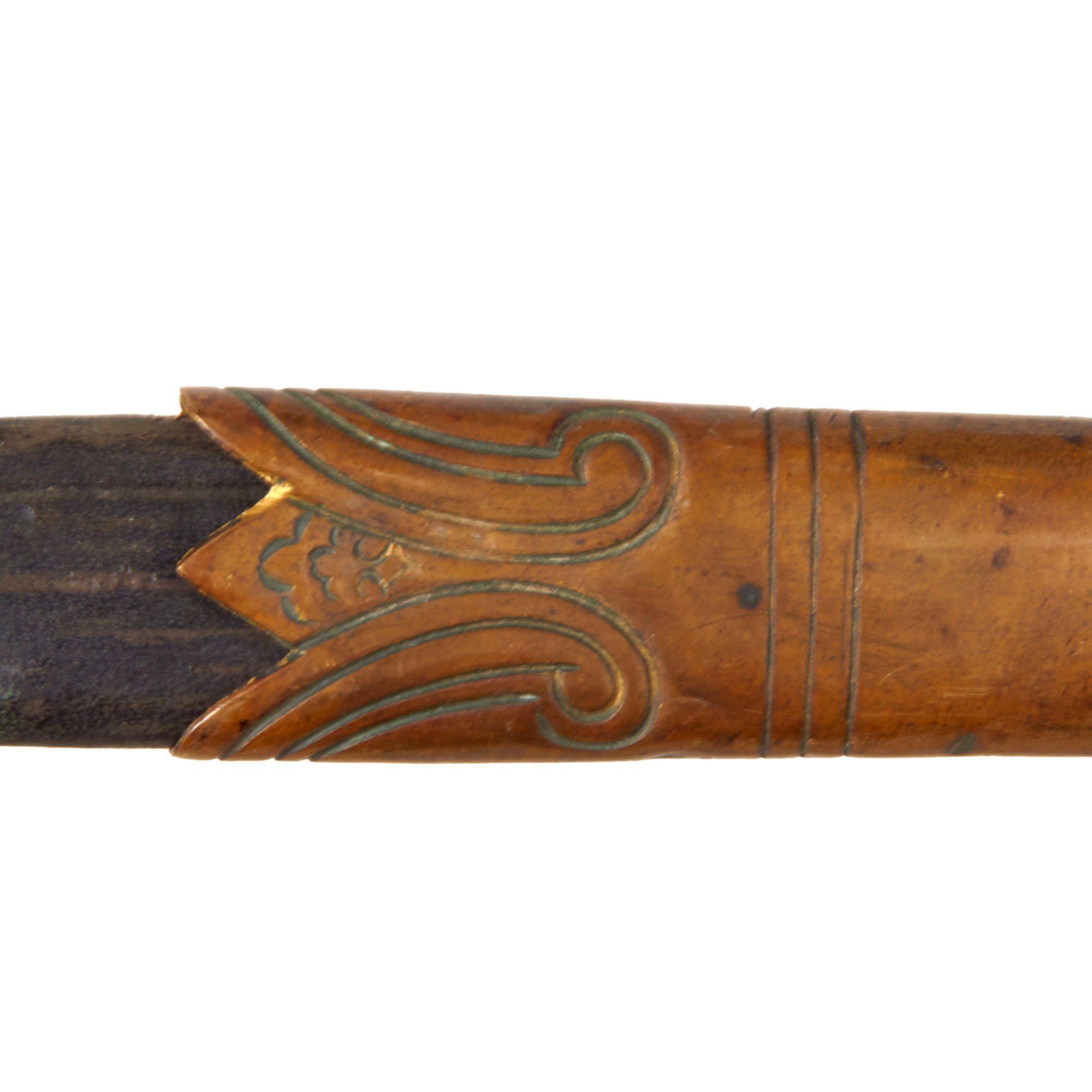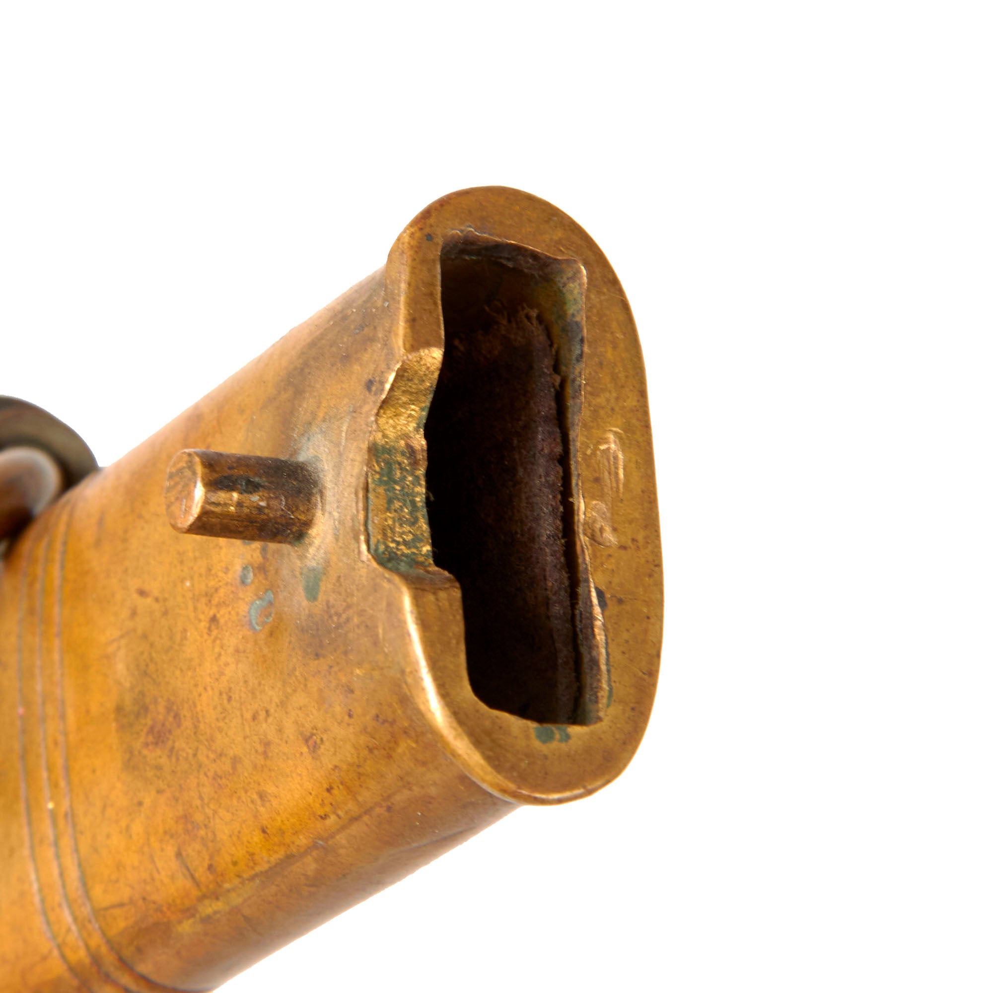 The included scabbard is still in very good condition, made from stiff black finished leather with brass fittings, which were originally gilt. These now have lost almost all of the gilding, except at the very top near the scabbard lock, and display a lovely matured "mustard" patina. The throat and middle fitting have brass hanger rings in serrated ferrules. The leather has become stiffer and shrunk a bit, however the stitching on the back is still solid. We did note that the drag has had the staple retaining it pull out, so it now can fall off the bottom of the scabbard.
