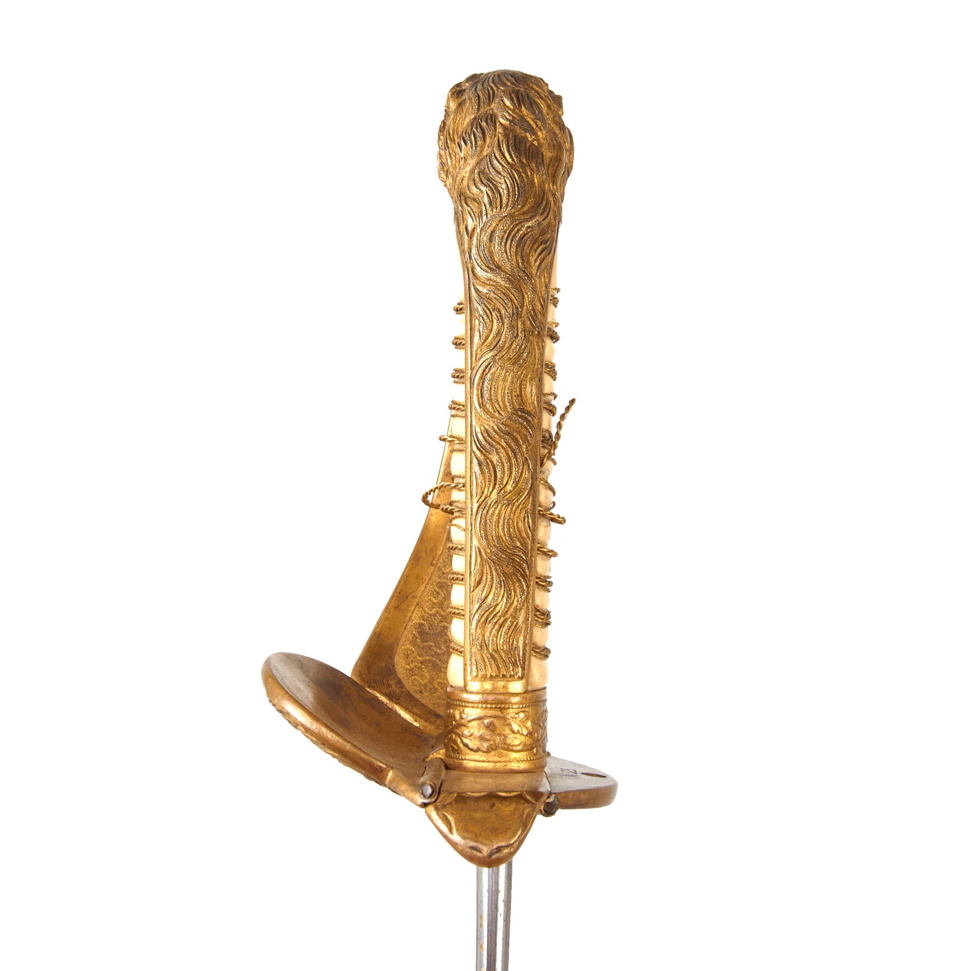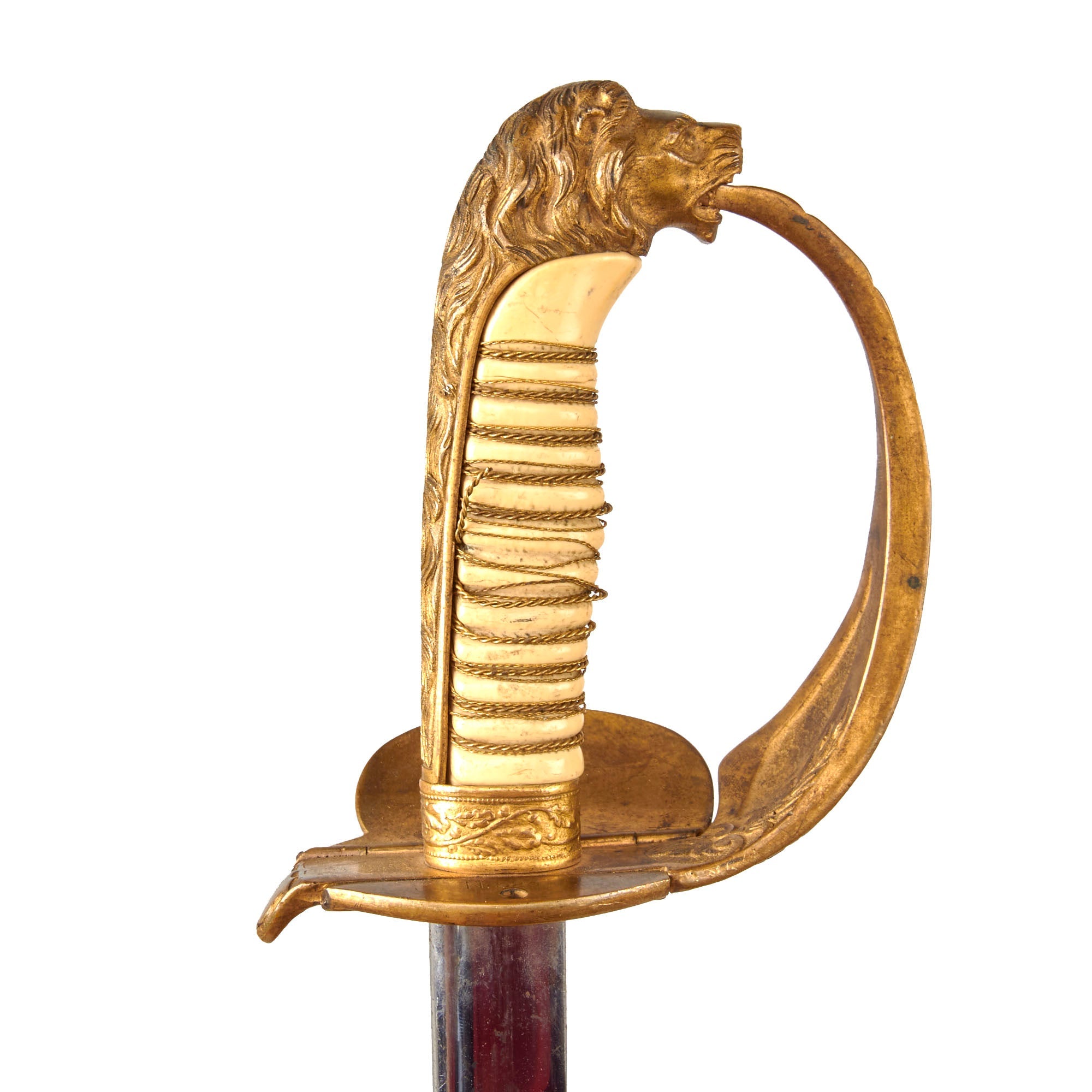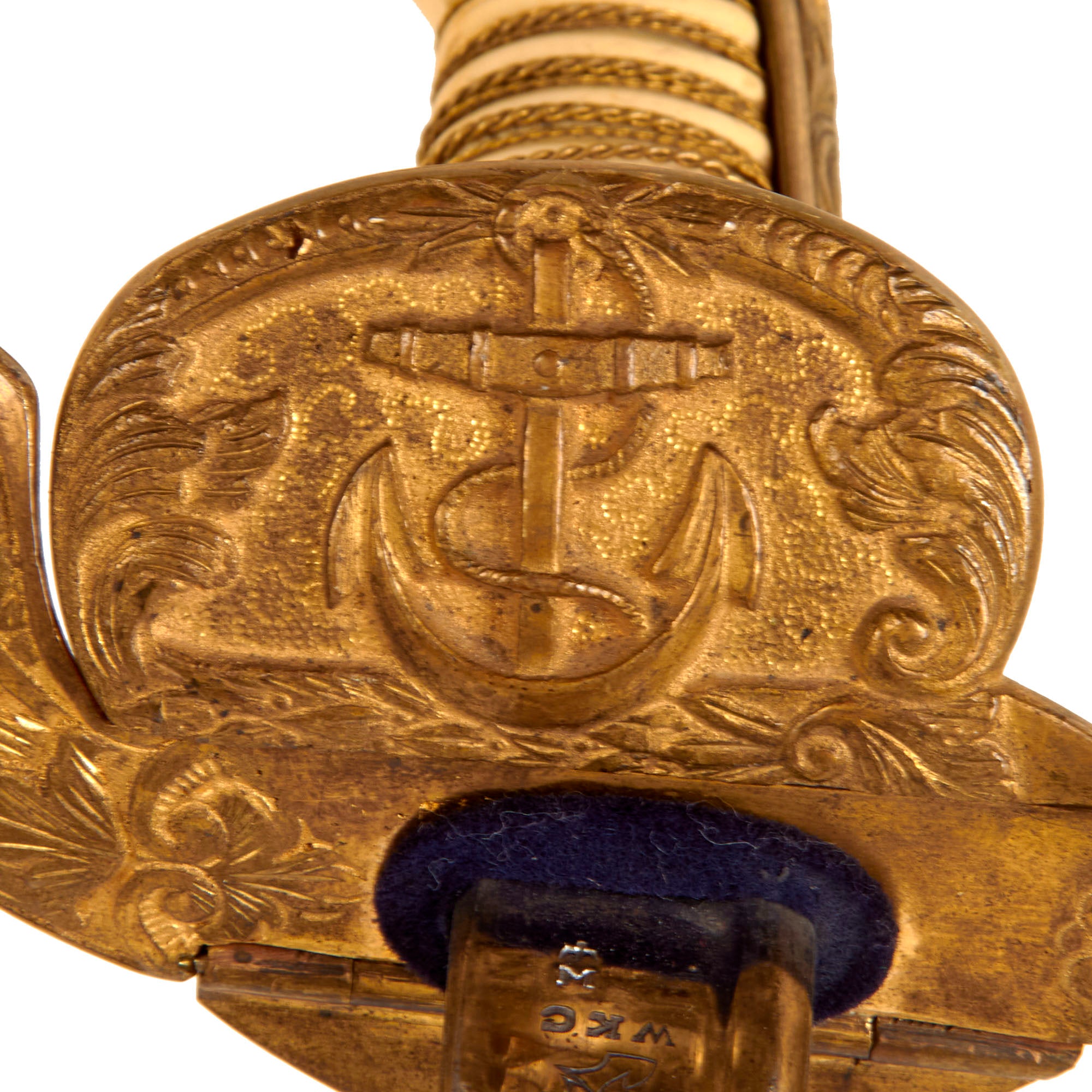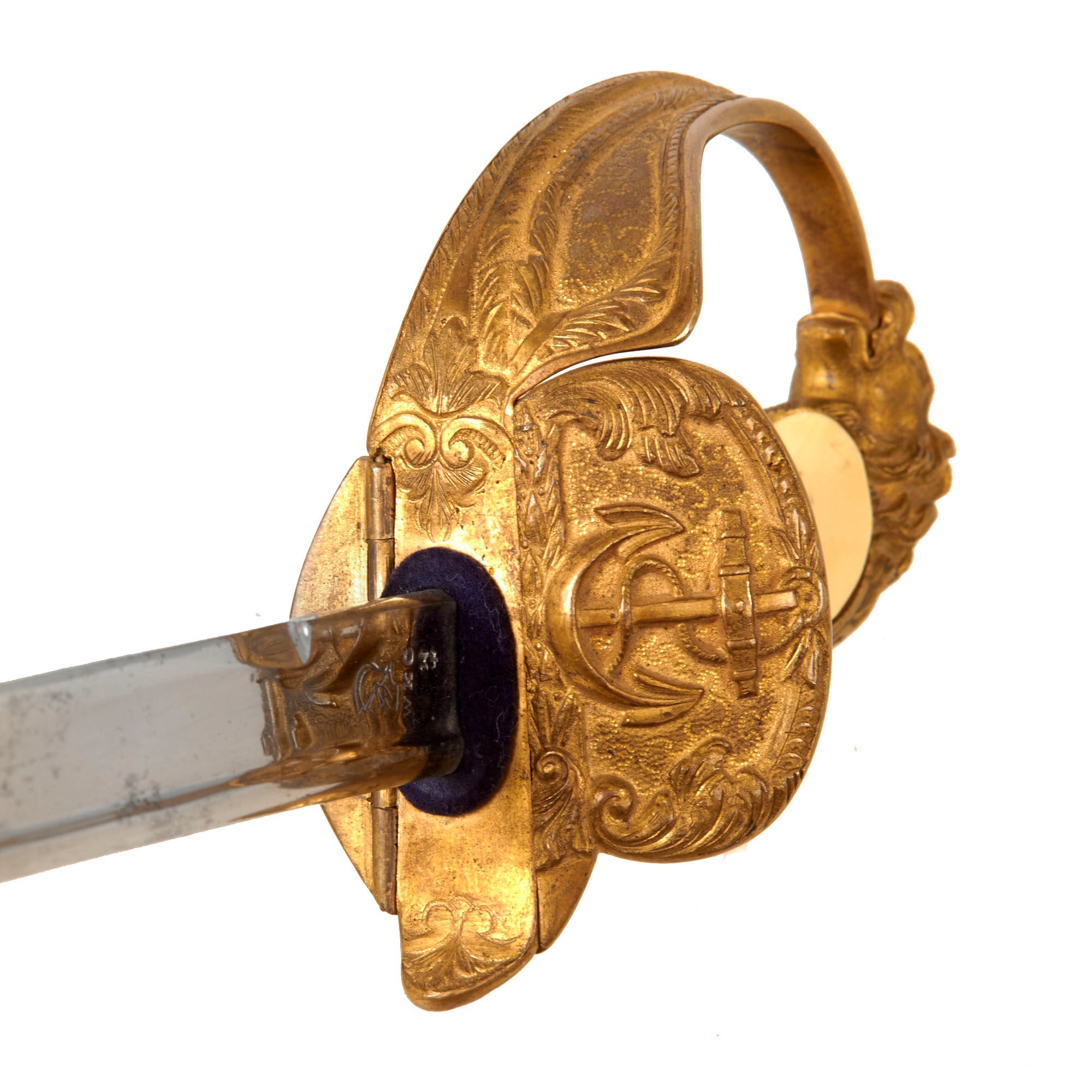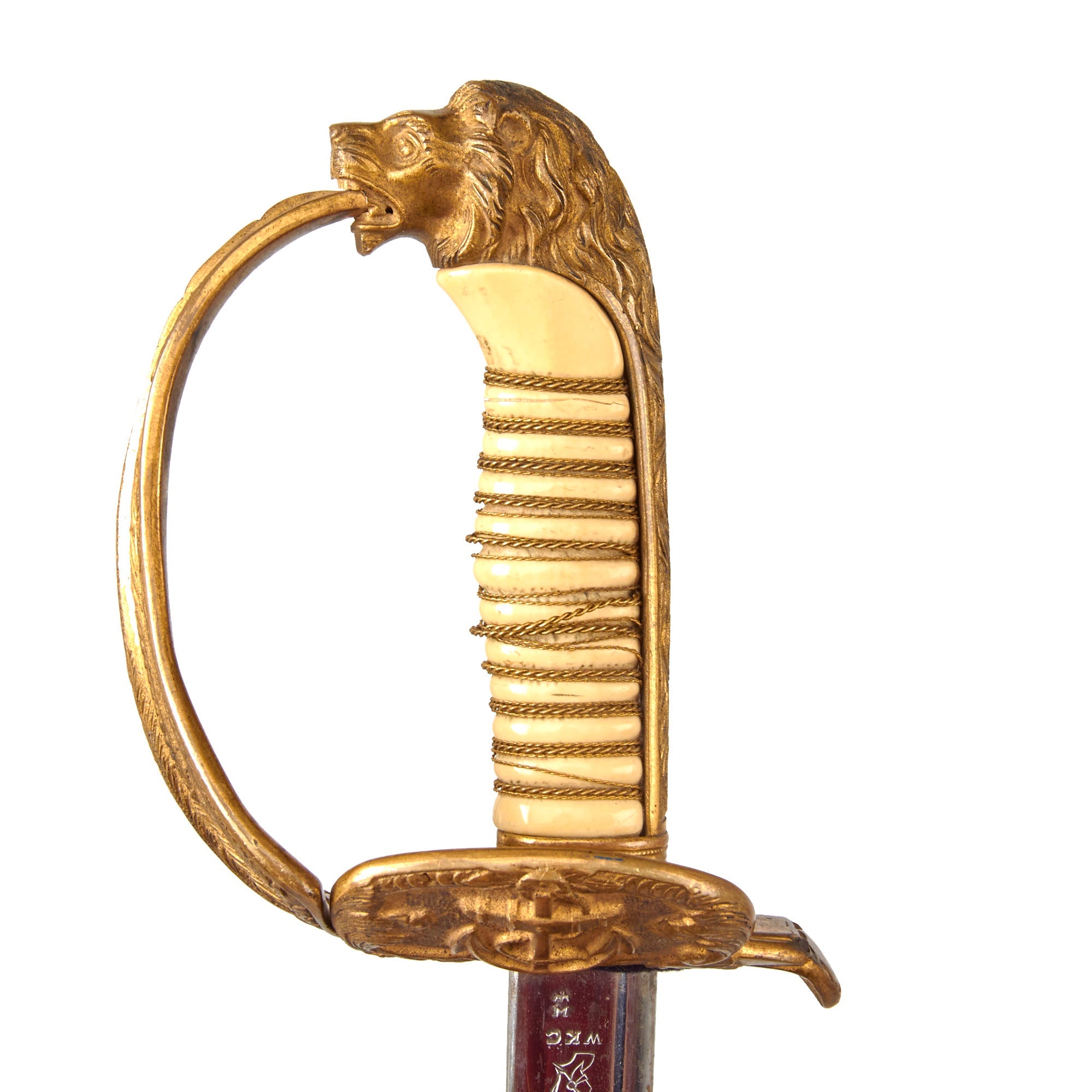 • Original Item: Only One Available. This is a lovely example of a rare Kriegsmarine Navy Lion Head Officer's Sword, made by the firm WKC Waffenfabrik of Solingen, the legendary "City of Blades" in Western Germany, previously Weyersberg Kirschbaum & Cie. We have very seldom had examples of naval officer swords, as they often went down with the ships, and also were not something that would be picked up on the battlefield or during a surrender. The navy also took a lot longer to adopt NSDAP symbols, and this sword bears none, which meant that it could be kept and displayed much more openly. This lovely example features a lovely nickel-plated "Pipeback" blade, also called a "quillback", which are quite decorative, and comes complete with an original brass fitted leather scabbard.