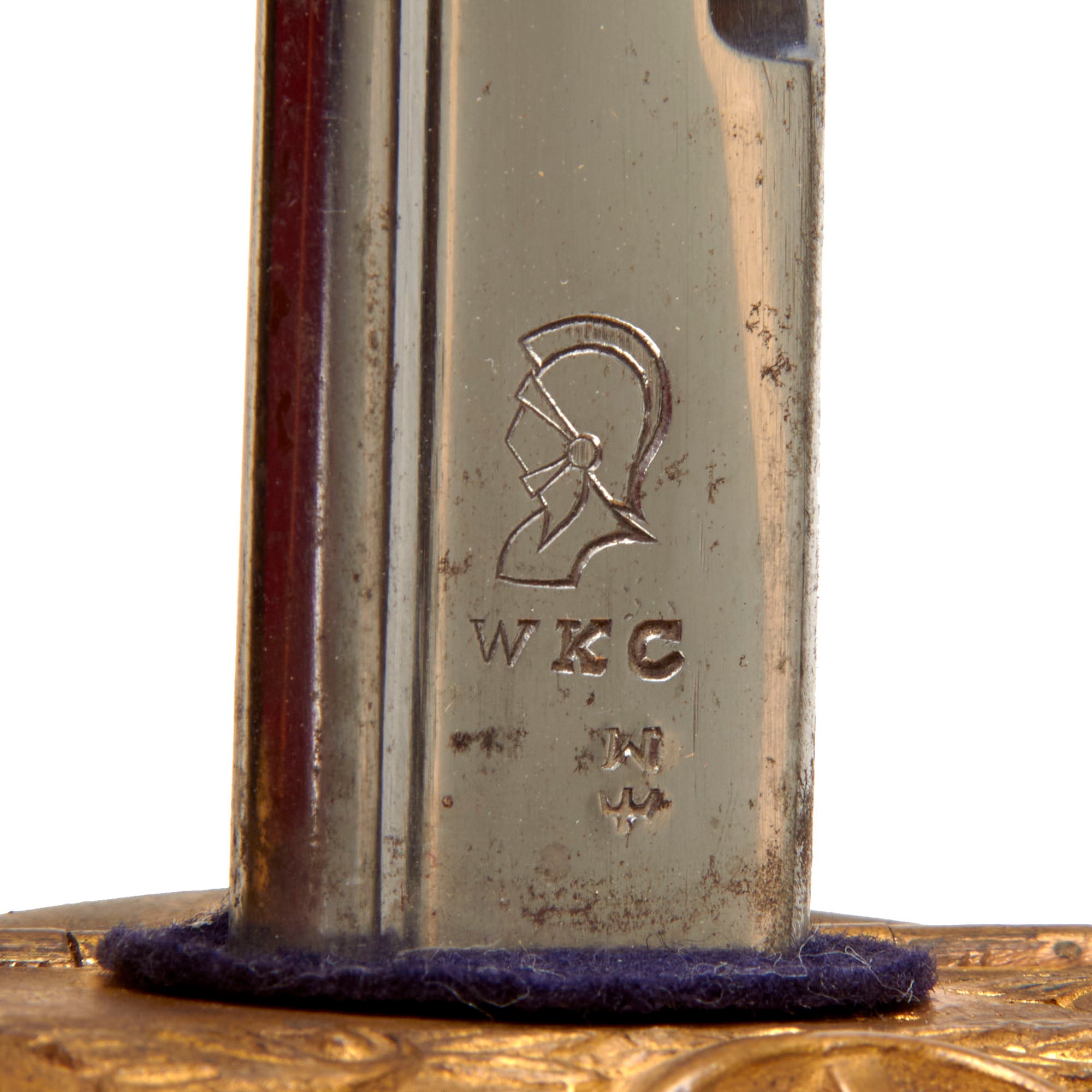 Per J. Anthony Carter’s work GERMAN KNIFE AND SWORD MAKERS, the traditional manufacturing of swords at WKC dates back to the year 1774 when the Weyersberg first registered the ''Kings head'' as their trademark. Later in 1883 the company merged with the Kirschbaums and the company Weyersberg Kirschbaum & Cie was formed, which continued into the Weimar Period. It then rebranded as W.K.C. Waffenfabrik GmbH, and produced many edged weapons during the NSDAP Period. The company is still in operation today.