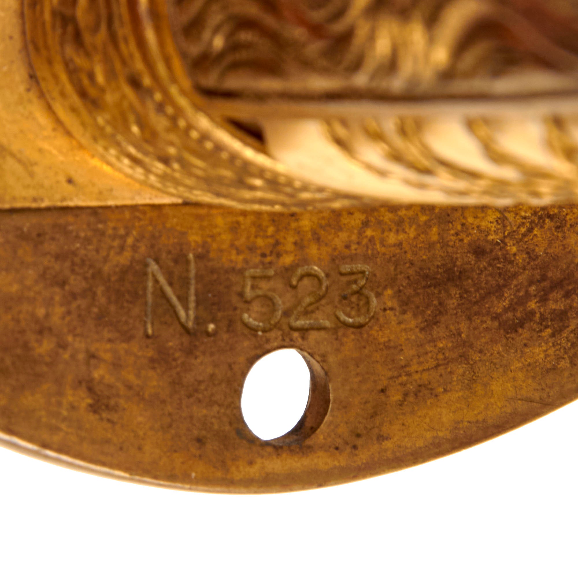As this is a naval sword, the grip of this example is a ivory white celluloid over a carved wood base, instead of the black seen on the army swords. The celluloid is in very good condition, having matured to a lovely color, though there is definitely age-related deterioration. It has a crack running all the way around on the first "rib" from the bottom. It is wrapped with a skein of 6 brass wires, twisted in pairs, with the center pair being slightly thicker, however the wrapping has become loose and broken away in places due to mishandling over the years. The hilt is still tight on the blade, with no wobble we can detect, and we noticed that the top of the lock flap is marked with N. 523, possibly a style number in the WKC catalog.