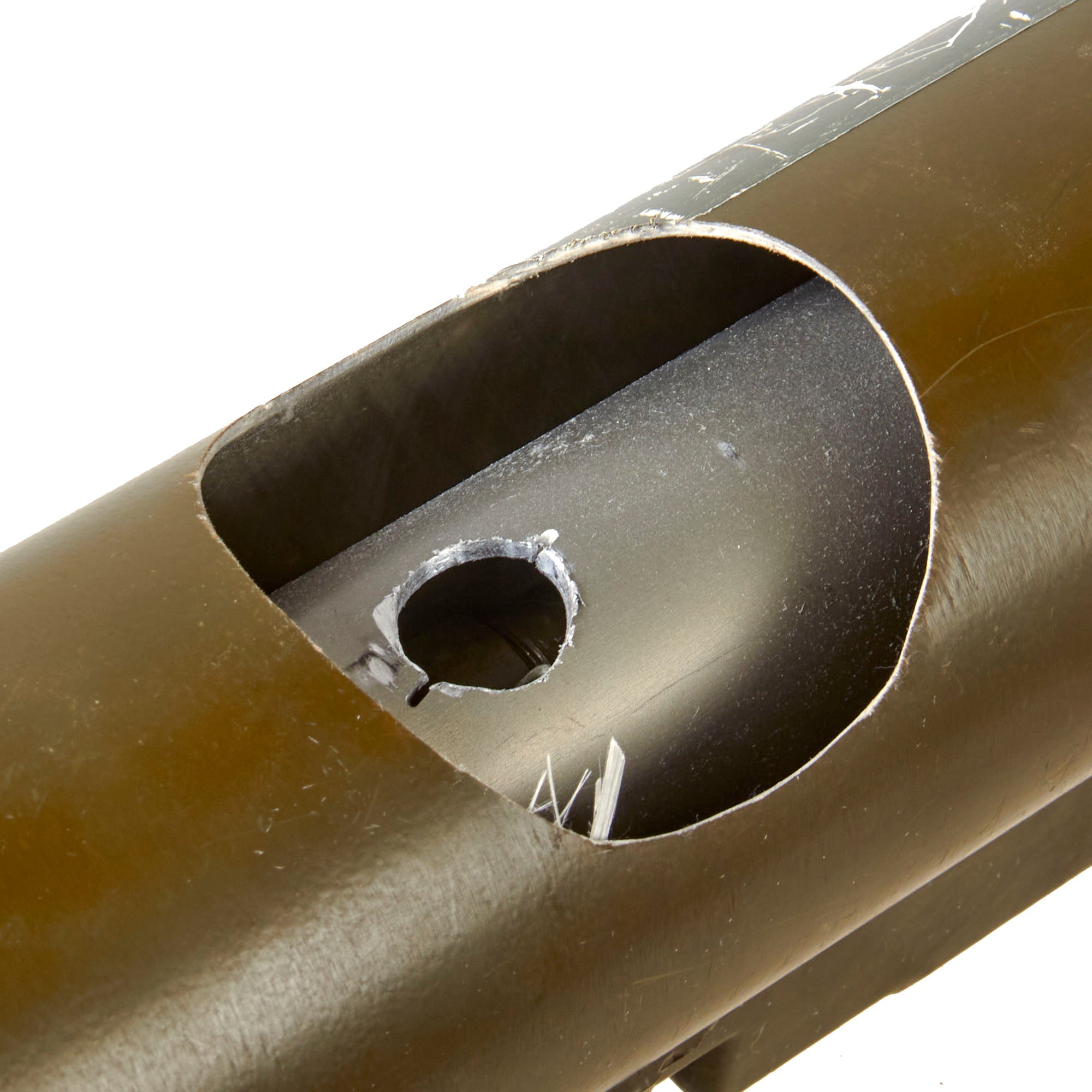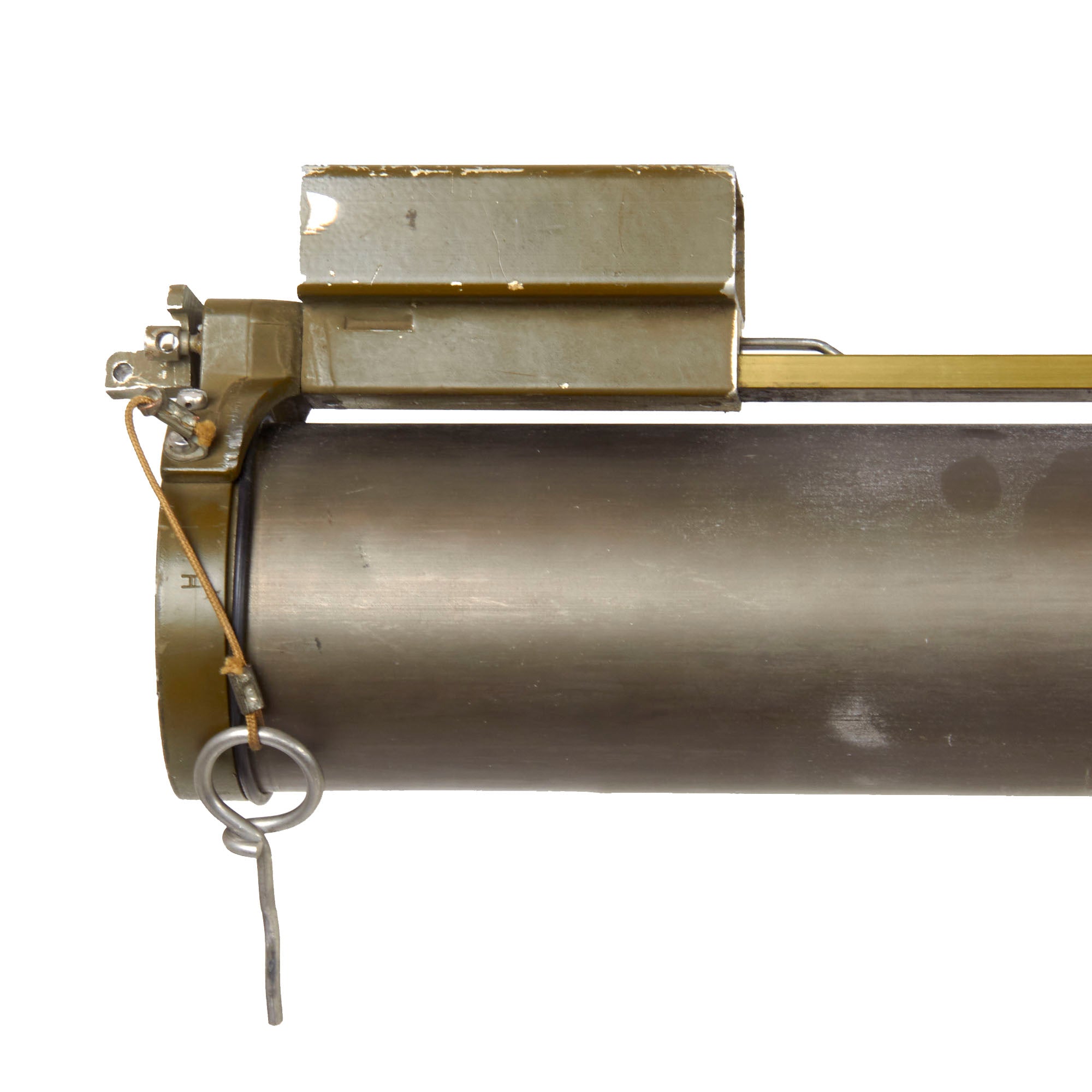 This very nice example has both the rear sight and the front sight, which are often seen missing. The front sight “glass” is intact, rare to see. The end cap and sling are present and the set still goes back together properly. This tube was fired, more than likely on a demo range, retained, repainted and repurposed as a training aid. It’s in really great condition.