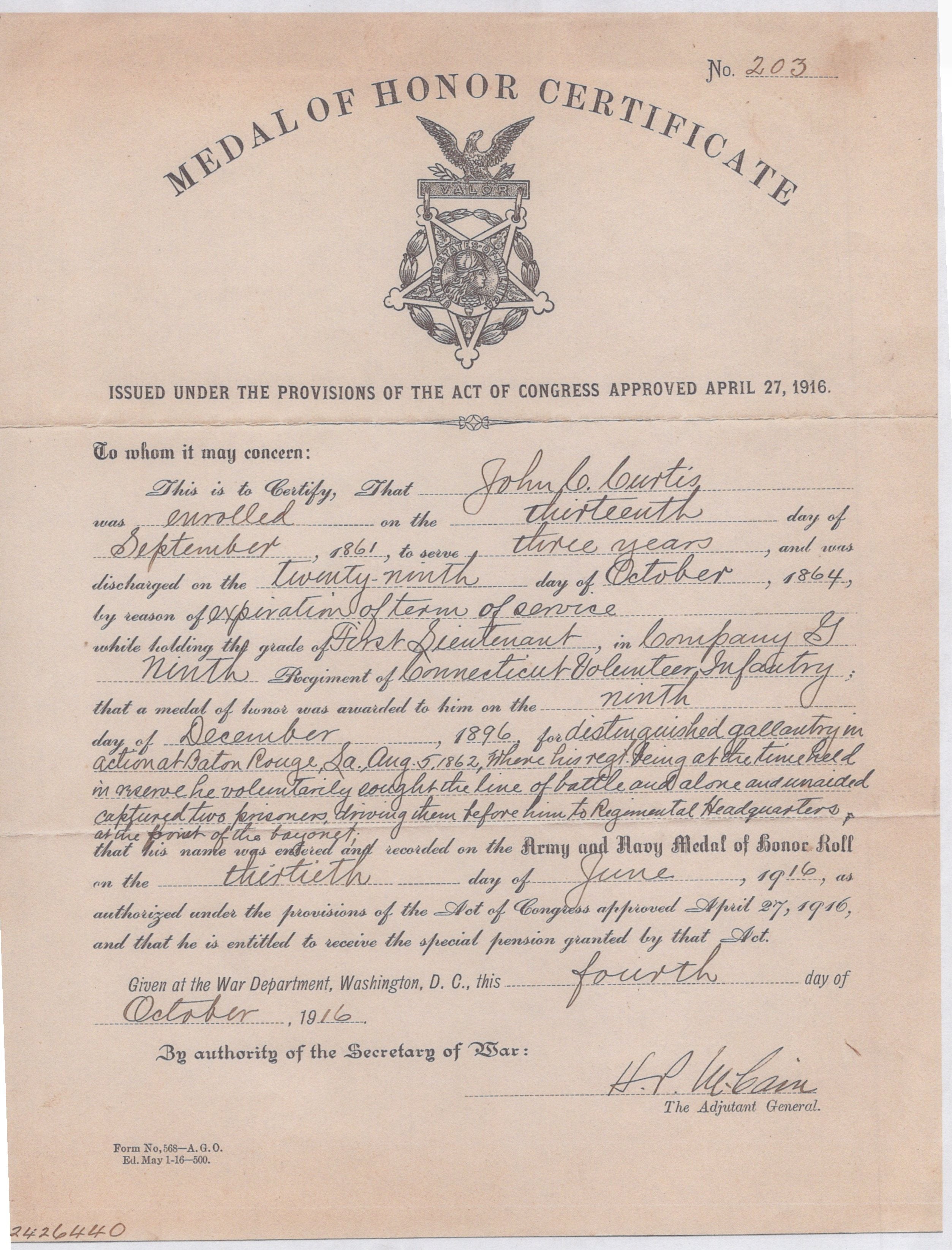 On August 5, 1862, as a Sergeant-Major at age 17, Curtis became instrumental in repulsing a Confederate attack aimed at recapturing Baton Rouge, Louisiana. On August 2nd, he was sent out on a lone patrol behind enemy lines to get information about the location and identity of the rebel units. He succeeded in locating a rebel scout patrol and in bringing back alive two members of this patrol with much of the information needed. His Medal of Honor Citation reads: