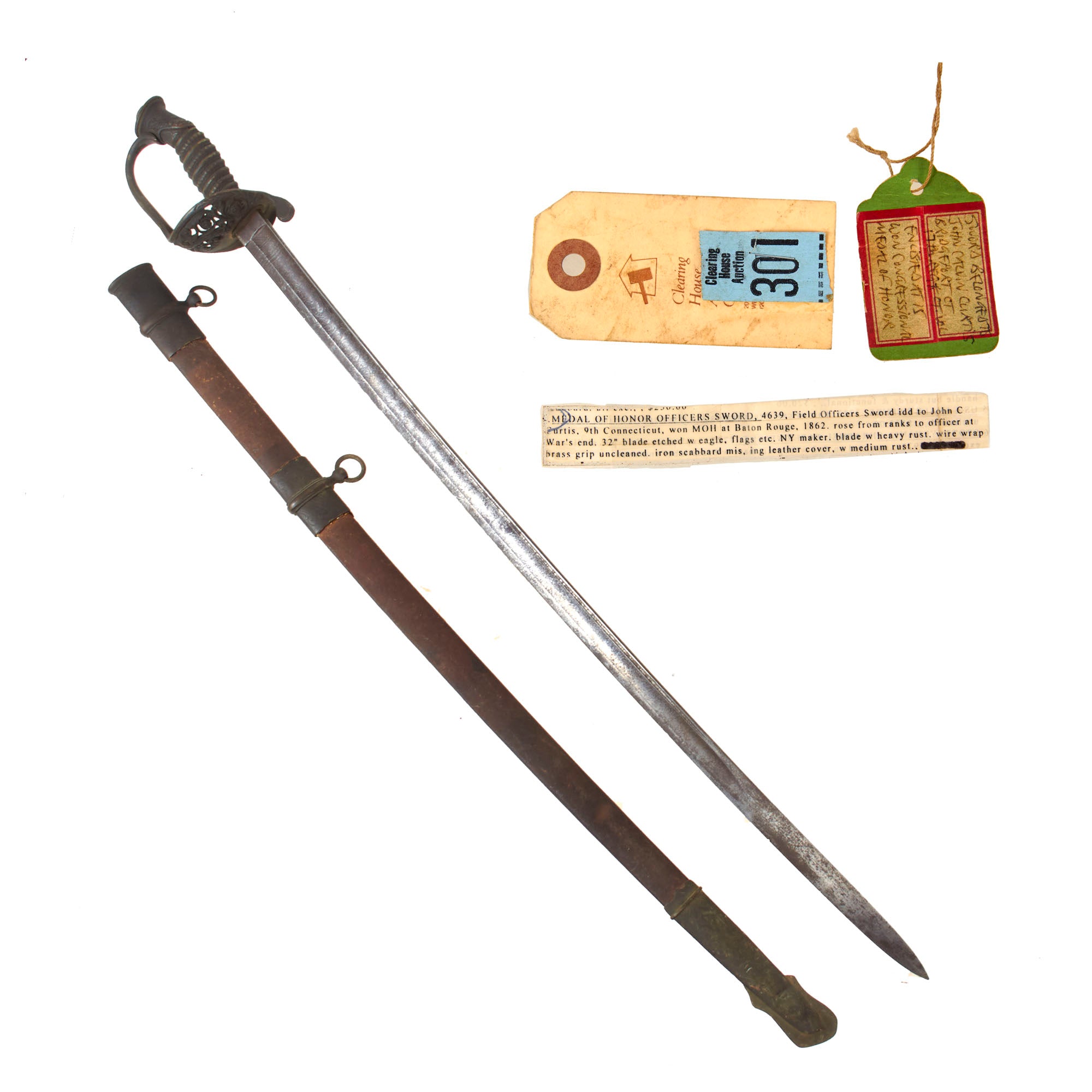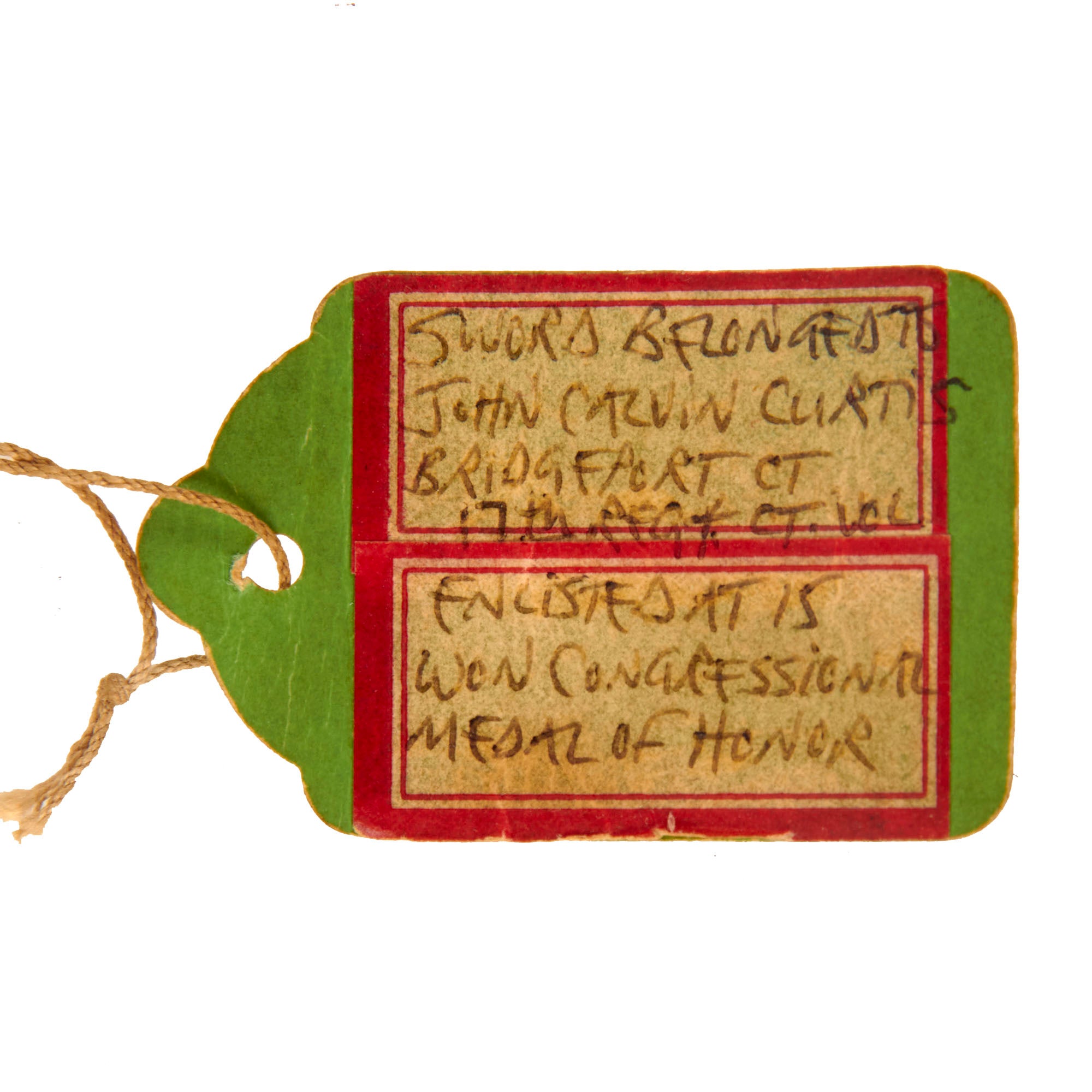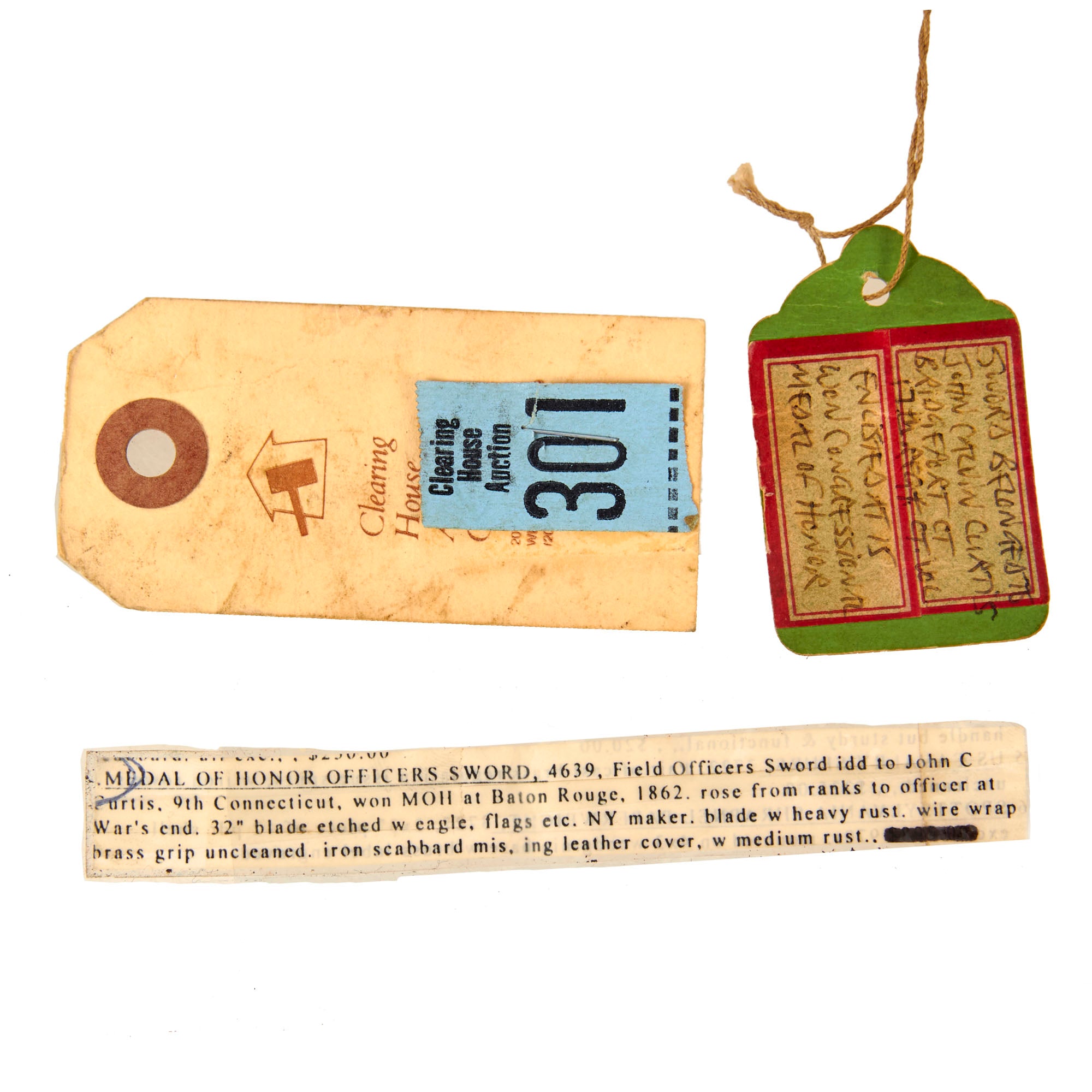 Original Item. One-of-a-Kind. John Calvin Curtis (April 17, 1845 – January 17, 1917) was a Lieutenant of the Ninth Regiment Connecticut Volunteer Infantry in the American Civil War, and a Medal of Honor recipient. Curtis first enlisted in the 9th Regiment Connecticut Volunteer Infantry on August 17th, 1861 at the age of 16. This outstanding M1850 Field Officer Sword comes with a handwritten tag by Norm Flayderan, one of the world's best-known antique arms dealers and authorities, an auction tag, and auction listing from when the sword was auctioned off in the 1960s. Also included is a great folder with 150+ pages of printed research on Curtis! On Curtis' gravestone is a photo of him carrying a sword much like this one, but we cannot say for certain if it's this exact example.