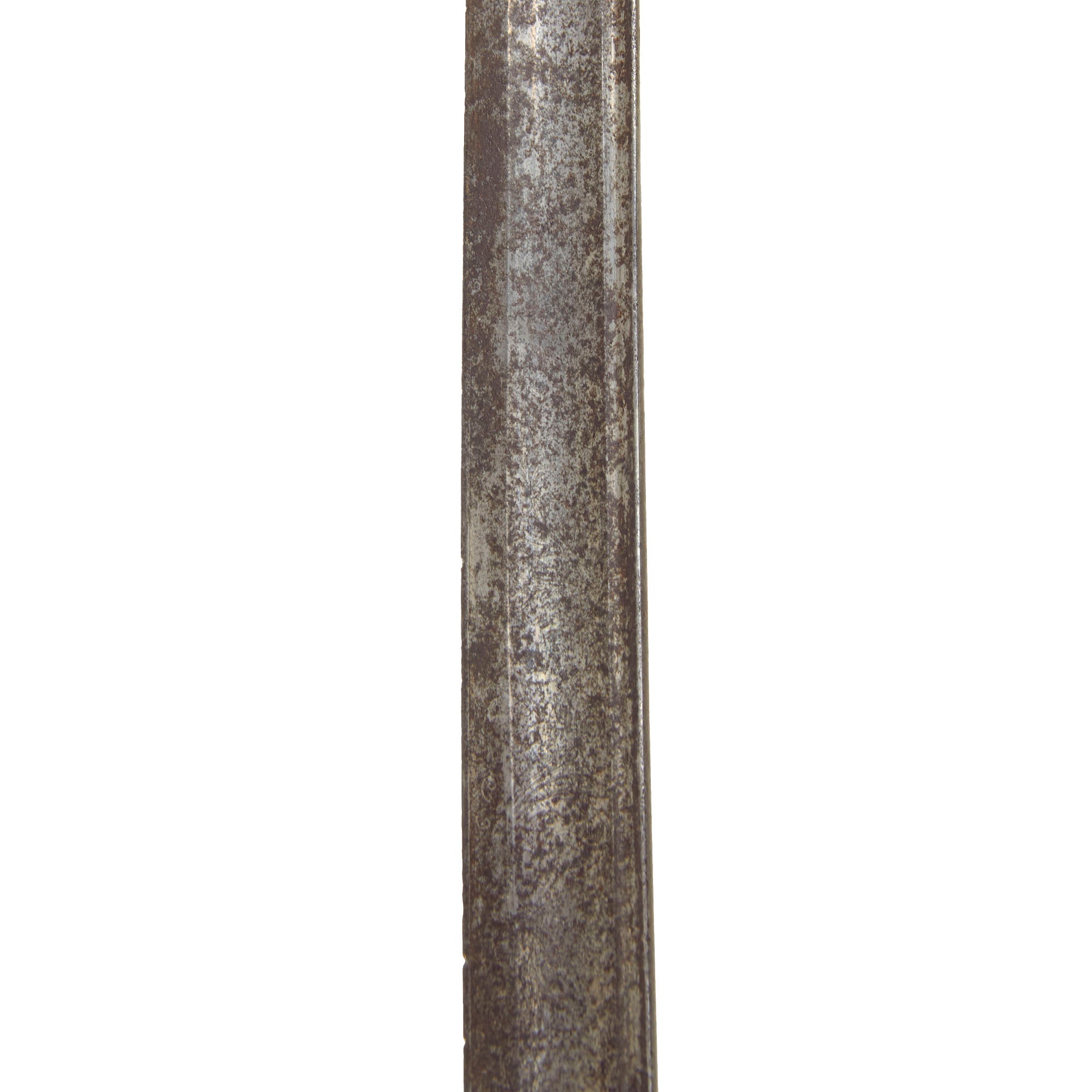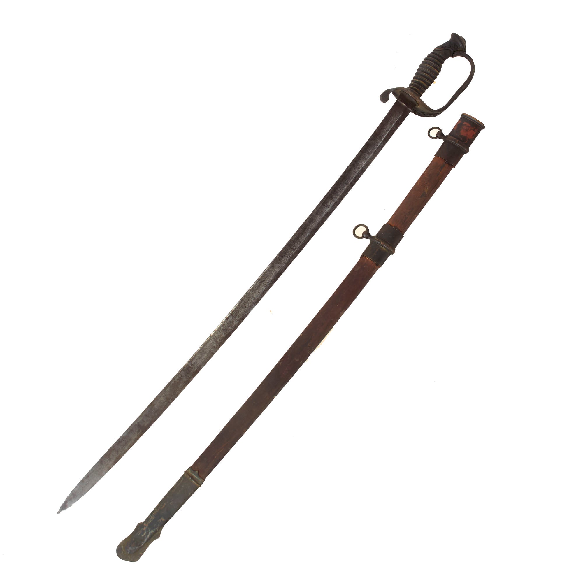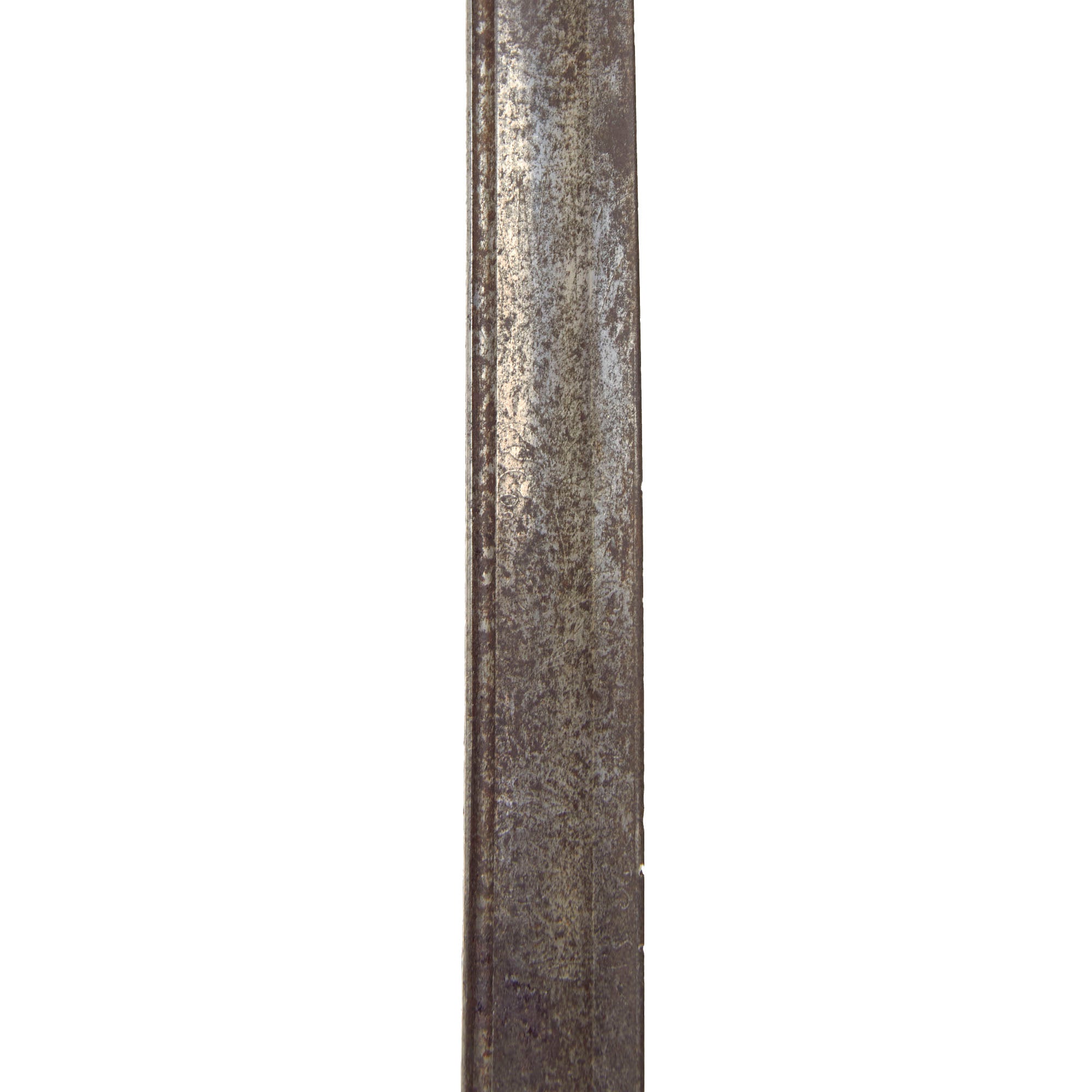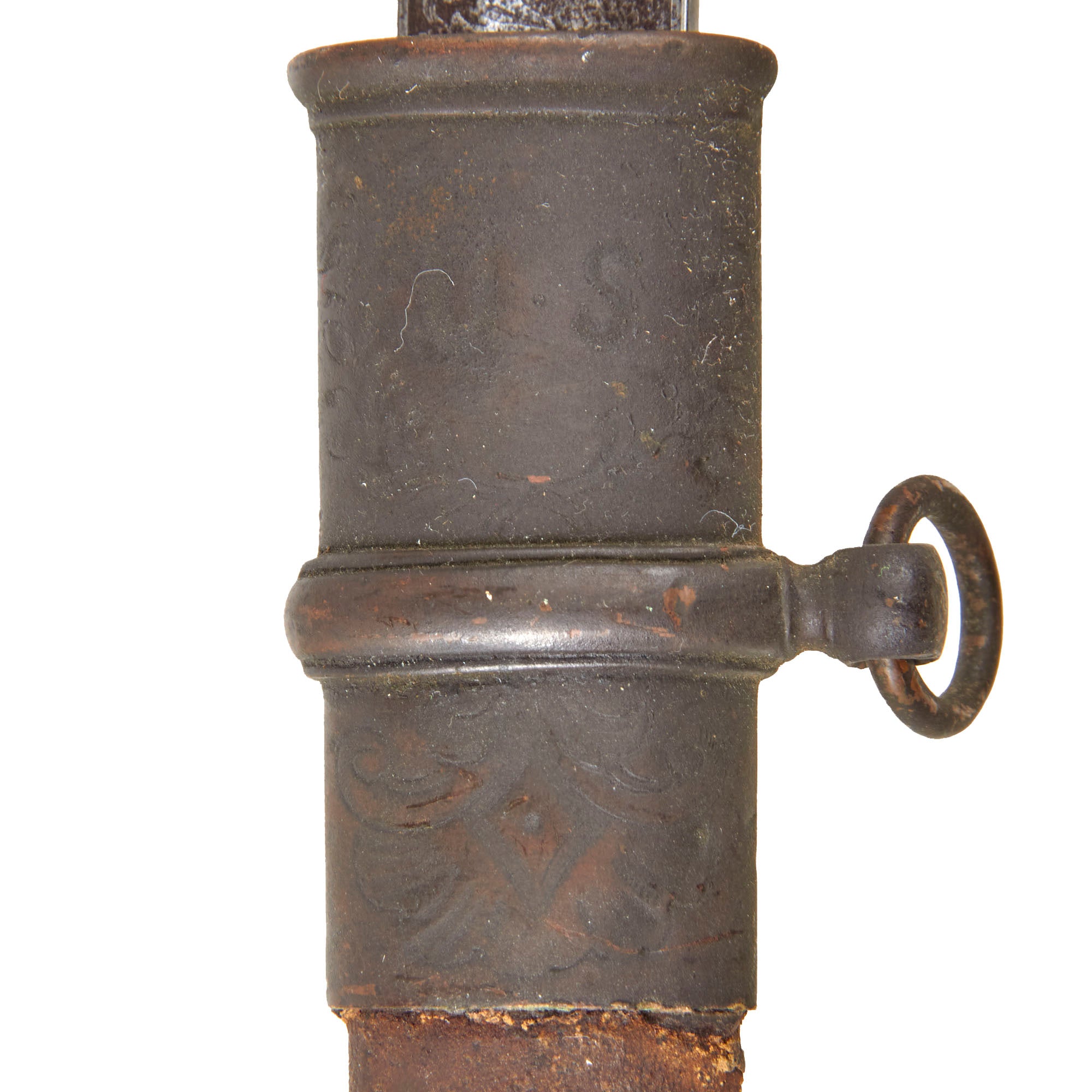 The sword comes complete in its original iron scabbard, which did at one point have leather covering the crude iron shell, but the leather is now entirely worn away. The mounts have also lost all of their gilt finish, and there is a bit of denting to the body. The mounts have gorgeous engraving on both sides with US etched on one side of the throat, but they are a bit hard to see now. Also, the wooden insert pieces which allowed for the sword to fit tightly are now disconnected and many will fall out of the scabbard if held upside down. This is to be expected for a sword in this condition.