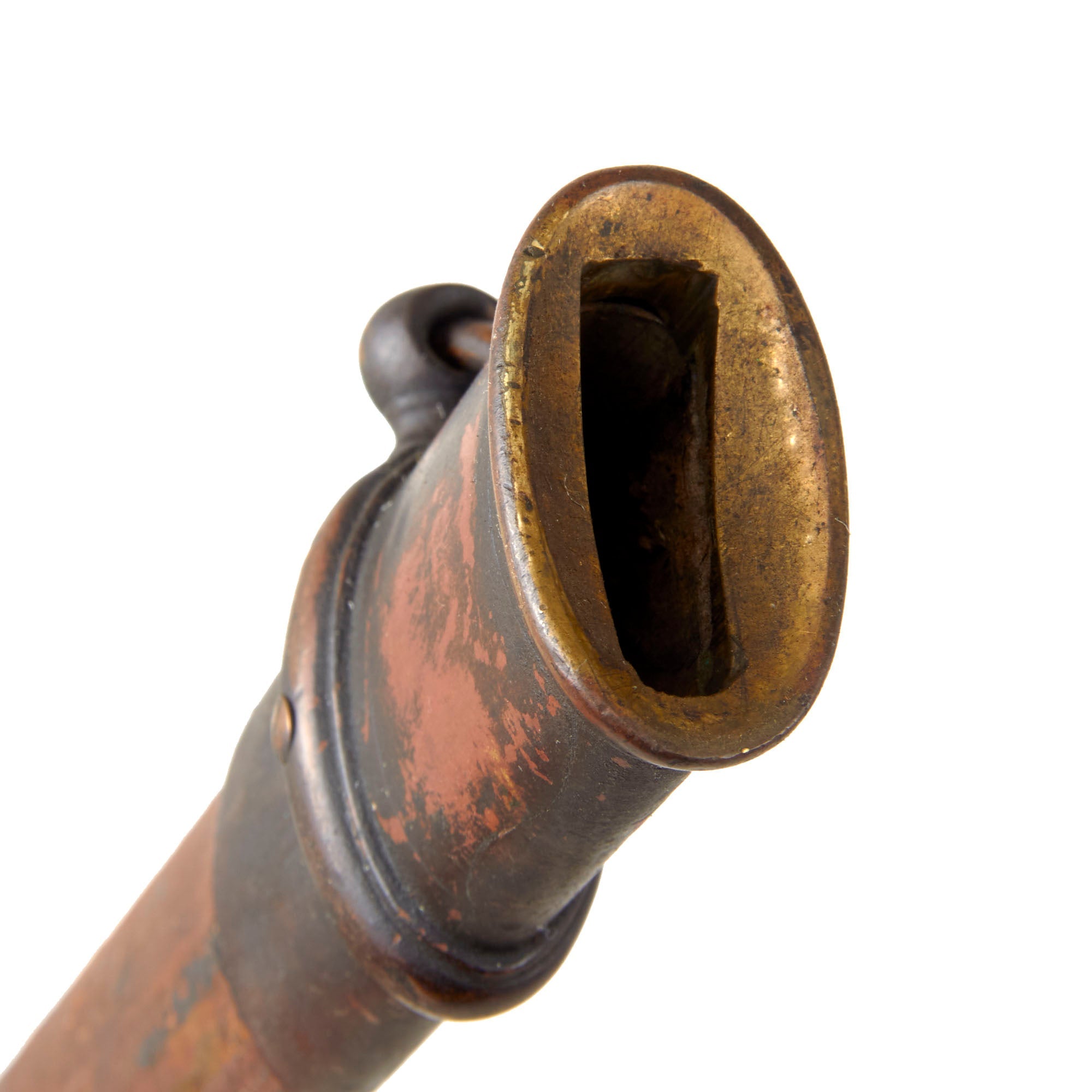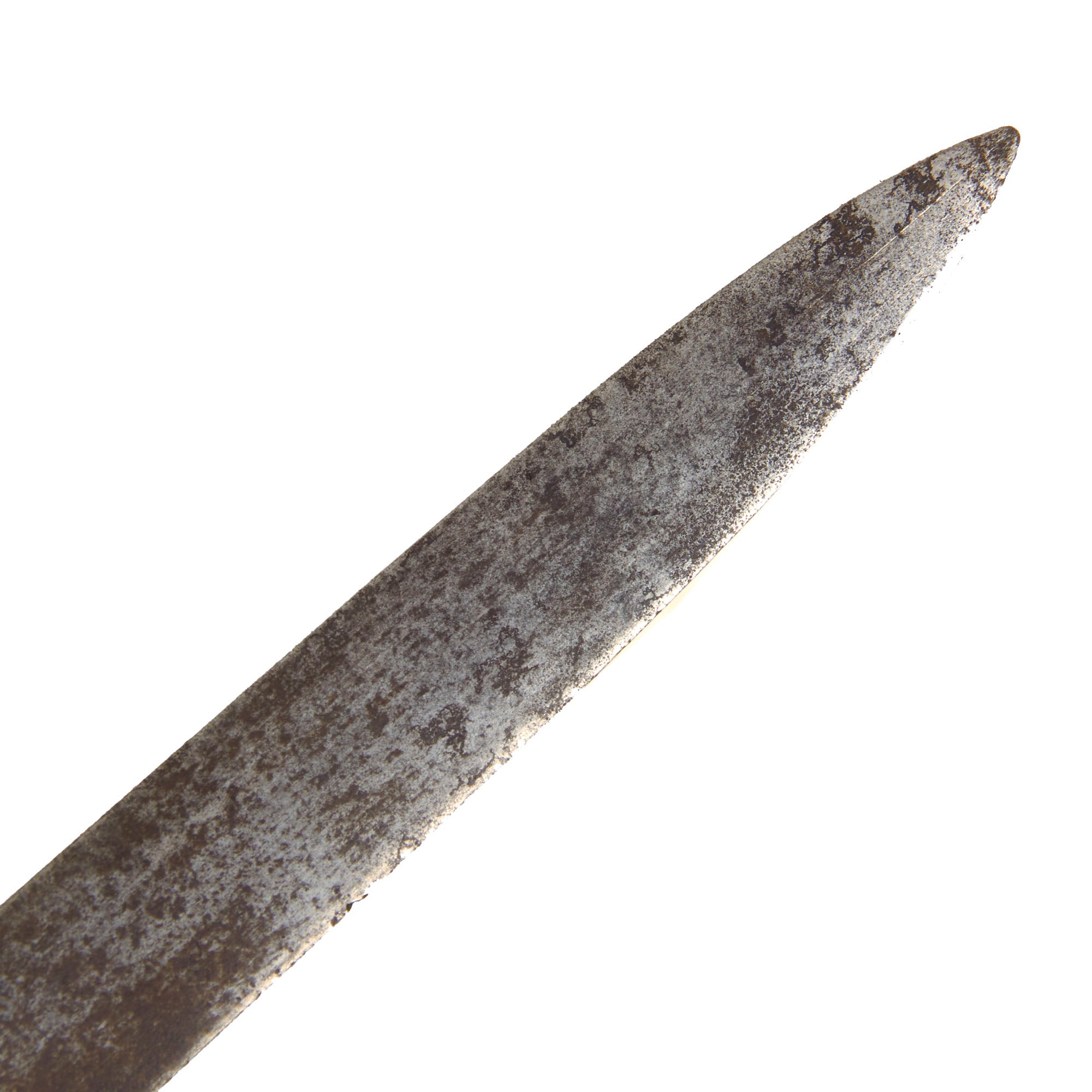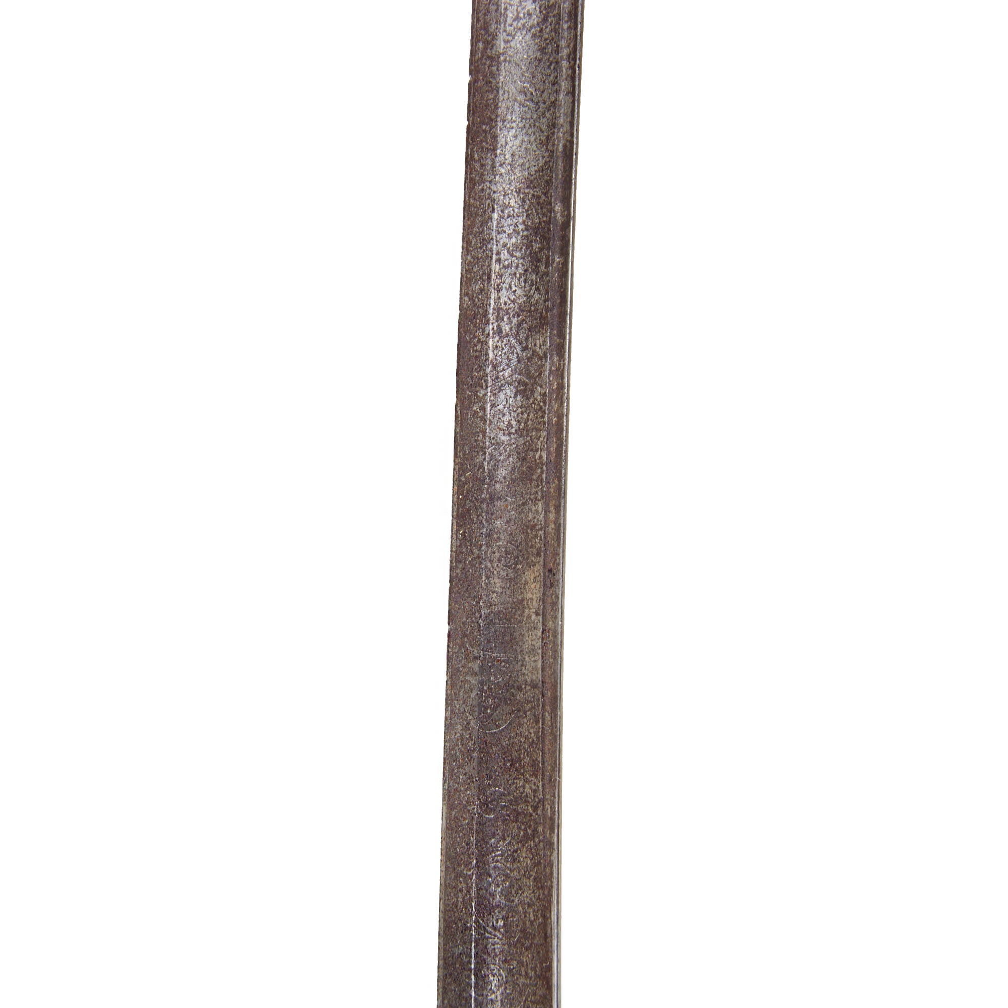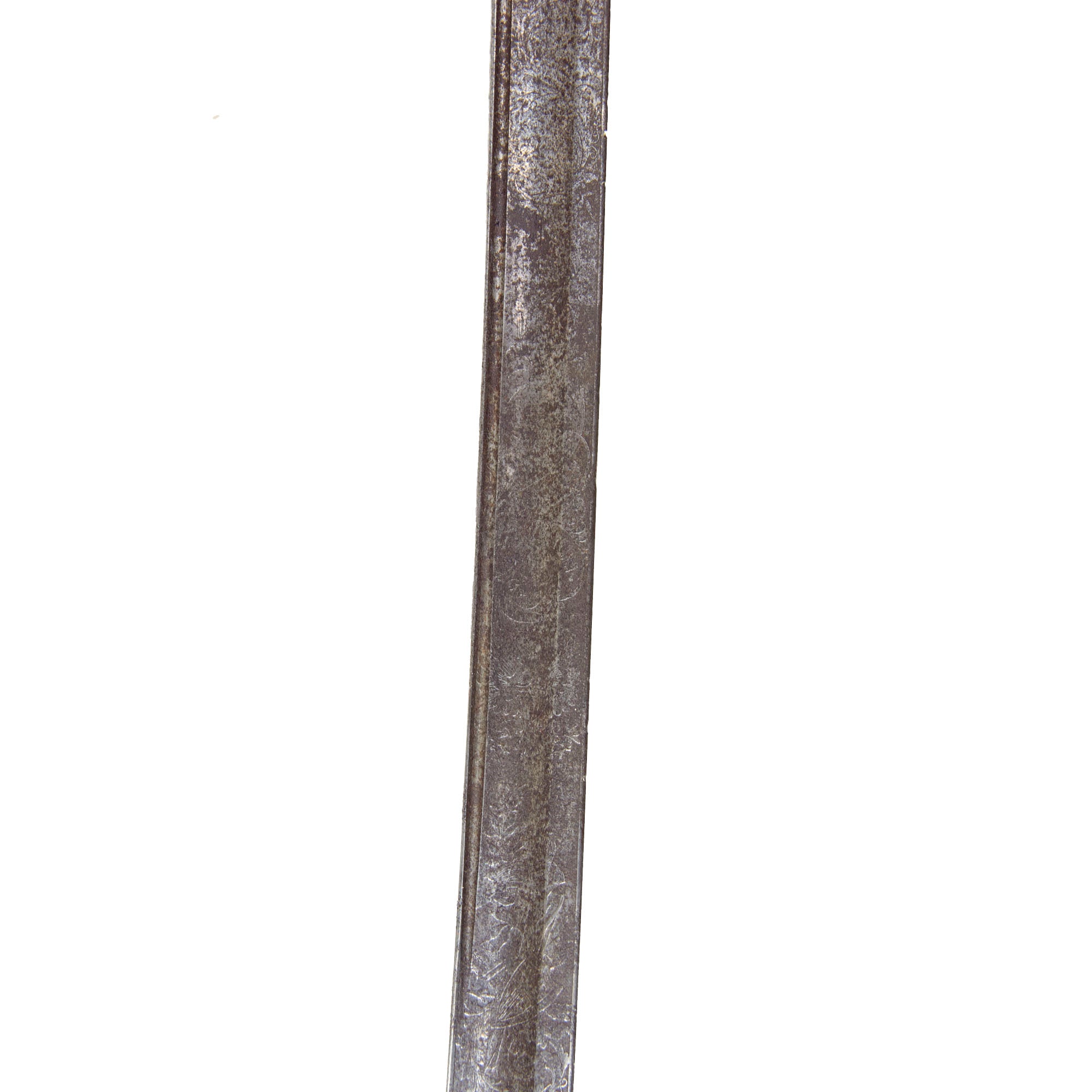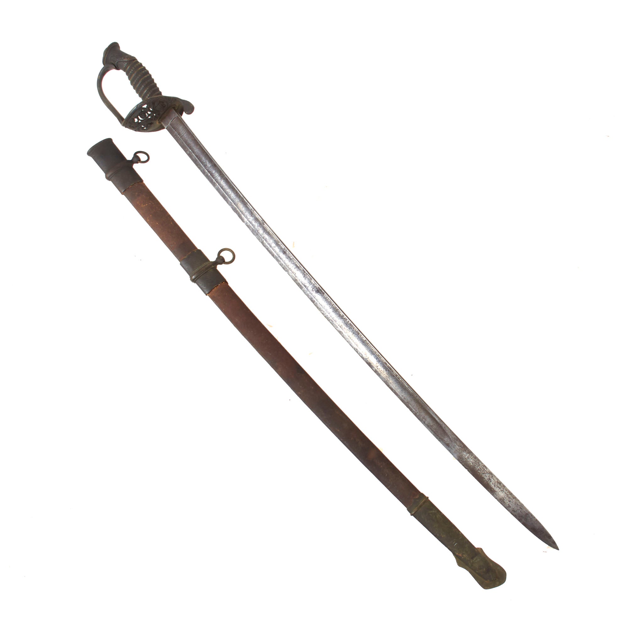 The sword comes complete in its original iron scabbard, which did at one point have leather covering the crude iron shell, but the leather is now entirely worn away. The mounts have also lost all of their gilt finish, and there is a bit of denting to the body. The mounts have gorgeous engraving on both sides with US etched on one side of the throat, but they are a bit hard to see now. Also, the wooden insert pieces which allowed for the sword to fit tightly are now disconnected and many will fall out of the scabbard if held upside down. This is to be expected for a sword in this condition.