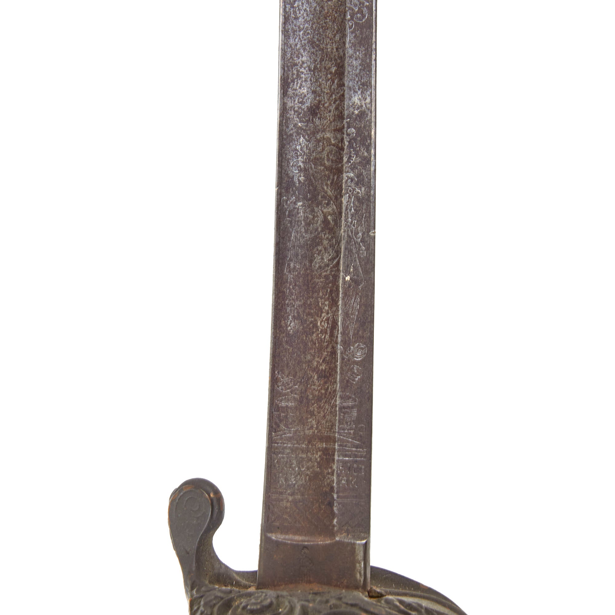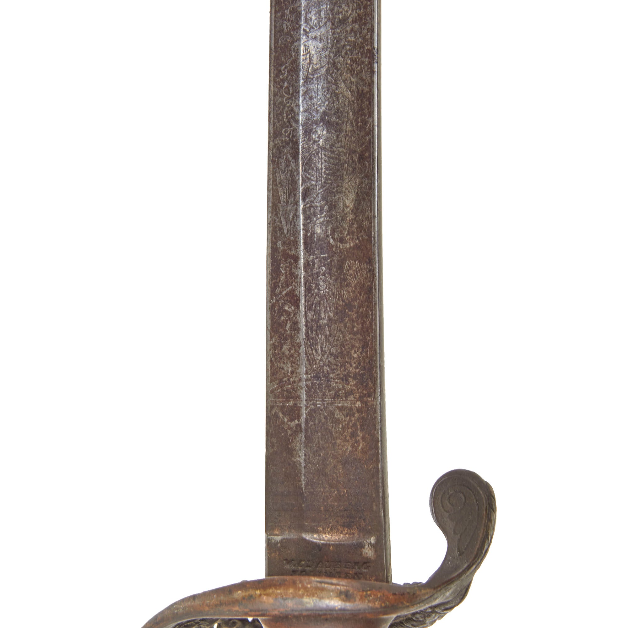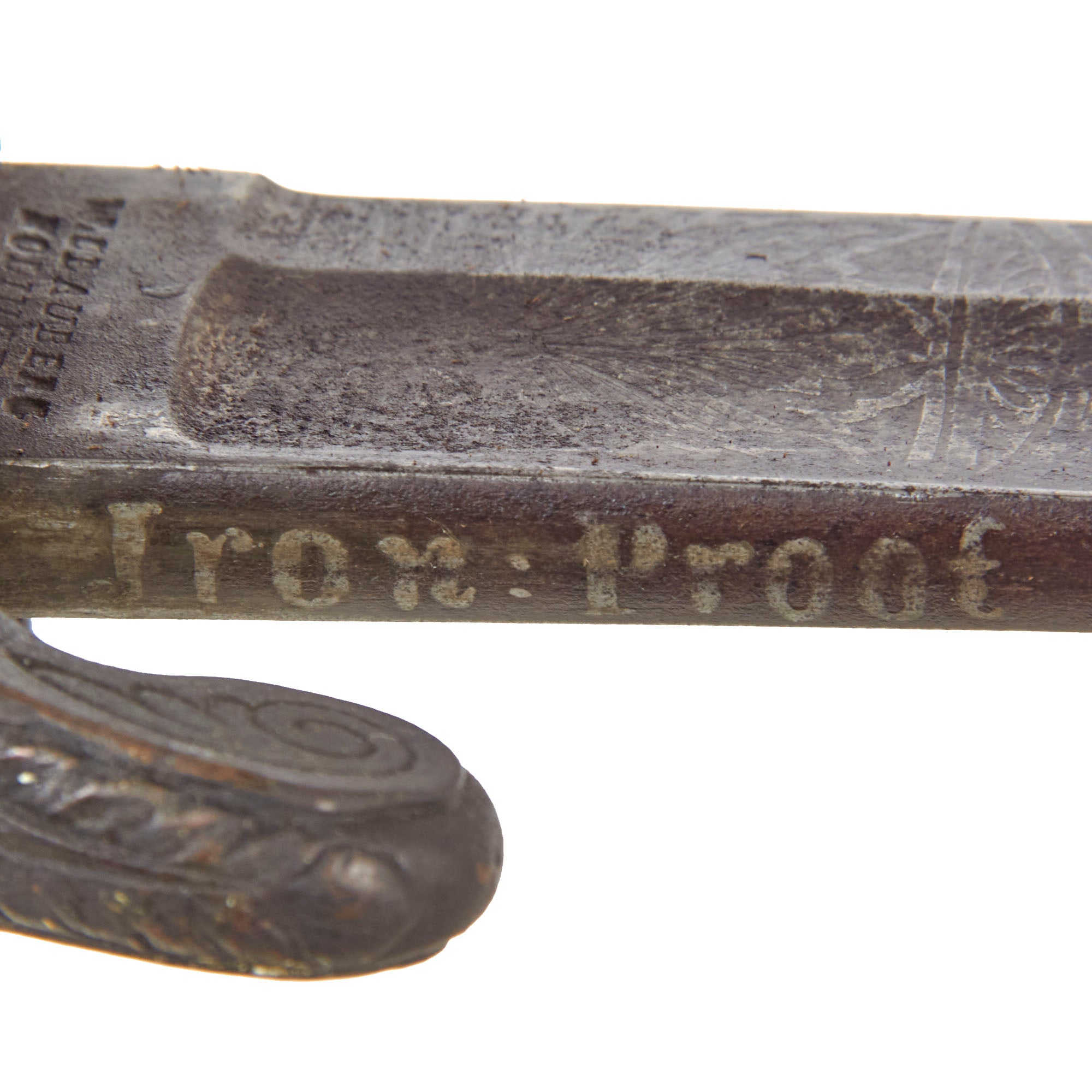 The slightly curved blade of 32 inches is in good shape, with some lovely etching on the lower two thirds, with glorious patriotic motifs that are now heavily oxidized and difficult to discern. The blade has a heavily aged dark patina and some signs of rust. The etching is still mostly present, but it must be viewed in the light to visualize it completely. It is marked in the etching near the ricasso: