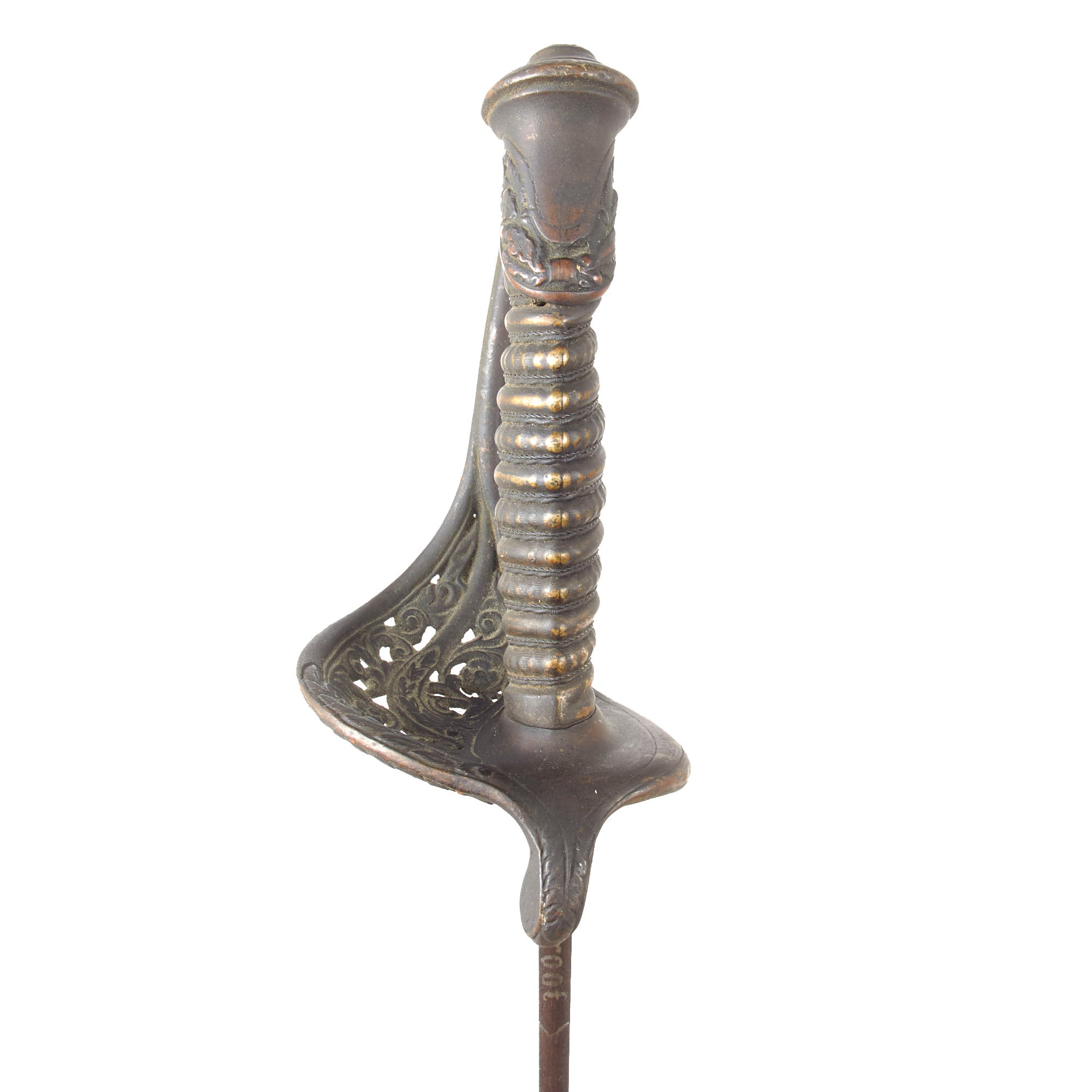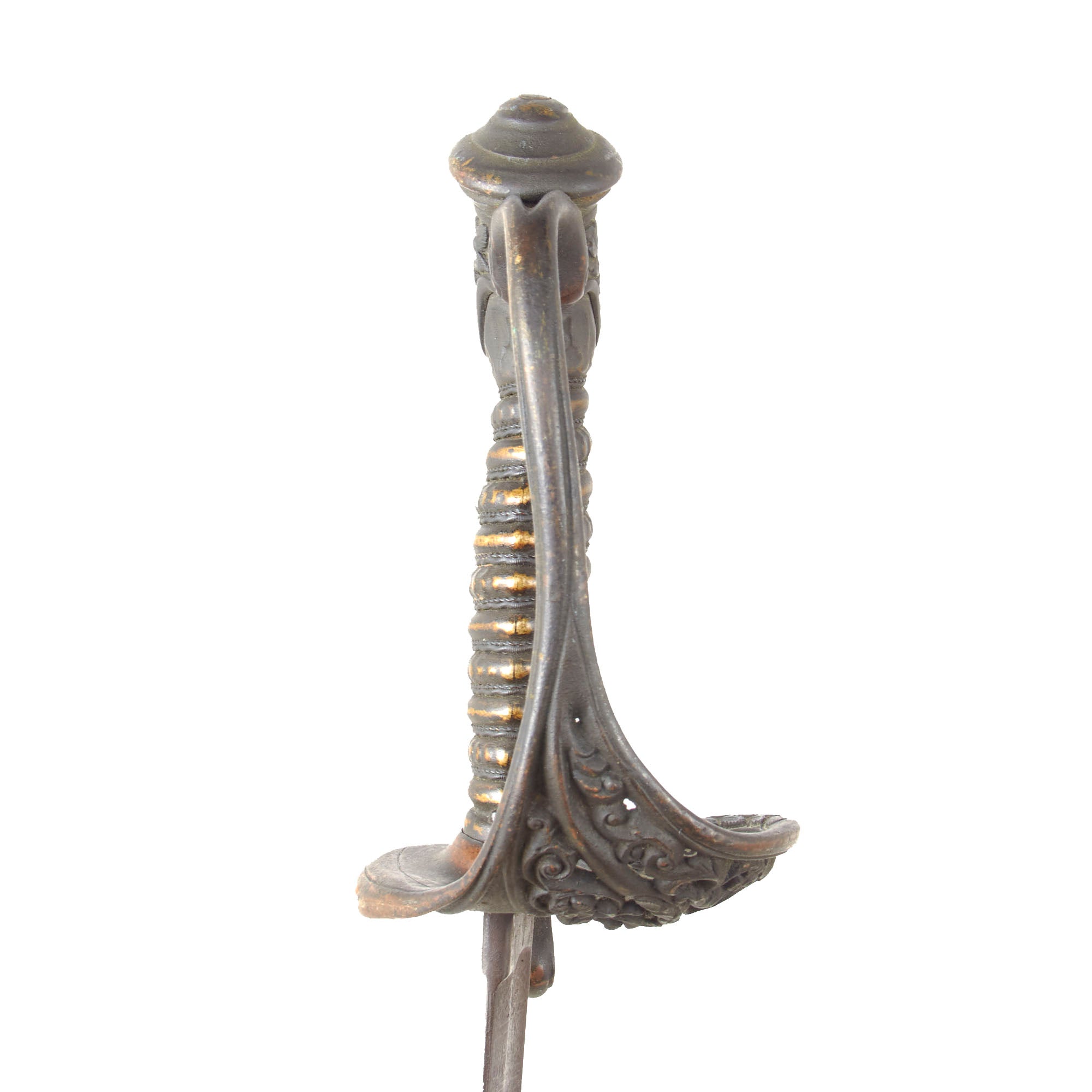 The perforated hilt guard is in very good condition, but any remnant of the gilt finish wore away long ago. The grip is wrapped in leather bound with twisted brass wire, which is still tight and now has a lovely aged patina. The blade, grip, and guard, have a slight wobble. The brass guard and pommel have developed a very pleasant rich patina over the years.