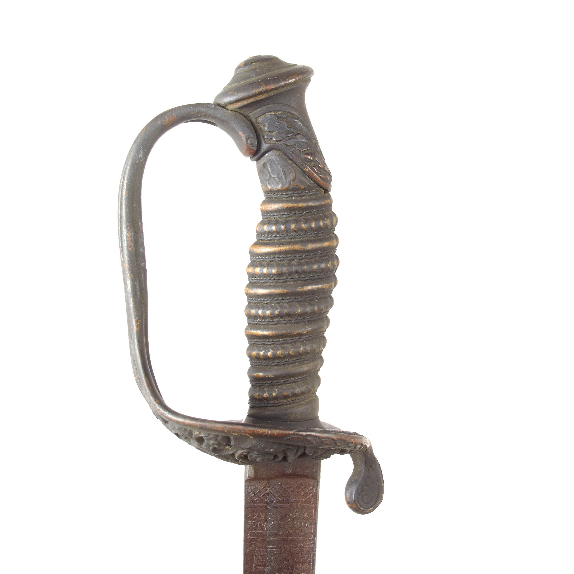 This is a lovely model 1850 Foot Officer’s Sword with half basket brass hilt decorated with pierced floral decorations, and a custom ordered etched blade. As used by all officers below the rank of major between 1851-1865. This sword was used by both Union and Confederate officers during the American Civil War.