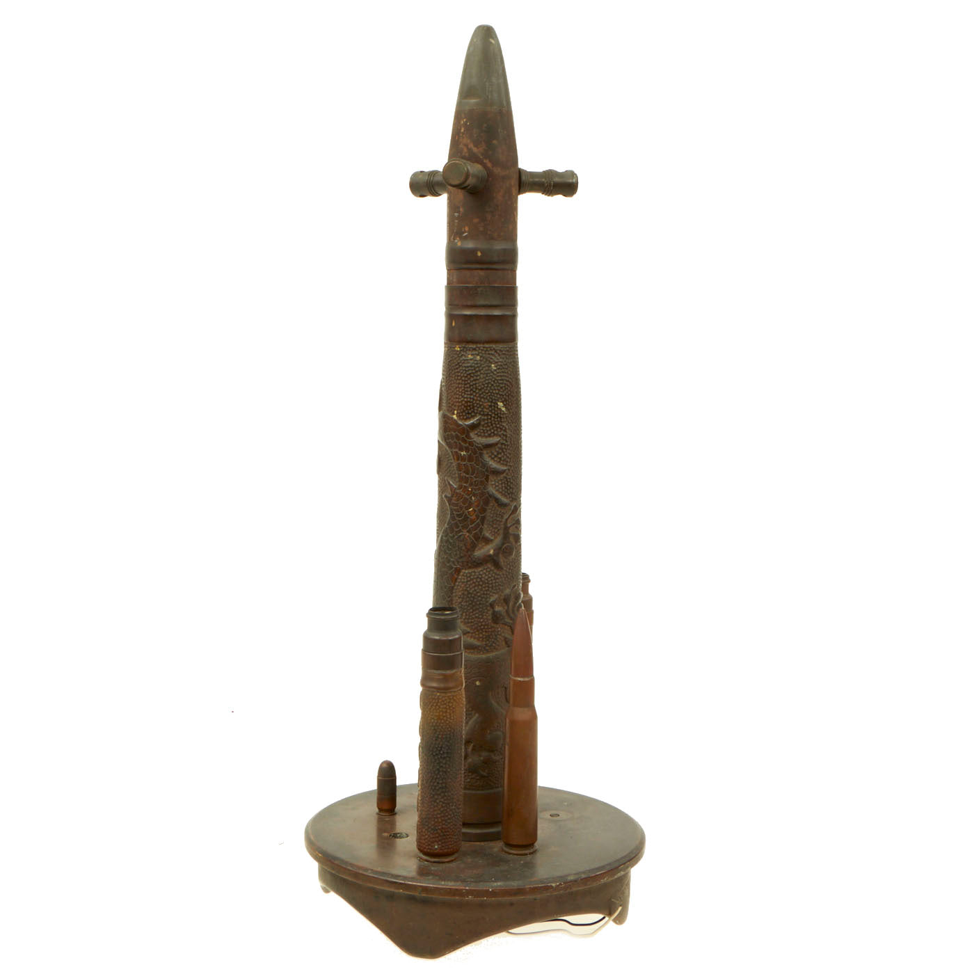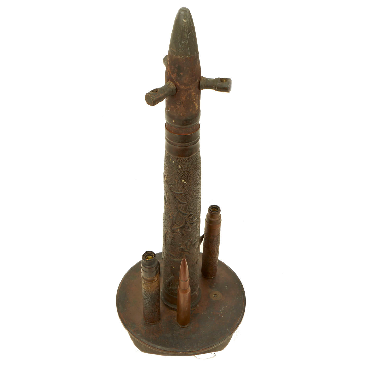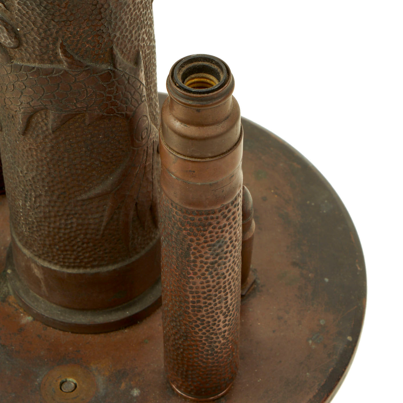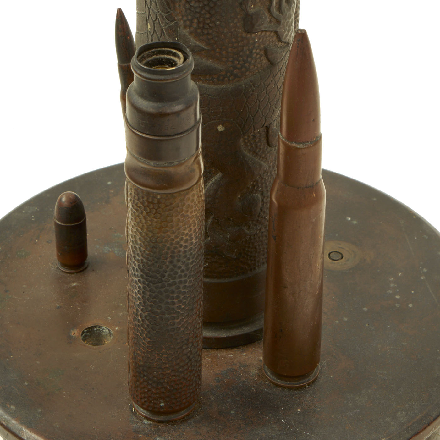 This lamp is a testament to the increased access of tools needed for more elaborate trench art items. This lamp features a very nice brass base plate, which is made from the bottom of a very large artillery shell casing, and there are 6 shells / inert cartridges attached to it. At the center is a 40mm Mk1 Mod-3 BOFORS round with a beautiful Dragon image embossed into the brass casing. The round itself is completely inert and cannot be rendered “live” again. Also featured on the lamp are two 20mm Mk2 shell casings which were used to hold the lamp bulbs. On the left shell the word “PEARL” can be seen impressed on the casing and is read vertically. The right shell casing the word “HARBOR” can be found impressed vertically on it as well.