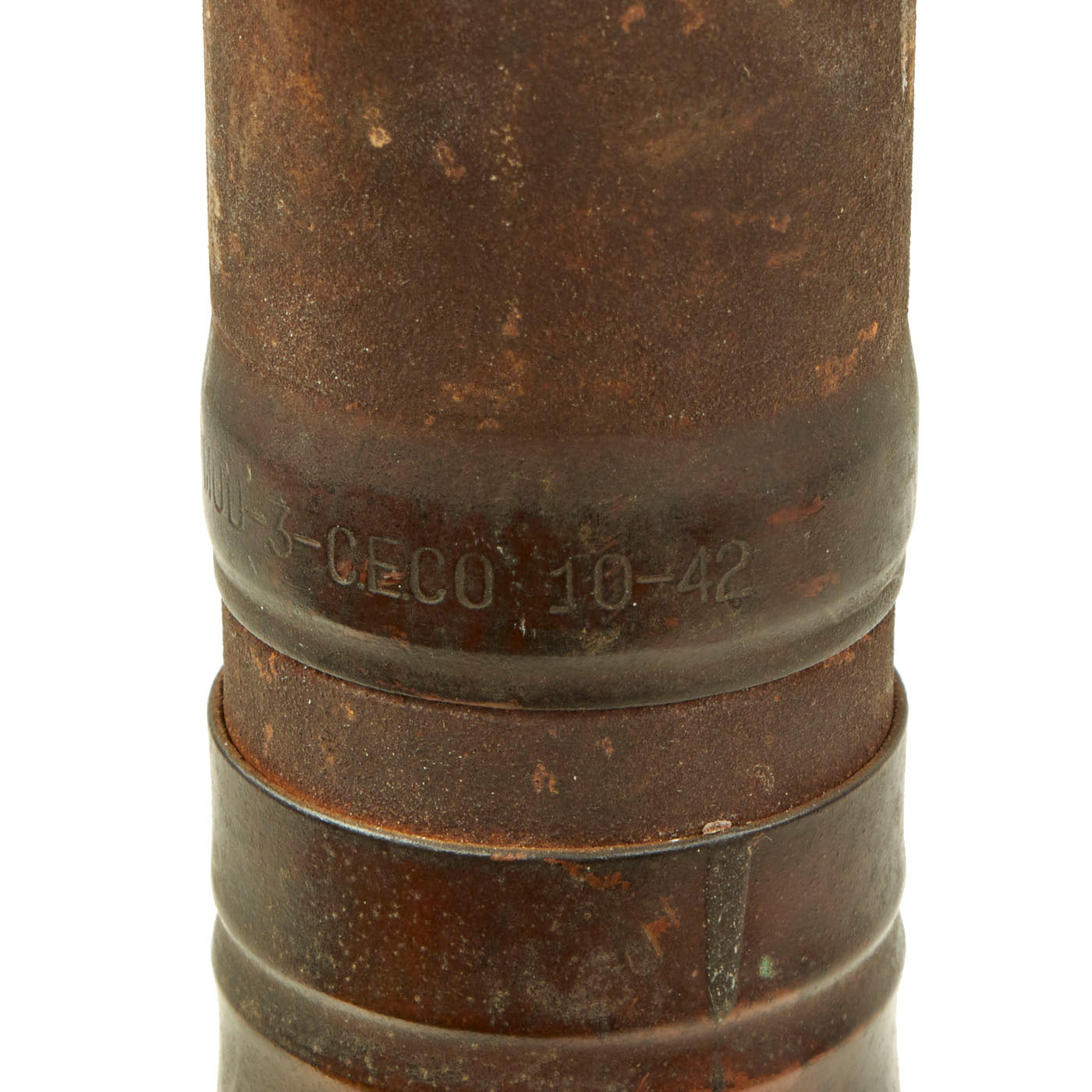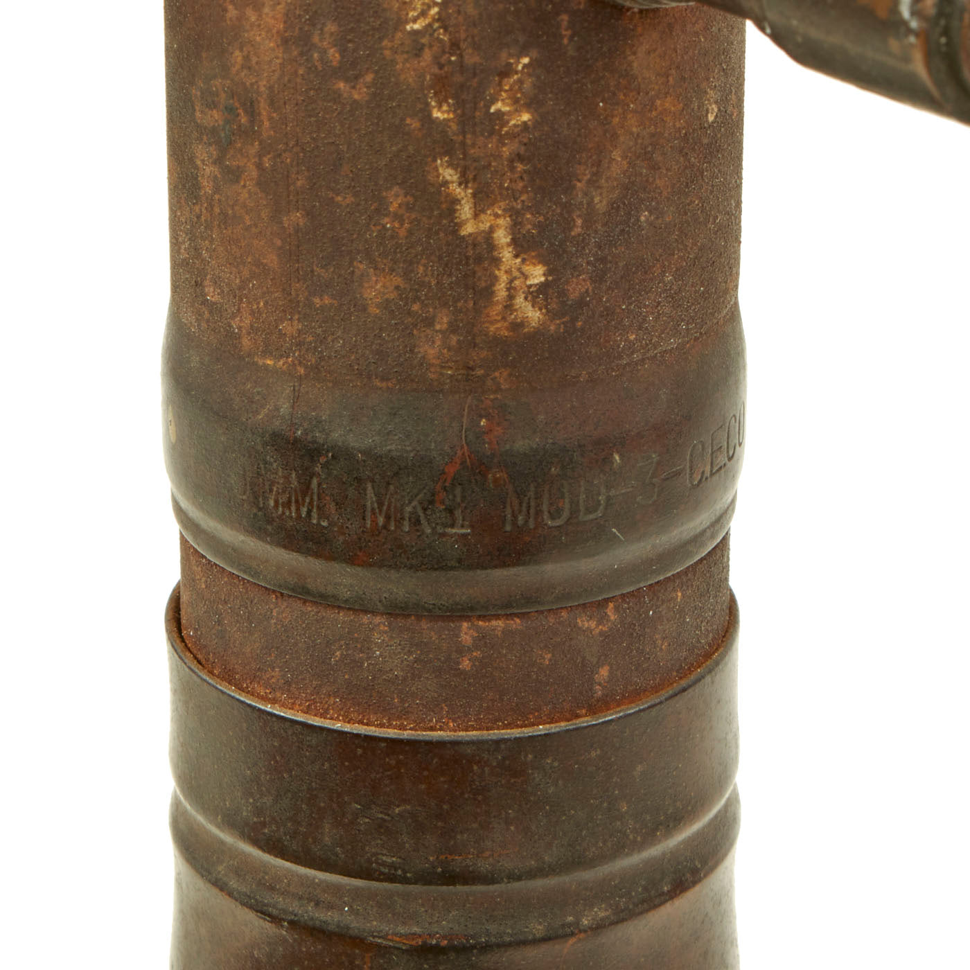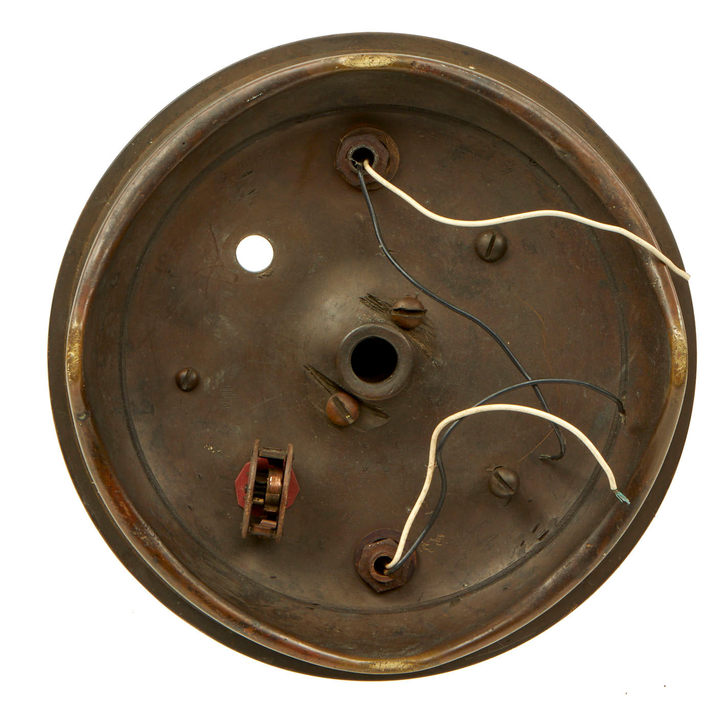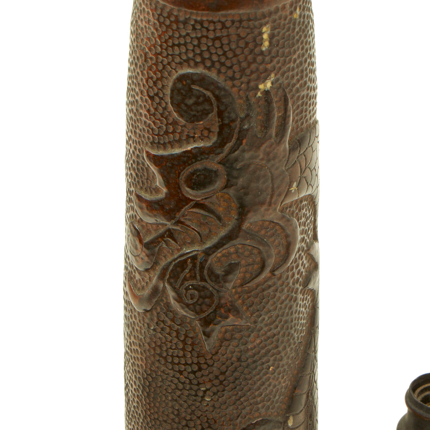 This lamp is a testament to the increased access of tools needed for more elaborate trench art items. This lamp features a very nice brass base plate, which is made from the bottom of a very large artillery shell casing, and there are 6 shells / inert cartridges attached to it. At the center is a 40mm Mk1 Mod-3 BOFORS round with a beautiful Dragon image embossed into the brass casing. The round itself is completely inert and cannot be rendered “live” again. Also featured on the lamp are two 20mm Mk2 shell casings which were used to hold the lamp bulbs. On the left shell the word “PEARL” can be seen impressed on the casing and is read vertically. The right shell casing the word “HARBOR” can be found impressed vertically on it as well.