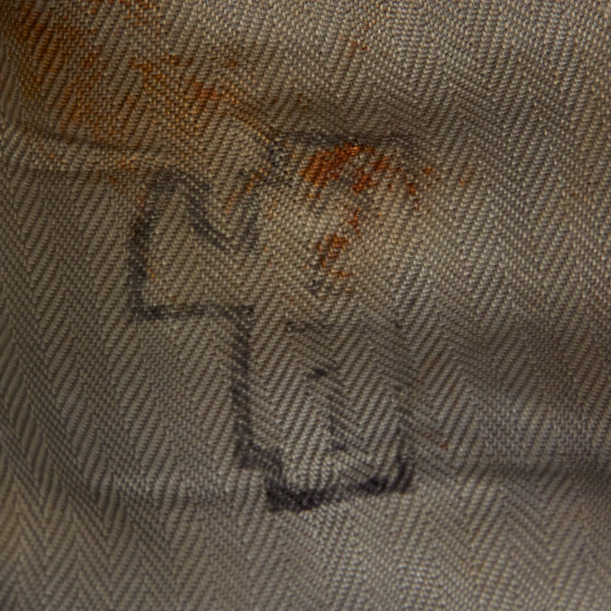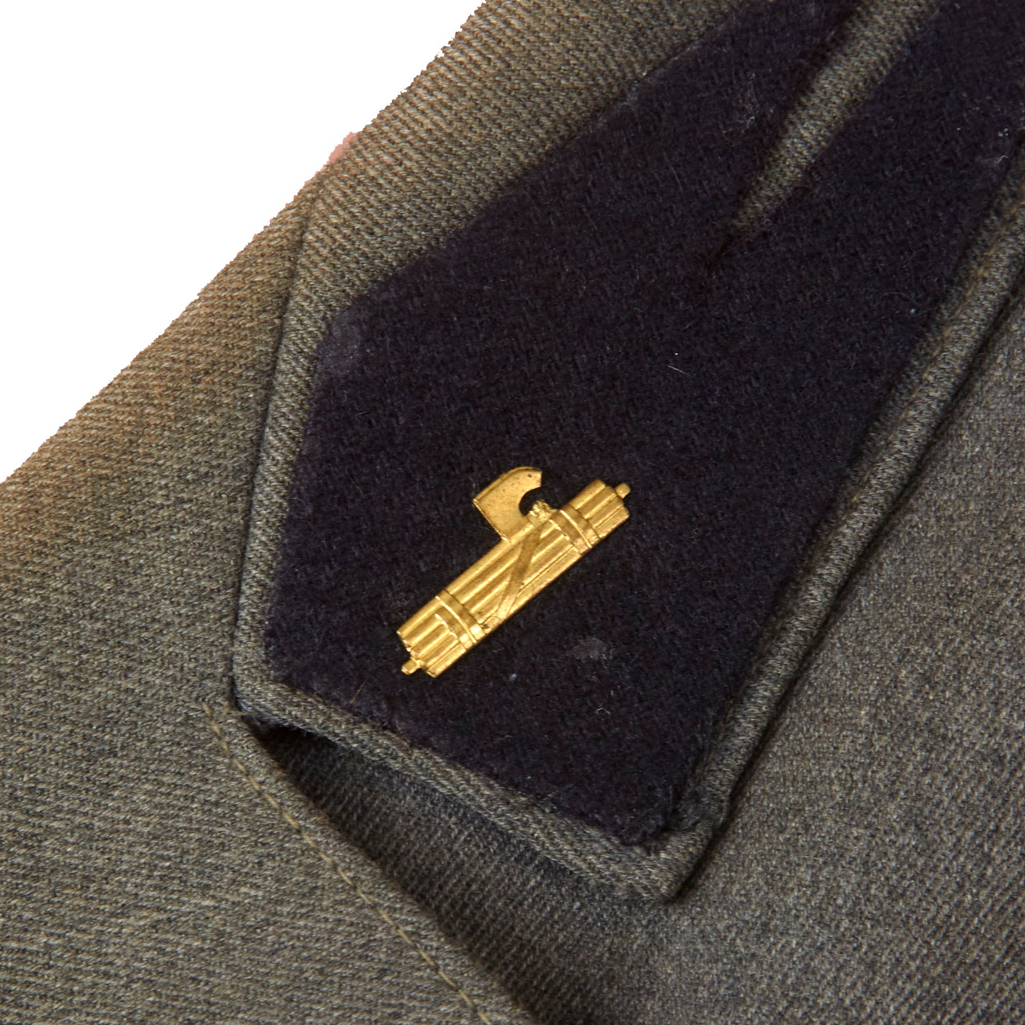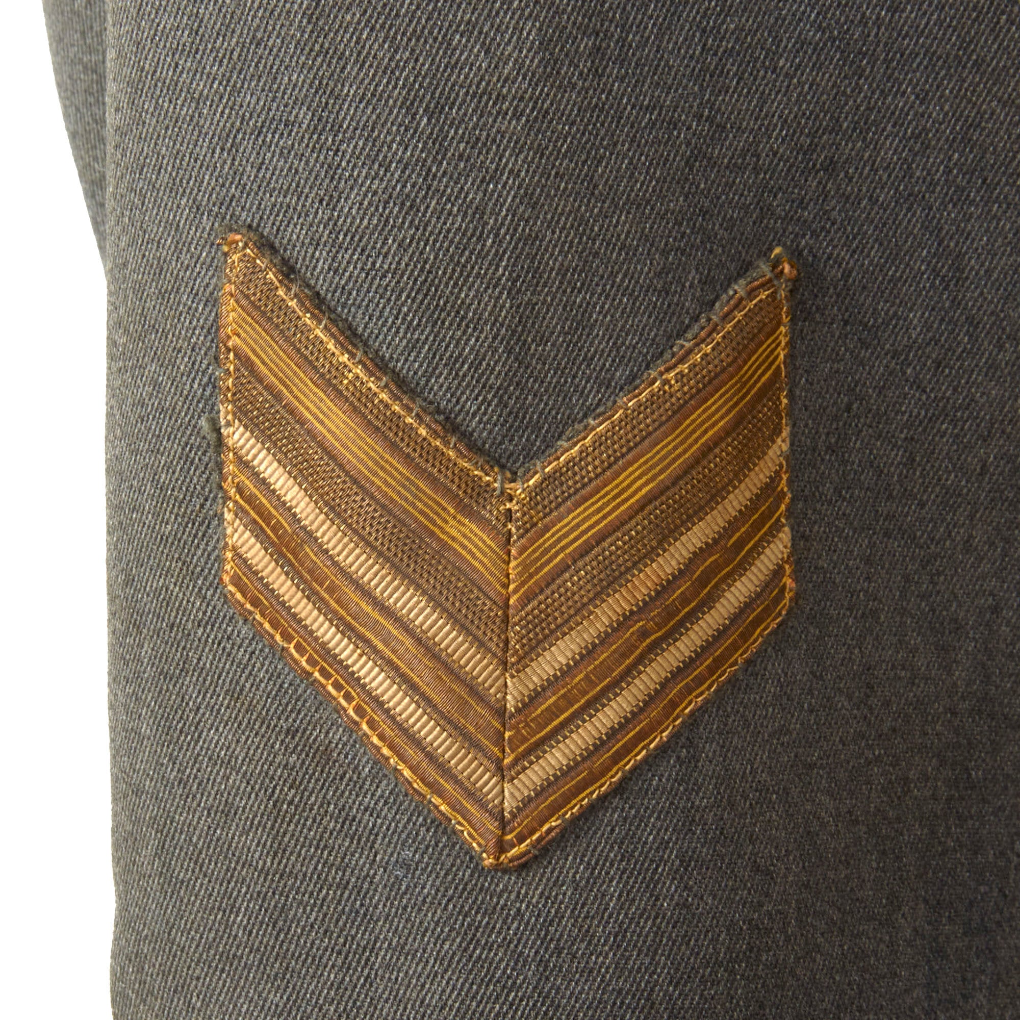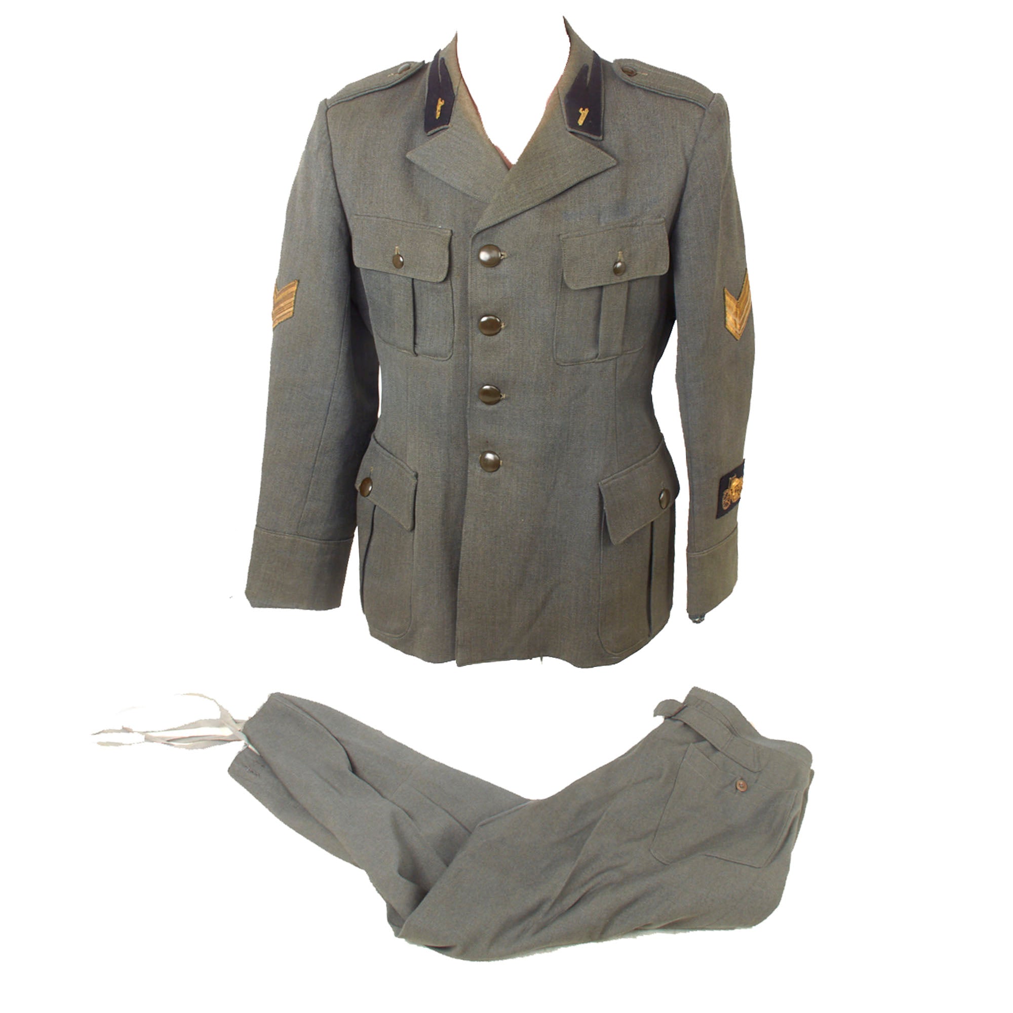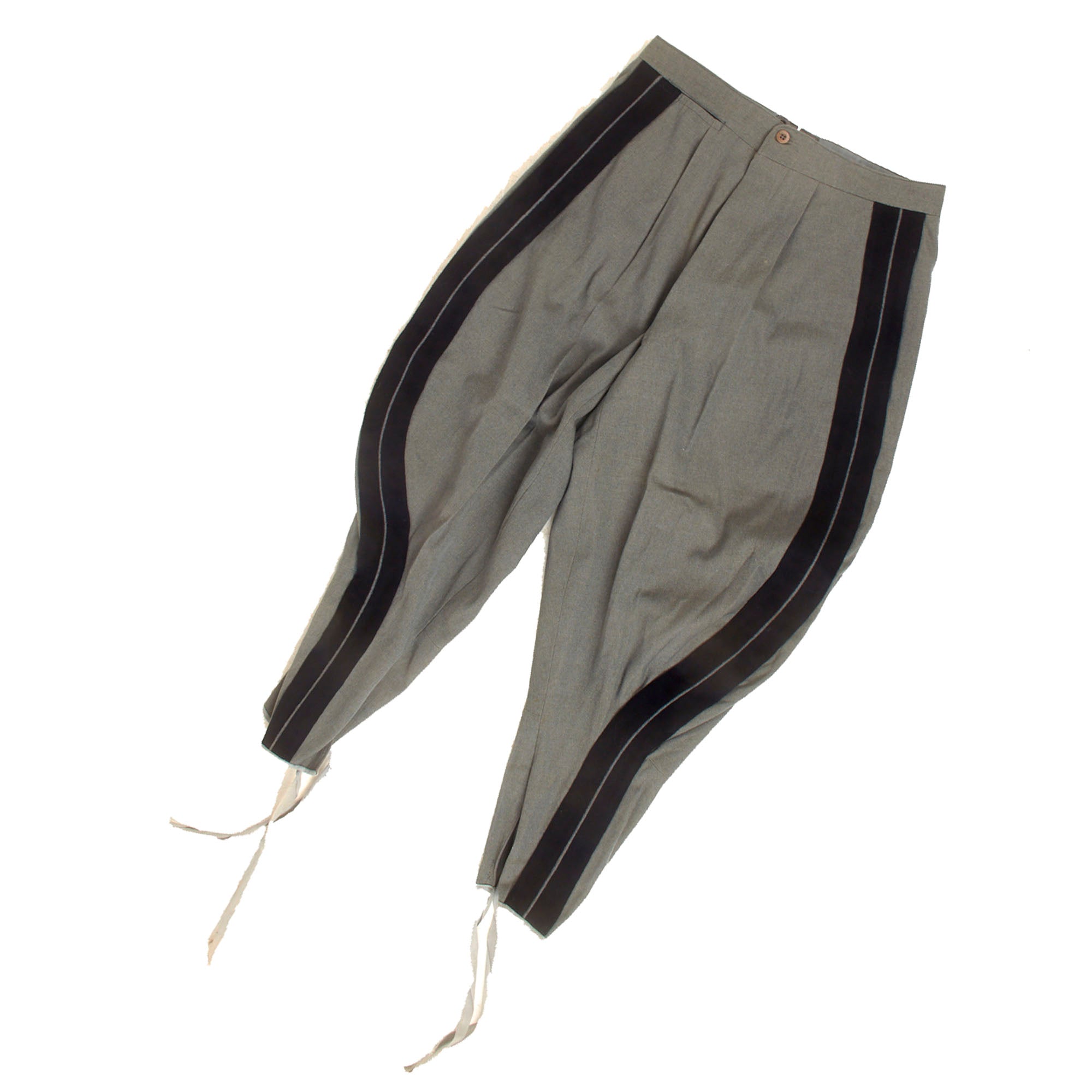 This denotes the unit of the MVSN and the date of manufacture, 1943. The "A.XXI" after the date is the roman numeral for 21, as it was the 21st year of the rule of dictator Benito Mussolini, which began in 1922. The trousers are in similar condition with two black stripes going down on each side.
